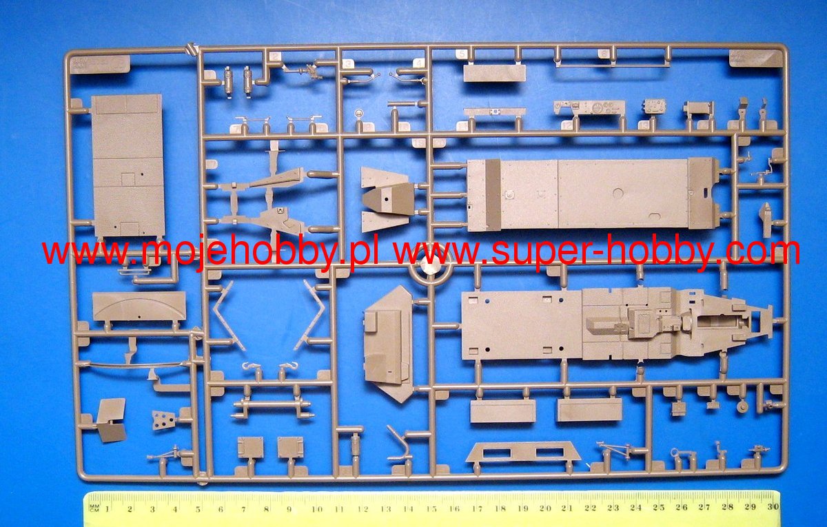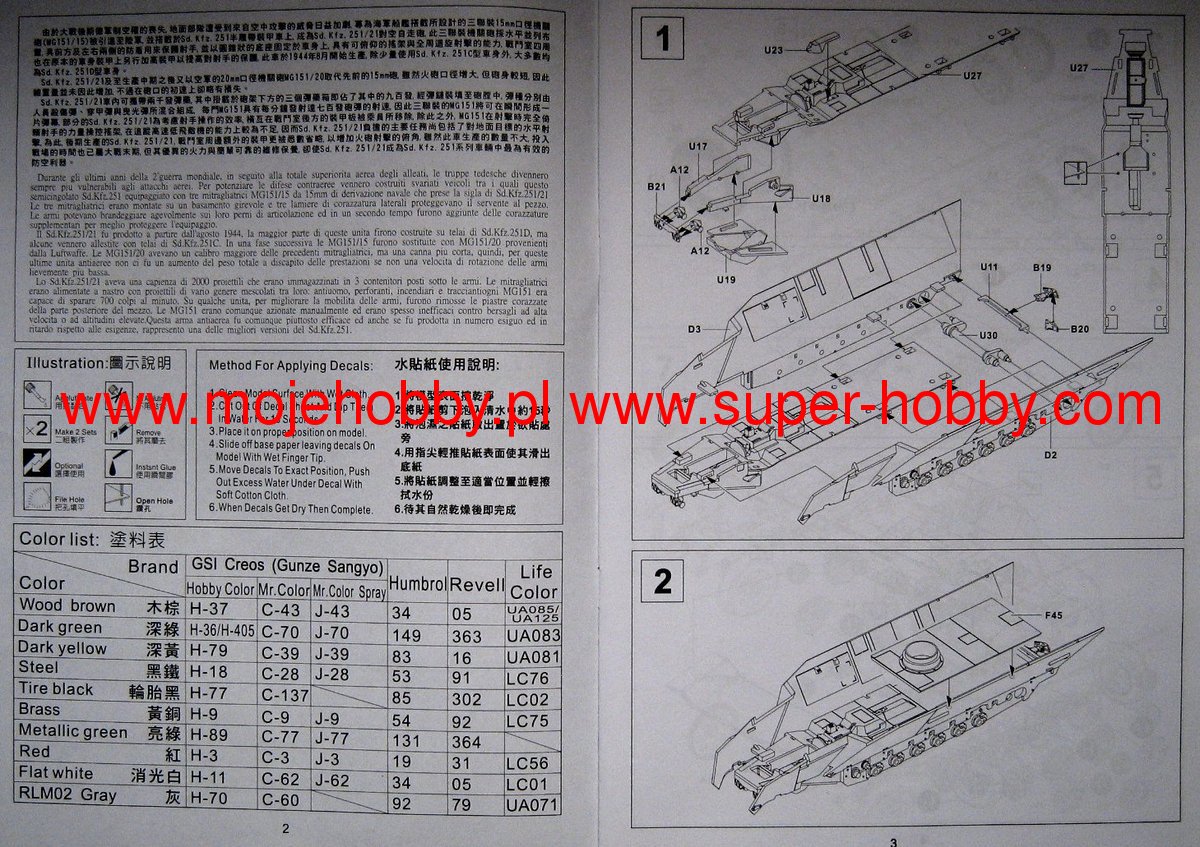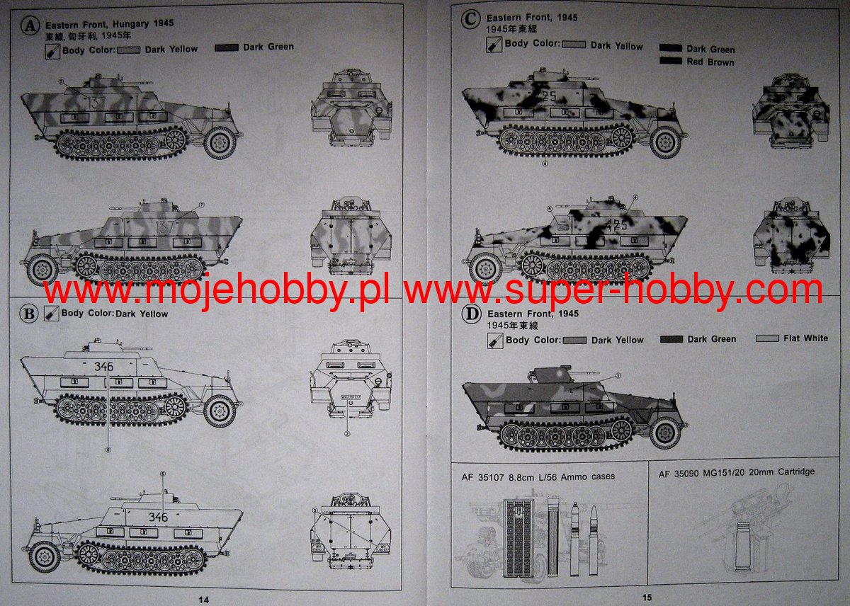 Sd.Kfz 251 was a German, medium, half-track armored transport from the Second World War. The first prototypes of the vehicle were made in 1935, and serial production continued in 1939-1945, ending with the production of about 14,500 units. The Sd.Kfz 251 was powered by a six-cylinder engine Maybach HL 42 TURKM with 100 hp . Sd.Kfz 251 was developed as a new, basic half-tracked transporter of the German armed forces. Its design was based on the Sd.Kfz.11 heavy tractor, with several elements changed in the adapted chassis: a new fuel tank was added, the location of the steering wheel, and the exhaust system was redesigned. In the course of serial production, four basic versions of the Sd.Kfz 251 (Ausf. A, B, C and D) were created, however, in terms of details related to the production process (especially the C version) and a slightly different arrangement of elements inside the fuselage. During World War II, more than 20 variants and versions of the Sd.Kfz 251 were created. The chronological first was the Sd.Kfz 251/1, which was the basic version, armed with two MG34 or MG42 machine guns and capable of carrying up to 10 landing troops. In 1941, a version of the Sd.Kfz 251/2 was developed, armed with an 80 mm mortar. There was also a version of the Sd.Kfz 251/3, which was a communication and radio communication vehicle with various sets of radio stations and antennas. In 1942, the Sd.Kfz 251/9 Stummel variant was developed, armed with a 75mm StuK 37 short-barrel gun. More interesting versions were the Sd.Kfz 251/16 with two flamethrowers or the Sd.Kfz 251/20 UHU equipped with an infrared radiation emitter and intended for targeting at night. Cars Sd.Kfz 251 of all versions served primarily in armored divisions and armored grenadiers on virtually all fronts of World War II: from the September campaign (1939), through the campaign in France (1940), fighting in the Balkans and North Africa (1941-1943) after fights on the Eastern (1941-1945) and Western (1944-1945) fronts.