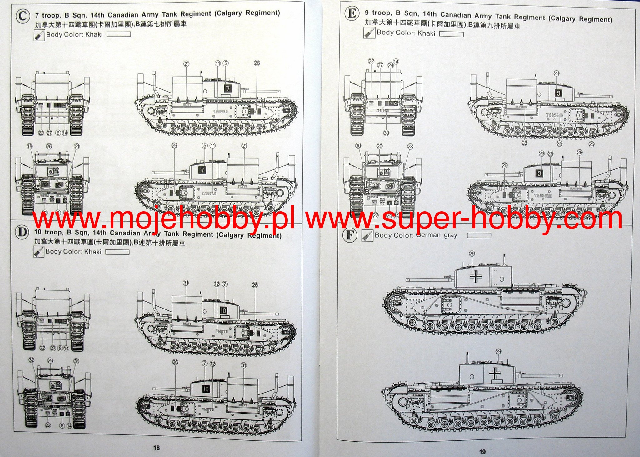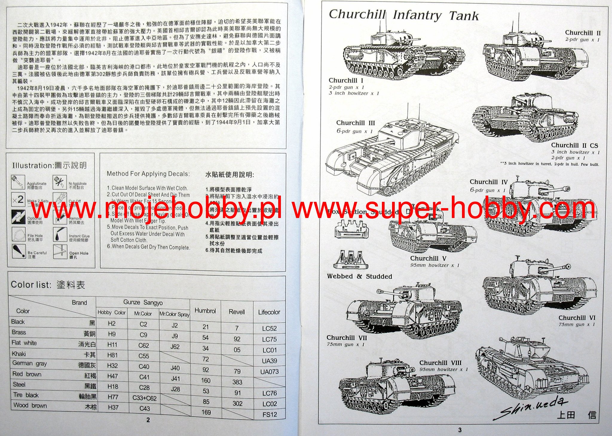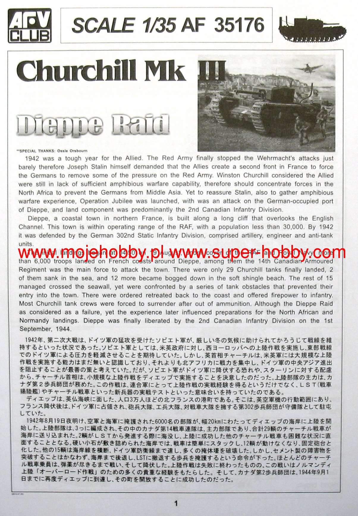 Rally on Dieppe (action code name is Operation Jubilee ) was carried out on August 19, 1942. On the Allied side, about 6,000 people participated in it, mainly from the Canadian 2nd Infantry Division and British commando units. On the German side, about 1,500 soldiers took part in the operation, mainly from the 302nd Infantry Division. It is worth adding that the above estimates for both sides do not include sailors and airmen involved in the fighting. Often, it is assumed that the Dieppe raid was for political rather than military reasons. On the one hand, it was to show the will of Great Britain to fight, and on the other hand, it was to show the American side the total unreality of a large-scale landing plan in Europe in 1942. From the military side, it was to test some landing techniques in practice and to identify the fortifications of the Atlantic Wall. The plan of the operation assumed the capture of the city and the port of Dieppe, the destruction of the port facilities there, the capture of the prisoners and the withdrawal of the Allied troops to the British Isles. While the operations on the left flank of the invasion forces were fairly efficient and with low losses, the situation on the right flank was catastrophic, before the Allied troops disembarked! The element of surprise completely failed, only about 30-35% of the landing ships reached the beaches, and the German troops inflicted very high losses on the landing parties. As a result, as early as 11.00 am, the commander of the operation, General Roberts, gave the order to retreat. The entire operation ended in a disgraceful defeat of the Allied forces, which lost about 3,500-4,000 people and about 100 RAF planes out of about 6,000 soldiers taking part in the operation. It is worth adding that these losses were incurred within just a dozen or so hours of the operation being carried out! The German side lost about 600 killed and wounded.The Churchill A22 was a British heavy infantry tank of the Second World War. The first prototypes were built in 1940, and serial production was carried out in the period 1941-1945. In total, about 7,400 copies of this tank of all versions were produced, which makes it one of the most produced British tanks during the Second World War. Churchill it was powered by an engine Bedford 350 hp. The armament of the vehicle is - depending on the version - a single 40mm, 57mm or 75mm cannon or a 95mm howitzer and two 7.92mm Besa machine guns. Tank Churchill was constructed on the basis of a modified design of the A20 tank, which was built before 1939. Due to the huge losses in equipment suffered by the British army in the French campaign in 1940, the new vehicle was quickly put into mass production. It turned out to be a big mistake, because the first versions of the tank Churchill were underdeveloped, emergency and not very friendly to their crews. However, by 1942 most of the tank's defects revealed in the course of its operation had been removed and it turned out that the Churchill was quite a successful design. It had strong armor, good ability to overcome terrain obstacles and a low silhouette that facilitated the camouflage of the car. The disadvantages were poor armament and low top speed - only 13 km / h in the field! A dozen or so versions of this tank were made in the course of serial production. Chronologically, the first was the Churchill I, armed with a 2-pounder 40 mm gun in the turret and 76.2 mm howitzer in the hull of the vehicle - but it was highly underdeveloped and had a high failure rate. Churchill III soon followed - it had only the new 57mm ROQF 6-pounder gun in the turret and better armor. The version IV was very similar to version III - the most widely produced version, differing only in the method of turret production. Another major change came with the Churchill VII version, which received a 75mm main gun and clearly reinforced frontal armor. There was also a version VIII with the main armament of the 95 mm caliber howitzer in the turret. Specialized versions of Churchill also appeared. One of the more interesting ones is the Churchill AVRE, armed with a powerful 290 mm Petard mortar and designed to destroy enemy fortifications, or the Churchill Crocodile with a flamethrower at the front of the hull. Churchill tanks were sent to the USSR as part of the Lend-and-Lease program, and they were also used by the Canadian army and the Polish Armed Forces in the West (PES).