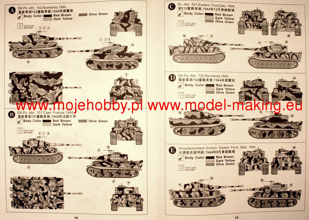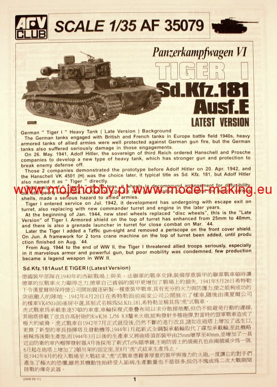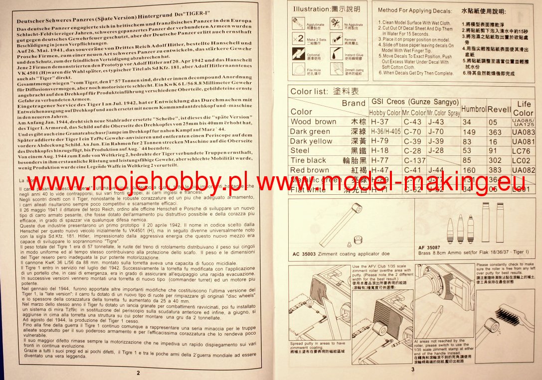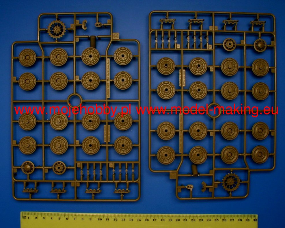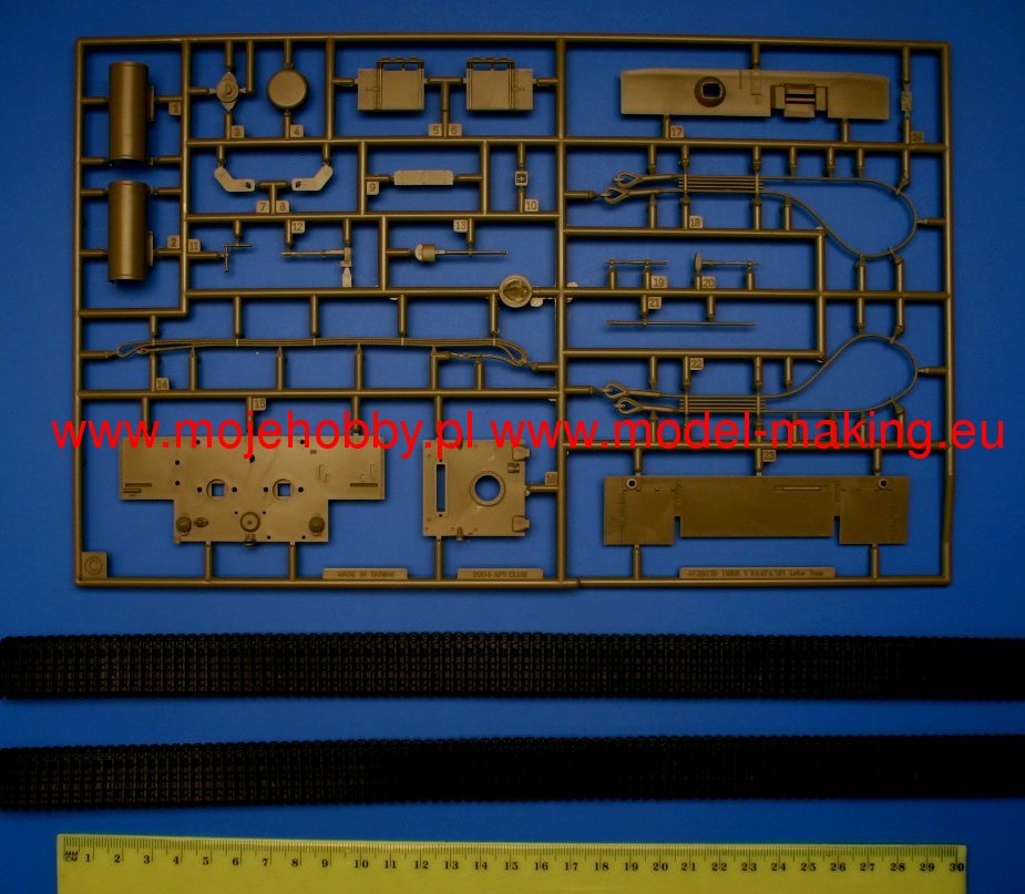 The Pz.Kpfw VI (Sd.Kfz.181) Tiger is a German heavy tank from World War II, one of the most famous combat vehicles of that time. The command of the German Panzerwaffe had the idea of creating a heavy tank from the beginning of the war, but the first attempts in the form of the centuries-old Neubaufahrzeuge tank turned out to be unsuccessful. In 1939 and 1940 they were conducted ineffectively, but after the clash with the T-34 and KW-1 on the eastern front, work on the new heavy tank sped up. On April 20, 1942, the prototype of the new tank, under the designation VK 4501 (H), underwent field trials in the presence of Adolf Hitler and was put into mass production shortly after. The first production versions were designated Pz.Kpfw VI Ausf.H1 (later Ausf.E). In the course of production, in the years 1942-1945, the tank was systematically modified by, for example, adding Feifell dust filters, different placement of headlights, modernization of optical equipment, changes to the commander's turret, etc. The drive was provided by a Maybach HL230 P45 12-cylinder carburetor engine with a capacity of 700 HP. The Pz.Kpfw VI tank, although it did not have such a contoured front hull as the T-34 or Pantera, was a heavily armored vehicle (frontal armor up to 120mm), armed with a very effective KwK 36 L / 56 88mm gun, which earned the reputation of being the most effective tank of the Second World War. It was a vehicle much better than the Allied M4 or Churchill and the Soviet T-34/76. He could also easily fight the IS-2 or M-26, surpassing them with the effectiveness of the main armament. On the other hand, the Pz.Kpfw VI had some disadvantages - first of all, it was extremely time-consuming to produce and had a very complicated suspension. In the later period of the war, the quality of the Tiger's armor also deteriorated, which resulted from the lack of access to the molybdenum deposits by the German economy. Despite these drawbacks, the Tiger on the battlefields proved to be a very effective weapon. He successfully fought in Tunisia, the Kursk Arch, Normandy and on the Eastern Front. Technical data: length (with a barrel): 8.45m, width: 3.7m, height: 2.93m, engine power: 700KM, weight: 56.9 t, range (on the road): 100km, maximum speed (on the road) ): 38 km / h, armament: 1 88 mm KwK 36 L / 56 gun, 3 7.92 mm MG 34 machine guns.