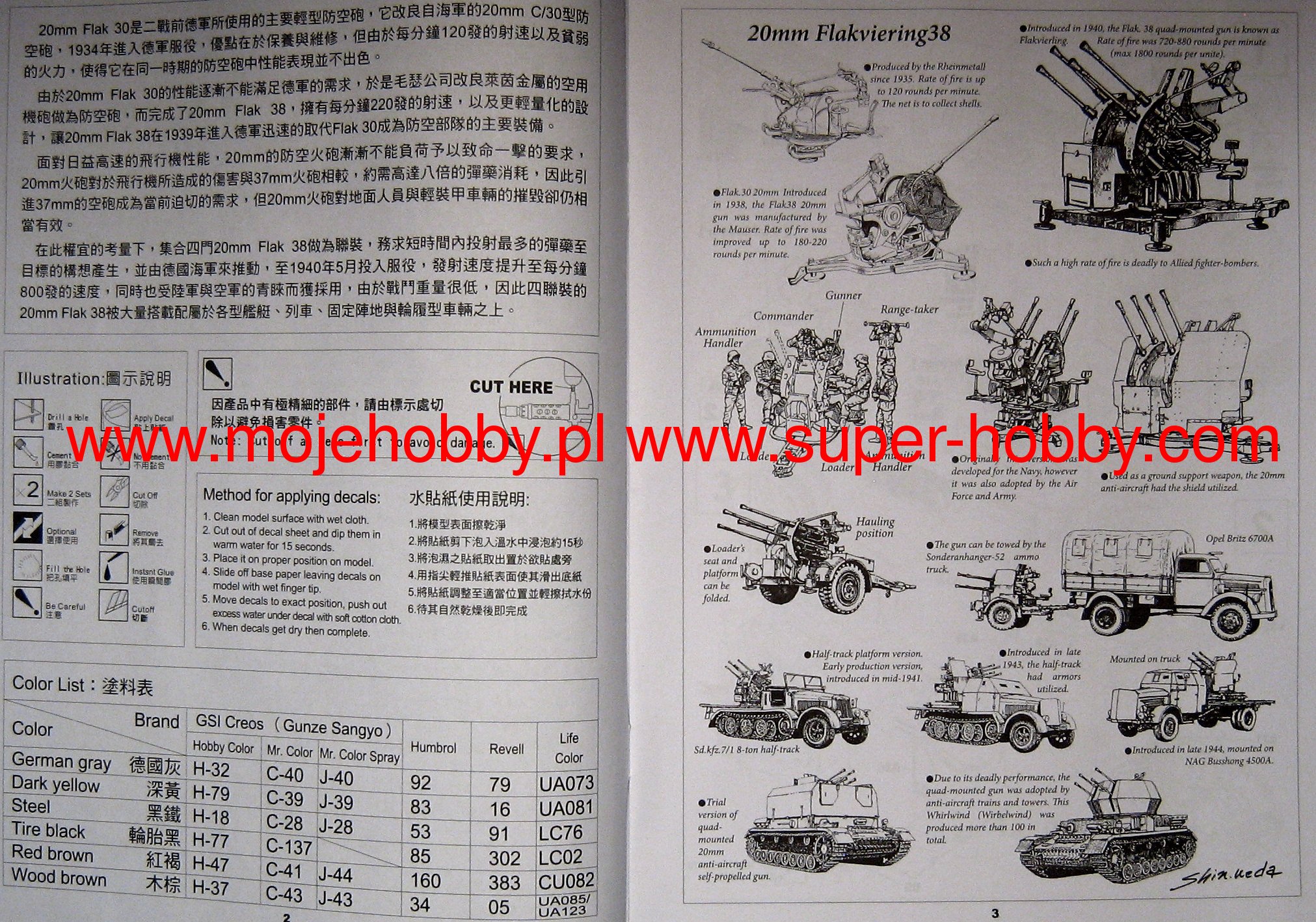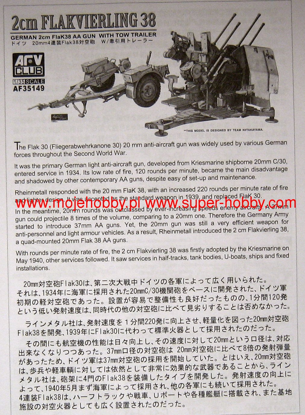 The Flak 38 is a German towed 20mm automatic anti-aircraft gun from the Second World War. The first prototypes of the plot were created in 1938, and serial production began shortly after. The maximum vertical range was 3,700 m, and the initial velocity of the projectile was 900 m / s. Theoretical rate of fire was up to 420 rounds per minute. The Flak 38 was developed by the Mauser company as a far-reaching modification of the Flak 30 cannon. First of all, the theoretical rate of fire was increased in the new cannon and the general mechanical structure was improved. This improved the parameters of the weapon, however, as shown by the combat operations of 1940-1941, the Flak 38 still had too little firepower, which it was decided to increase by creating a quadruple cannon - this is how the 2 cm Flakvierling 38 was born. Both versions of the cannon were massively used by the Wehrmacht in progress World War II in 1940-1945. They also served as an armament for several vehicles, including: Flakpanzer 38 (t), Mobelwagen and Wirbelwind.