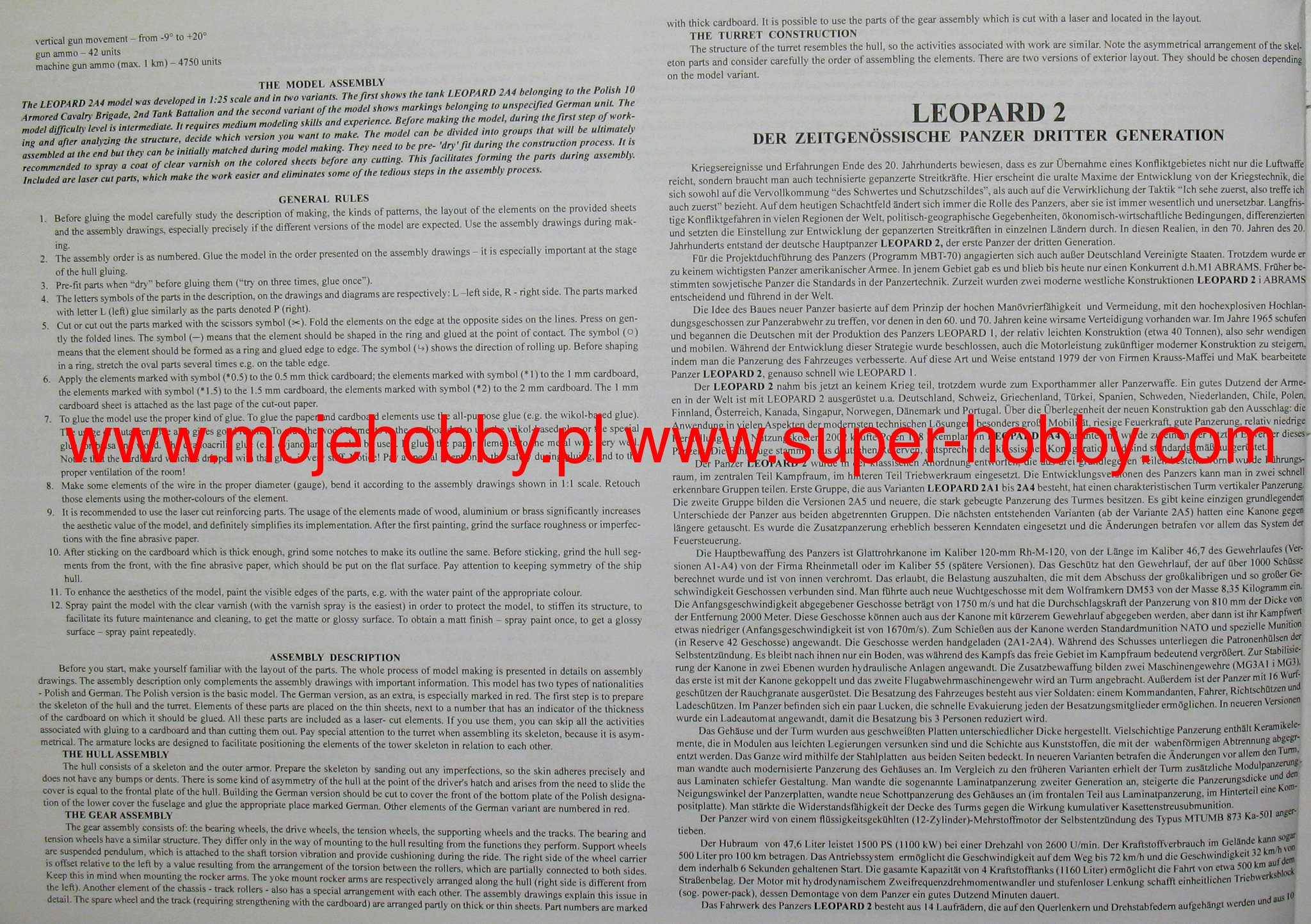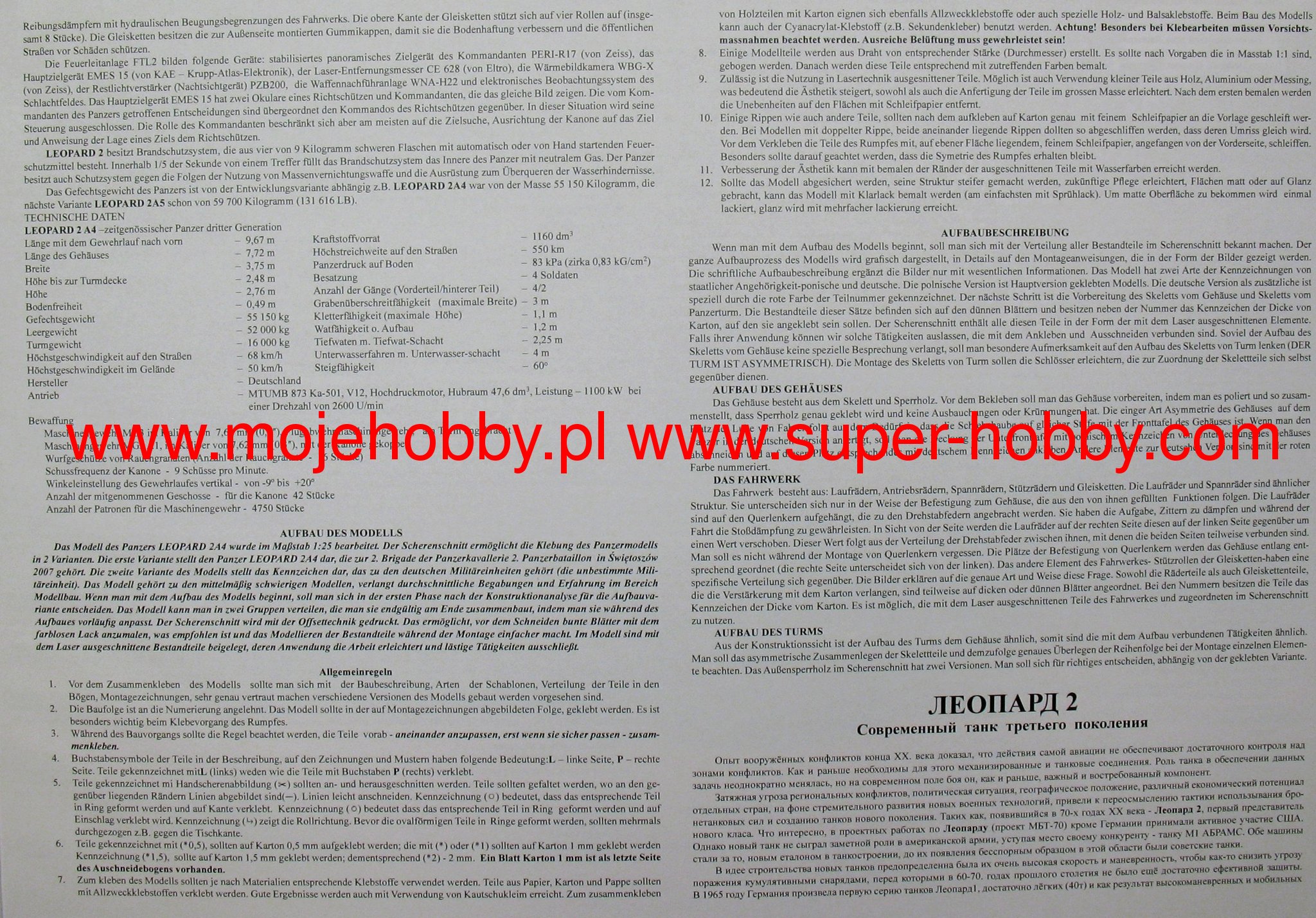 The Leopard 2 is a modern 3rd generation German Main Battle Tank. The first prototypes of the vehicle were made in 1973, and serial production started in 1979 continues to this day. To date (2018), 3,480 tanks of this type have been produced. The Leopard 2 is powered by the 1500 HP MTU MB 873 Ka 501 engine. The vehicle is armed with a single 120mm Rheinmetall Rh-M-120 gun and two 7.62mm MG3 machine guns. The Leopard 2 was developed in response to the demand for a new Main Battle Tank announced by Bundeswehr already in the early 1960s. The new vehicle was to replace the Leopard 1 tanks in the West German army. Initially, cooperation with American companies (e.g. Chrysler) was undertaken in a project designated as MBT-70. However, after a few years, the cooperation was terminated and further work was focused only on German companies. Despite a very long process of analytical, study and experimental works lasting almost 15 years, the Leopard 2 introduced to the line in 1979 turned out to be revolutionary and outclassing the then Soviet designs. Many analysts consider it to be the first tank of the third generation in history, including the M1 Abrams, the French Leclerc or the much later Russian T-90 tank. The Leopard 2 is primarily characterized by unprecedented - before 1979 - mobility and maneuverability in tanks of this class, thanks to the use of a powerful 1500 HP engine. It also has very good armor, using composites and SKO (fire control system). It was also armed with the great Rh-M-120 gun, which in the 1980s and 1990s became a standard for many NATO countries. Several versions of the tank were created in the course of serial production Leopard 2, two of which deserve special attention: A 4 and A 6. The A 4, which appeared for the first time in 1985, has a highly advanced and improved over the previous SKO versions, as well as improved turret and front armor hull. It is also the most widely exported version. At the beginning of the 21st century, the A 6 version was created, which mainly received the Rh-M-120 gun with a significantly longer barrel (L / 55), which significantly improved its penetration capacity. The latest development version of the Leopard 2 tank is the A 7 version, which entered the Bundeswehr's equipment in 2014. Due to its very high combat value, the Leopard 2 was exported to many countries, including: Austria, Chile, Denmark, Finland, Greece, Spain, the Netherlands, Norway or Poland, which has 247 tanks of this type in versions A 4 and A 5.
