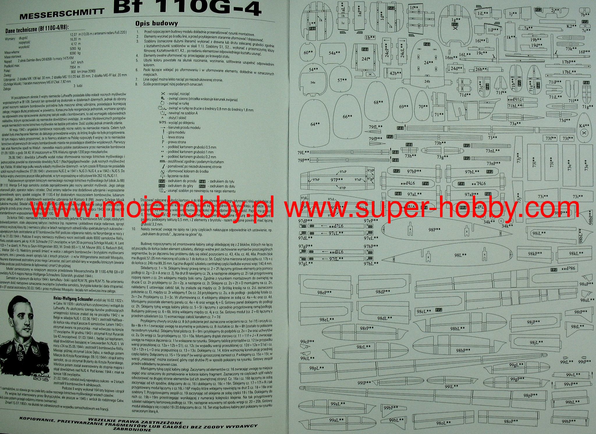 The Messerschmitt Bf-110 is a German twin-engine heavy metal fighter with a double tail. The engines used were Junkers Jumo 210Ga, Daimler-Benz DB 601B-1, Daimler-Benz DB 601F, Daimler-Benz DB 605B-1 engines with power from 700KM to 1475KM. The first prototype of the Bf-110 took off in May 1936. The first mass-produced version of the Bf-110 was the C version, which production started in 1939. Version C was regarded as a heavy fighter and performed on average in the September campaign, but much better in the French campaign. However, too heavy and too slow, the Bf-110 suffered considerable losses in the Battle of Britain, which meant that it was systematically moved to the Reich Defense units as a night fighter, which eventually led to the creation of the G and H versions. They were used as night fighters and interceptors against allied bombing expeditions. In combination with the on-board radar (eg FuG 202 or FuG220), the Bf-110 became a very formidable enemy for British bombers. About 5,800 copies of this aircraft were manufactured in the course of production. Technical data (version Bf-110C): length: 12.3 m, wingspan: 16.3 m, height: 3.3 m, maximum speed: 560 km / h, rate of climb: m / s, maximum range: 2410 km, maximum ceiling 10500 m armament: fixed - 5 7.92mm machine guns and 2 20mm MG FF cannons.