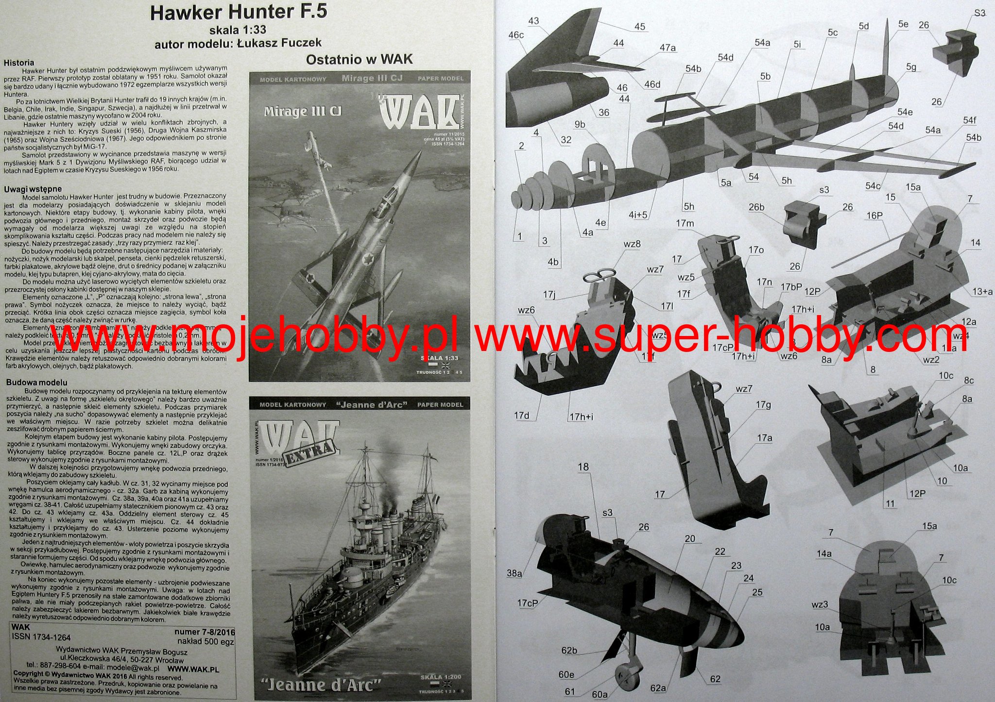 The Hawker Hunter was one of the most successful and most widespread fighters of the 1950s. It was designed by British constructor Sir Sydney Camm in 1948 as a day fighter, successor to the Gloster Meteor. The first prototype flew in July 1951, while the first machine in the F.1 production series entered service exactly three years later. The Hunter FGA.9 was a version adapted to carry out attacks against ground targets, also equipped with the more powerful Rolls-Royce Avon 207 engine, instead of the Avon 203 from the F.6 model, and thus with a better payload and range. The changes also included redesigning and strengthening the wings. A total of almost 2,000 Hawker Hunter machines of all types were built, of which about 700 were then resold to foreign recipients after decommissioning. Belgium, Sweden, Peru and India. The Hawker Hunter machine was involved in, among others. in the Suez Crisis in 1956, in the Second Kashmir War (1965) and in the Bangladeshi War of Independence in 1971. Technical data (Hunter F.6 version): length: 14m, wingspan: 10.26m, height: 4.01m, maximum speed: 1150km / h, rate of climb: 87.4m / s, maximum range with overhead tanks: 3060km , maximum ceiling 15240m, armament: fixed - 4 30mm ADEN cannons, suspended - up to 3400 kg of cargo.