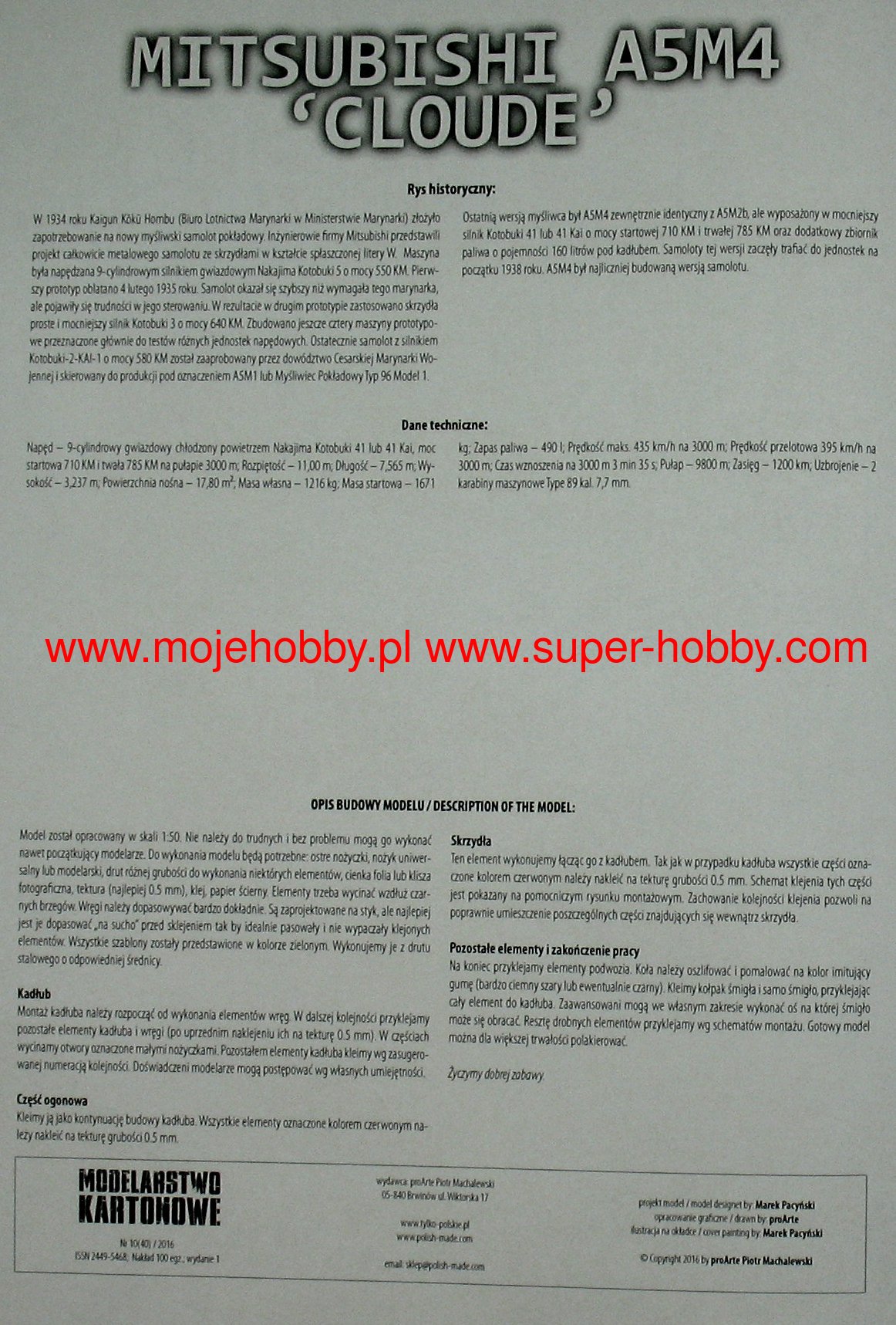 The Mitsubishi M5A is a Japanese, single-engine fighter with a low wing structure and a metal structure from the Second World War. It was the first monoplane fighter of the Imperial Navy. In the early 1930s, the command of the Japanese Navy undertook a program of basing the development of naval aviation on its own designs. The tactical and technical requirements for an on-board fighter, announced in 1932, did not work, so two years later, new, improved requirements were issued, according to which the new fighter was to have a maximum speed of not less than 350 km / h and a climb time at 3000 m not longer than 6 min. 30 sec. The span and length could not exceed 11.0 and 8.0 m, due to the dimensions of the carriers on aircraft carriers. The team led by Eng. Jiro Horikoshi at Mitsubishi plants developed the Ka-14 project. The flight of the prototype with the Nakajima Kotobuki 5 engine (551KM) and the W-shaped airfoil (seen from the front) took place in February 1935. It turned out that it exceeded the requirements set for it too much (e.g. the maximum speed was higher by 100 km / h). The stability was worse and therefore in the next prototype powered by the Kotobuki 3 engine (646HP) the W-shaped airfoil was abandoned. The elliptical contour of the airfoil was retained, however. Despite the fixed landing gear and open cabin, the aerodynamics of the aircraft were carefully developed, and the system of the cantilever low-wing aircraft was a revolution in the tradition of biplane on-board fighters. Trials of 6 prototypes were very successful and in 1936 the plane was put into production with the Nakajima Kotobuki 2 Kai 1 (581KM) engine as a Navy Type 96, Model 1, A5M1 fighter. Serial aircraft entered service in 1937 and soon took part in the Japanese-Chinese conflict. Thanks to this, the Japanese achieved a decisive advantage in the air, which increased even more after the introduction of the improved A5M2a model with the Kotobuki 2 Kai3A engine. Soon, the A5M2b model was put into production, which temporarily had a covered crew cabin, which, however, did not suit the Japanese fighter pilots. The most produced variant was the A5M4 with the Kotobuki 41 engine with a take-off power of 714KM and 789KM at an altitude of 3000 m and an additional external fuel tank with a capacity of 160 dm3. The Model 3, with the Hispano Suiza 12Xers in-line engine, was not mass-produced. In total, approximately 1,000 A5M aircraft were produced, including approximately 800 at the parent plant. In 1941, these planes began to be gradually moved to the second line. They were not reused until the end of the war as Kamikaze. In 1943, a two-seater training version appeared, designated A5M4-K (103 copies). The plane bore the designation Claude in the Allied code, although the first prototype was assigned the designation Sandy, unaware that it was just a prototype. Technical data (A5M4 version): length: 7.55m, wingspan: 11m, height: 3.2m, maximum speed: 440km / h, maximum range: 1200km, maximum ceiling 9800m, armament: fixed - 2 machine guns Type 97 cal .7.7mm.