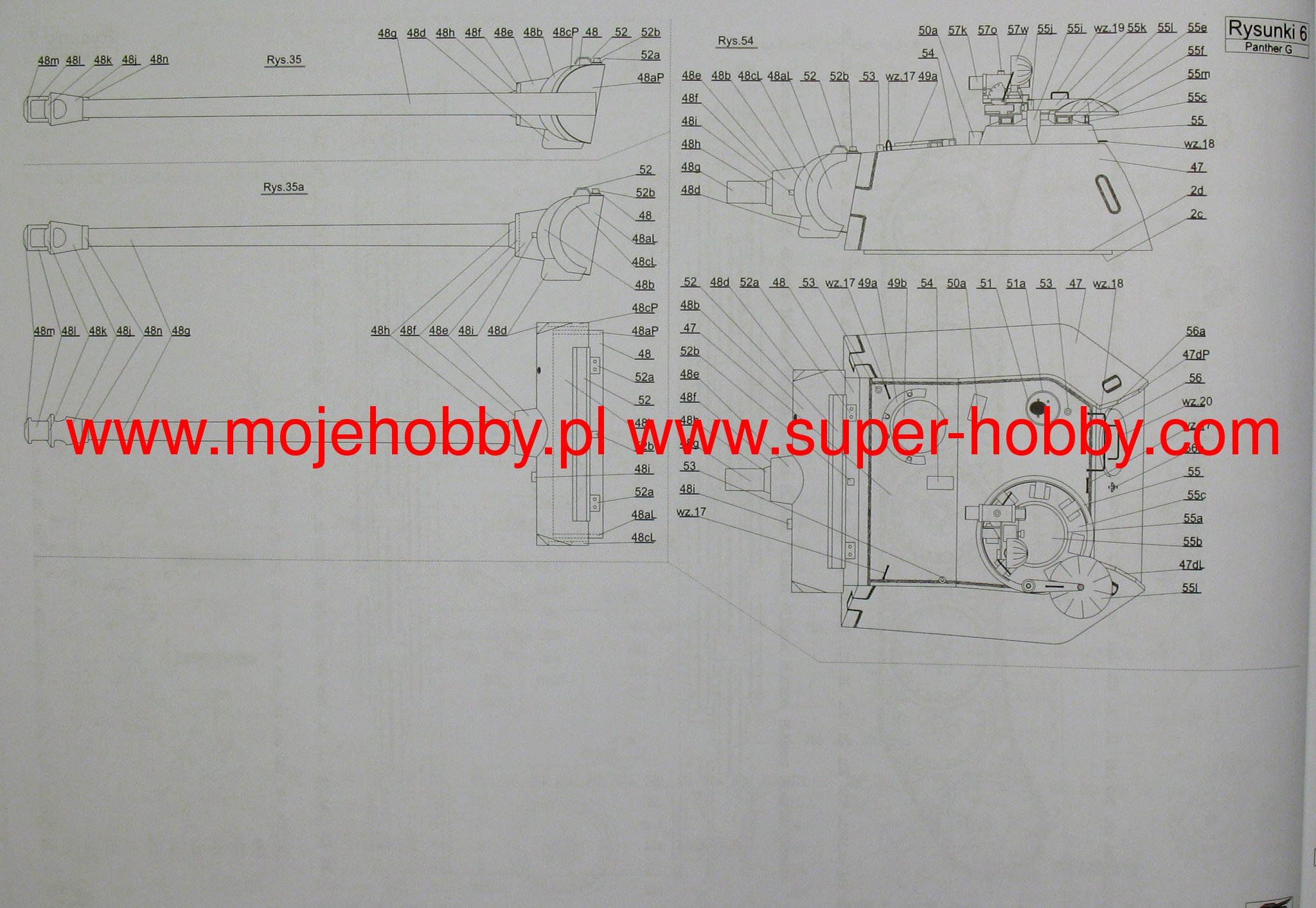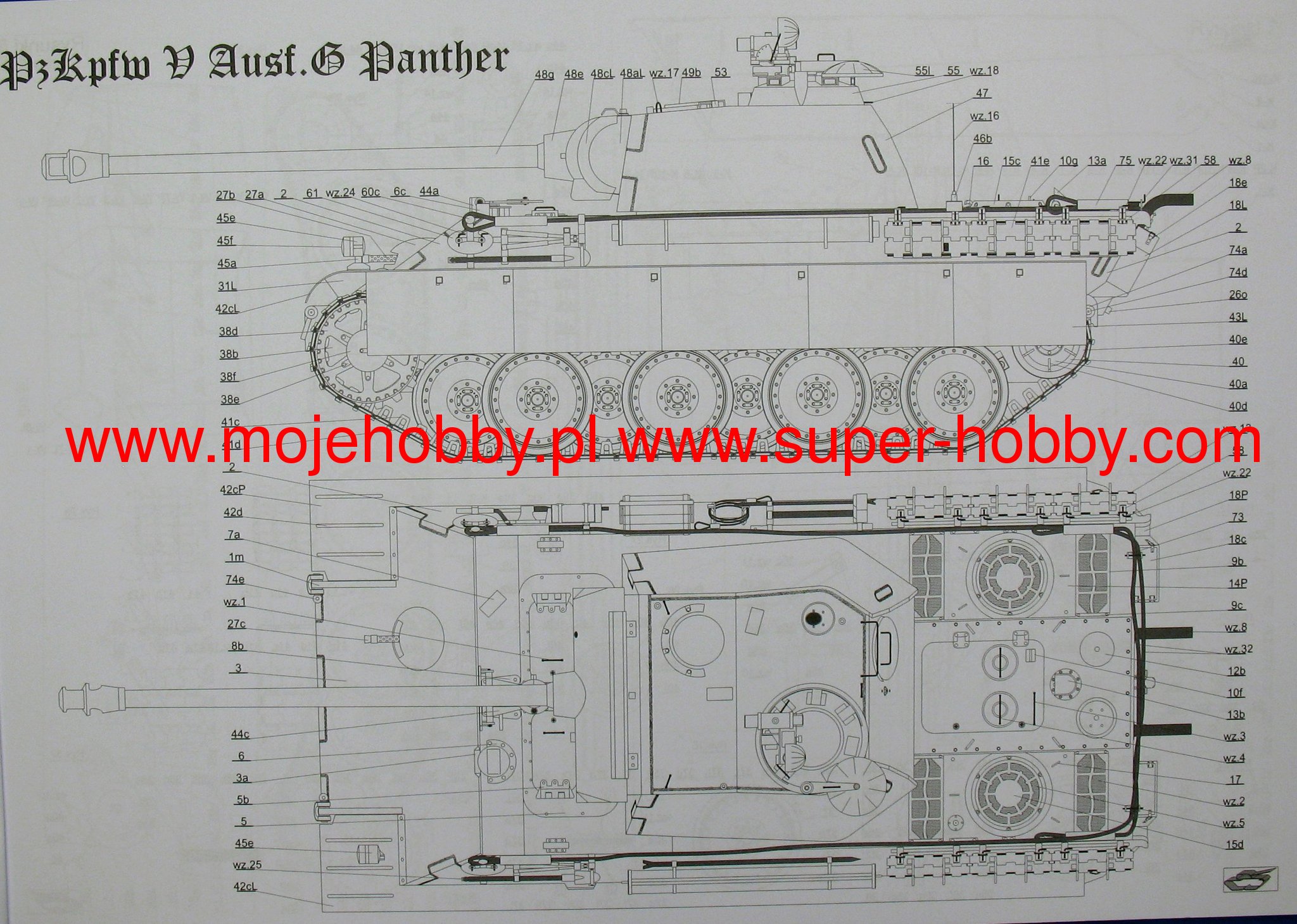 The Pz.Kpfw V (SD.Kfz 171) Panther is a German medium tank, considered to be one of the best tanks of the Second World War. This vehicle was a response to the Soviet T-34. The first production versions appeared as early as 1942, but the Panthers appeared for the first time on the front lines in the summer of 1943, in the Battle of Kursk. Due to the very high failure rate and numerous "childhood" problems of the vehicle, 150 out of 204 used vehicles were lost. Interestingly, however, only a few of these 150 cars were lost as a result of the Soviet shelling. After eliminating these shortcomings, the Panther became famous as an extremely effective tank. It owed it to the well-shaped frontal armor and the excellent anti-tank gun. KwK 42 / L70 cal 75mm. The basic version of the T34 / 76 did not stand a chance with the Panther. Only the advent of the T34 / 85 and IS-2 tanks changed this state of affairs. On the other hand, the Allied Sherman tanks could compete with the Panther only after being armed with a 17-pound gun (Sherman Firefly). Nevertheless, it should not be forgotten that the Achilles' heel of this successful design was the weak side armor and the high technical complexity of the entire structure, and thus the high production time. Throughout the war, around 6,000 Panther vehicles of all versions (Ausf. D, A, G) were produced. The first mass-produced version was the "D" version, with 80mm thick frontal armor and a Maybach 230 P30 engine with 700HP. From the second half of 1943, tanks of this version had armored aprons. The Panther Ausf entered production in September 1943. A. It had a spherical mount for the MG-34 rifle in the fuselage. It was produced until March 1944. The "G" version was the most produced version. Over 3,700 tanks of this model were built. It was produced from March 1944 to January 1945. It mainly increased the angle of the frontal armor and made it thicker. The gun mantlet has also been modified. The Jagdpanther tank destroyer (Sd.Kfz 179) was also built on the Panther's chassis. When assessing the Pz.Kpfw V, you should remember not only about the great frontal armor or the gun, but also pay attention to the disadvantages of the weapon - large overall dimensions, delicate suspension, armor of increasingly poor quality caused by a lack of molybdenum or weak side armor. Technical data: length (with a barrel): 8.66m, width: 3.42m, height: 2.99m, engine power: 700KM, range (on the road): 200km, maximum speed (on the road): 46km / h, weapons : 1 cannon. 75mm KwK 42 / L70, 2 7.92mm MG-34 machine guns.