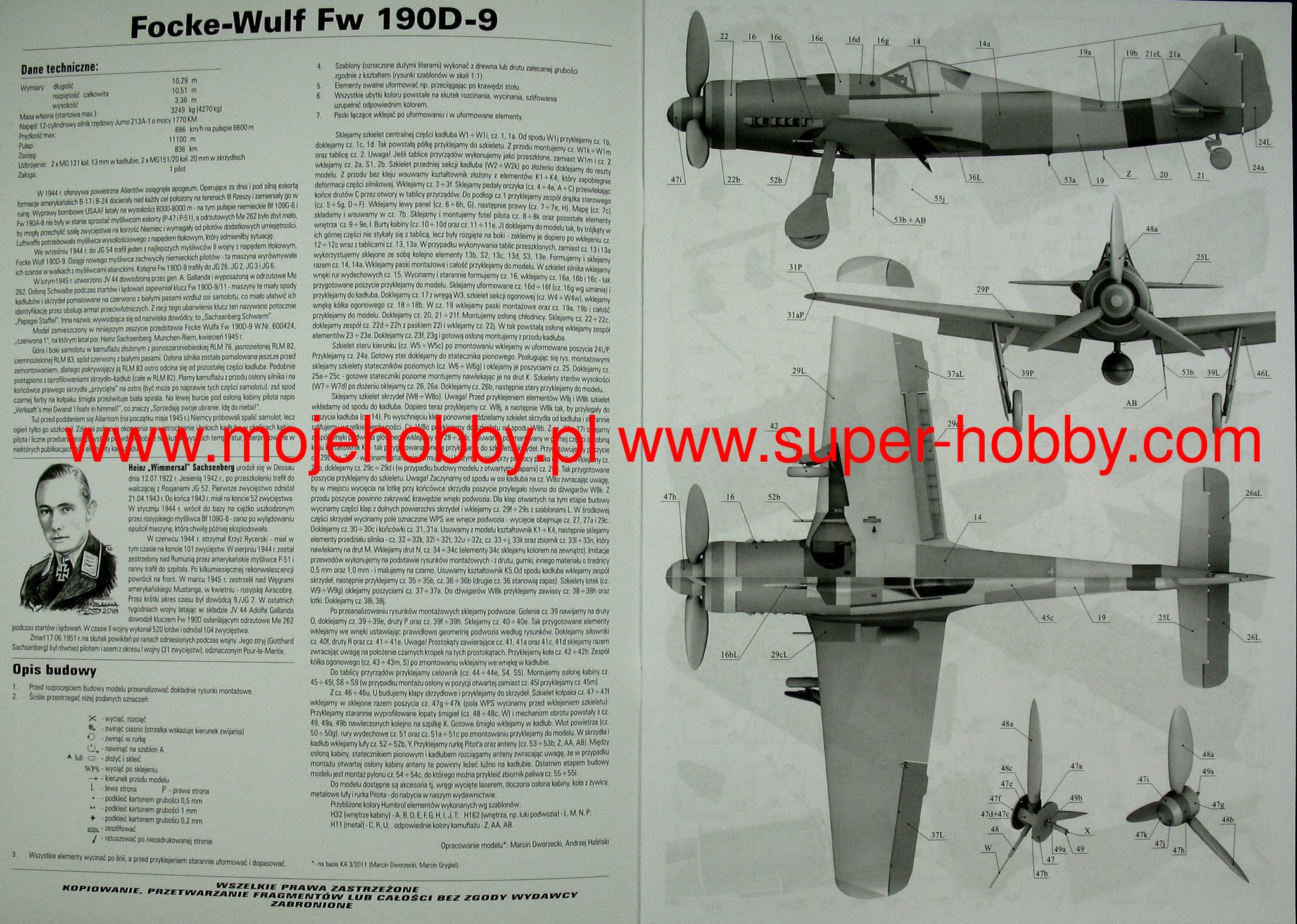 The Focke-Wulf Fw-190 is a German, single-engine, full-metal fighter aircraft with a covered cabin in the low wing design of the Second World War. The pilots considered the Fw-190 to be a better aircraft than the Messerschmitt Bf-109. A self-supporting low wing with a working Fw-190 coating was commissioned by the Luftfahrtministerium, assembled in the fall of 1937. Kurt Tank submitted two propulsion proposals - the first with a liquid-cooled Daimler-Benz DB 601 engine, and the second with the new BMW 139 radial engine. The latter was chosen, and the work started in the spring of 1938 was headed by Obering R. Blaser. The first prototype of the Fw-190V1 was ready in May 1939, and it was flown in Bremen on June 1, 1939 by Captain Hans Sander. The second prototype, the FW-190V2, armed with two MG131 and two MG17 machine guns - all 7.92 mm caliber, was flew in October 1939. To reduce aerodynamic drag, both were equipped with a tunnel air inlet in the propeller cap, but problems with overheating of the engine resulted in a return to the proven NACA shield design. Before the tests of these prototypes began for good, the decision was already made to replace the BMW 139 engine with a stronger, but longer and heavier BMW 801. It required many changes, strengthening the structure and moving the cabin back, which later became a source of problems with the center of gravity. The advantage was the removal of problems with exhaust gas permeation and overheating of the cabin interior due to its direct vicinity to the BMW 139 engine. The third and fourth prototypes were abandoned, and the Fw-190V5 with the new engine was completed at the beginning of 1940. Later, it received wings with a wingspan enlarged by one meter (from the original 9.5 m), which made it 10 km / h slower, but it increased the rate of climb and improved maneuverability. It was marked Fw-190V5g, and the variant with the shorter wing was Fw-190V5k. The first seven machines of the Fw-190A-0 information series had a short wing, the rest - a longer one. The first operational unit equipped with the Fw-190 - 6./JG 26 stationed at Le Bourget, declared its operational readiness in August 1941 and from the first meeting of the new fighter with the British Supermarine Spitfire, its advantage over them became apparent. During the war, a dozen or so versions of this great plane were created. The machines of the "A" version, along with a dozen or so modernizations, served as fighter planes. The versions marked "B" and "C" were only prototypes of high-altitude fighters intended for fighting strategic bombers, but they did not enter into serial production. The "D" variant, as the only one of the Fw-190s, was powered by the new 1750HP Jumo 213A engine and was the German response to the P-51 Mustang. The new engine extended the fuselage by several dozen centimeters. This variant also performed mainly hunting and high-altitude fighter tasks. Numerous variants of the "F" version were used as fighter-bombers as direct support of the battlefield. The "G" version played the same role as the "F" version, but had a greater range. During the entire war, over 20,000 copies of this one of the best fighters of World War II were produced. Technical data (version Fw-190A-8): length: 9m, wingspan: 10.51m, height: 3.95m, maximum speed: 656km / h, rate of climb: 15m / s, maximum range: 800km, maximum ceiling 11410m , armament: fixed-2 MG131 13mm machine guns and 4 MG151 20mm cannons (2 MG 151 / 20E cannons for the D-9 version).