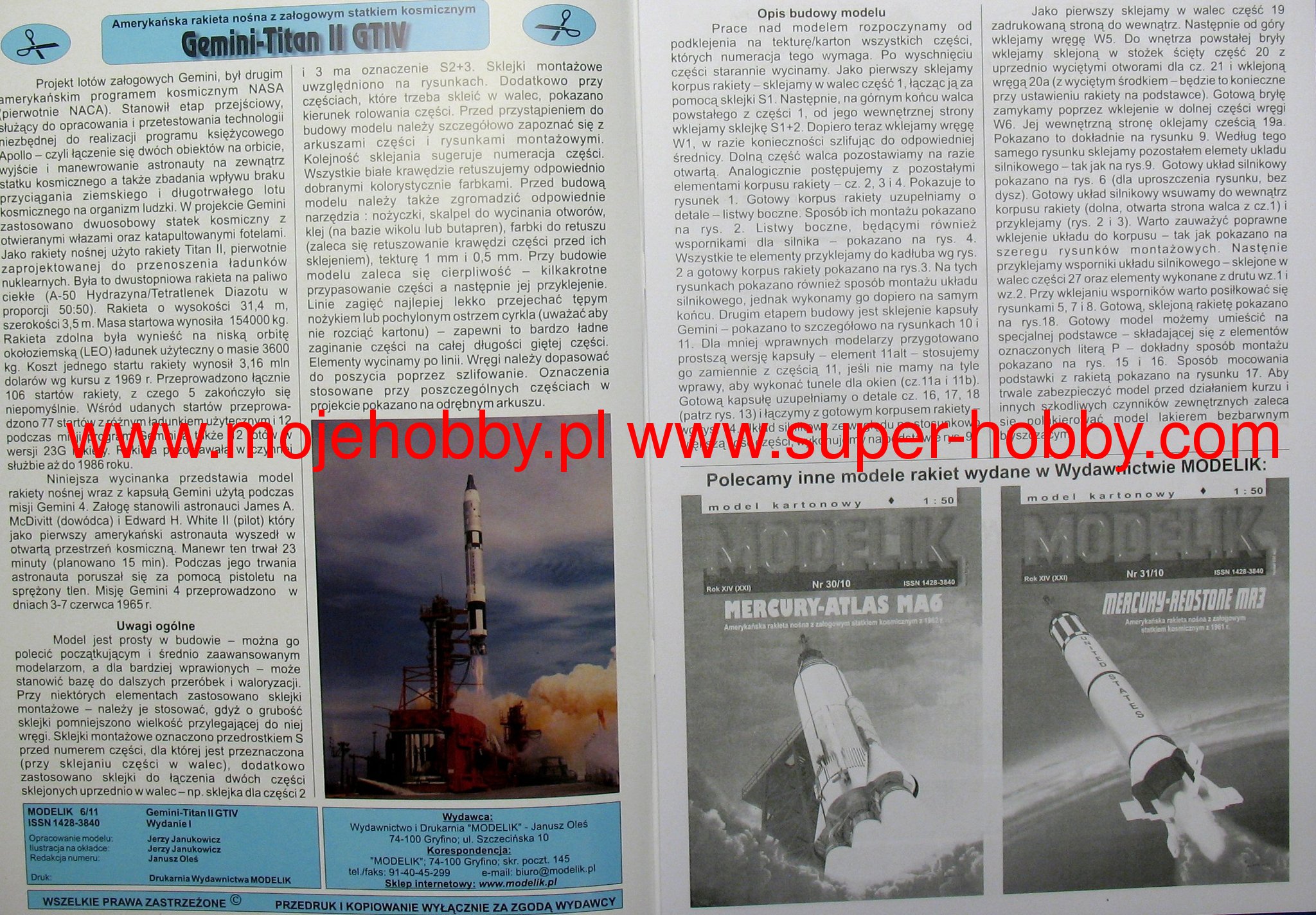 The Gemini program is the name of the US-led space flight program that ran from 1963 to 1966. It was the next step of the American space agency, which was to bring it closer to sending a man to the moon. It included new space maneuvers for NASA, such as the launch of astronauts into space or the connection and docking of two spacecraft. It also collected very carefully data on the impact of weightlessness on human physiology. As part of the program, McDonnell developed a special space capsule, which was to be used to implement the above-mentioned tasks and research goals. This capsule, in its basic version, was 5.67 meters high, 3.05 meters in diameter and weighed 3.85 tons. Its maximum time in orbit was 14 days. For those times, they were very technically advanced - suffice to say that it was the first American spacecraft to use its own on-board computer called Gemini Guidance Computer. During the implementation of the Gemini program, a total of 12 successful spaceflight flights, including 10 manned, were performed. The project, although costing the equivalent of today's USD 6-7 billion, ended with a complete technical and scientific success.Titan II (Eng. Tytan II) Gemini Launch Vehicle (English abbreviation: GLV) is an American carrier rocket, which was developed for the needs of manned space flights under the Gemini program. Her first successful start was in April 1964 and the last one in November 1966. There were 12 rocket launches during these years, all of which were successful. The length of the rocket was approximately 33 meters with a diameter of 3.05 meters. The mass of the rocket, including the Gemini, was approximately 154 tons. The Tytan II carrier rocket was a modernization of the ballistic missile SM-68B Titan II , commissioned in 1963. The main modernizations and changes included the use in the carrier rocket, among others, of a fault-finding installation, a backup flight control system or the introduction of a radio control system. All changes were made for NASA by the rocket manufacturer - Aerojet. The rocket consisted of two sections, the first of which was about 21 meters long, and the second - about 12 meters.