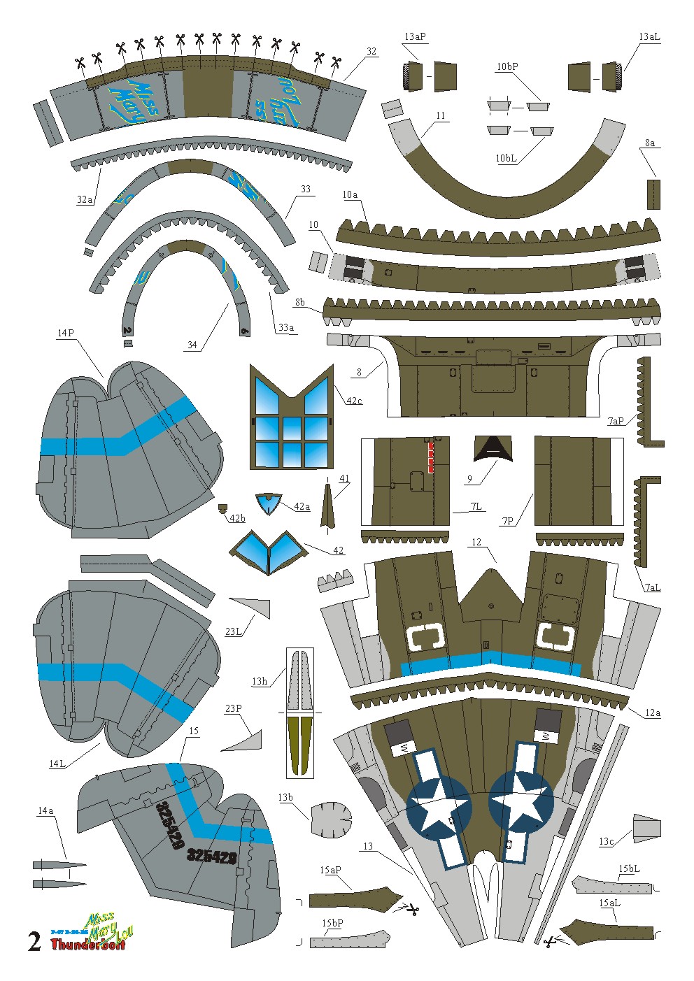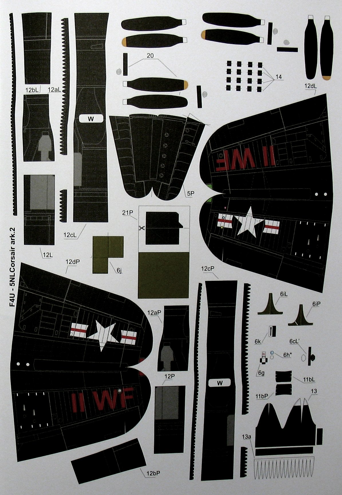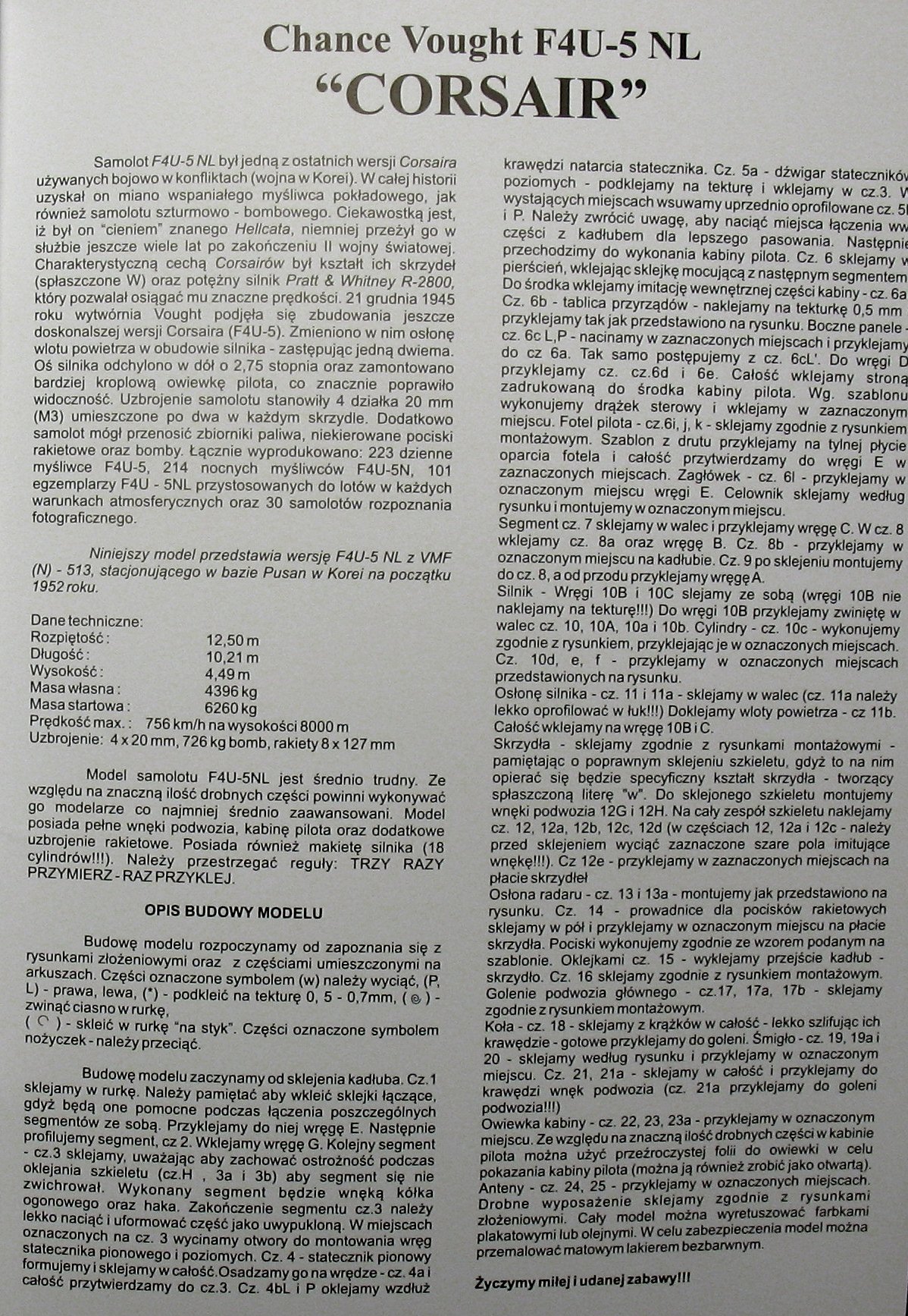 The revolutionary design of the F4U Corsair was created in 1938 in response to the request of the US Navy to design a high-speed fighter stationed on board aircraft carriers. Chance Vought took on the challenge, with the goal of fitting the most powerful of the available engines (i.e. the Pratt-Whitney Double Wasp engine) into the smallest possible airframe. The key was to place the clunky landing gear in the inverted, crooked wings that became the hallmark of the aircraft. The flight of the prototype took place on May 29, 1940, and the US Navy received its first serial Corsair on July 31, 1942. However, tests carried out by the US Navy on aircraft carriers revealed some flaws in the design, which meant that the first production series of the aircraft went to squadrons of the Marine Corps and operated from land bases. The first unit received by the F-4 was the VMF-124 at Gudalcanal. It quickly turned out that the new machine definitely surpasses all enemy machines and, in several respects, also the F-6 Hellcat. At the same time, however, it was very difficult to pilot and required great attention when landing. Interestingly, only up to 20% of Corsair missions took off from the decks of aircraft carriers, and throughout almost the entire war they remained primarily a machine of the Marine Corps. After the end of World War II, the F-4 Corsair remained in the line and took part in the Korean War (1950-1953). Technical data (version F4U-4): Maximum speed: 731 km / h, speed of climb: 19.7 m / s, maximum ceiling 12649 m, maximum range: 1115 km, armament: fixed - 6 M2 machine guns, caliber 12, 7mm and 4 20mm Browning cannons, sling - up to 1800 kg of bombs.The Republic P-47 Thunderbolt is an American, single-engine fighter and fighter-attack aircraft, built in a low wing configuration with a classic tail. Considered one of the best American fighters of World War II. The flight of the prototype took place in 1941, and serial production continued in the years 1942-1945. The P-47 can be described as the workhorse of the US Air Force in both Europe and the Pacific. Although the 2000HP R-2800 Double Wasp engine, turbine and exhaust system made the plane very large and heavy, it was not a barrier to achieving great performance. The usefulness of the machine was so great that it was used both for bomber escorts and for bombing missions with the P-47 in the lead role. The P-47 class is evidenced by the sheer number of aircraft produced. There were 15660 of them, and as many as 12602 in the D specification, which is an absolute record when it comes to the number of fighters produced in one version. Another common version was the P-47N, with changed wings, larger fuel tanks, and a more powerful engine. It was used both as a fighter and an assault machine. Even after World War II, the Thunderbolt was one of the most popular American fighters until the early 1950s. Technical data (P-47D version): length: 11m, wingspan: 12.42m, height: 4.47m, maximum speed: 697km / h, rate of climb: 15.9m / s, maximum range: 2900km, practical ceiling: 13,100m, armament: fixed - 8 12.7mm M2 machine guns, suspended - up to 1100 kg of bombs or unguided missiles.