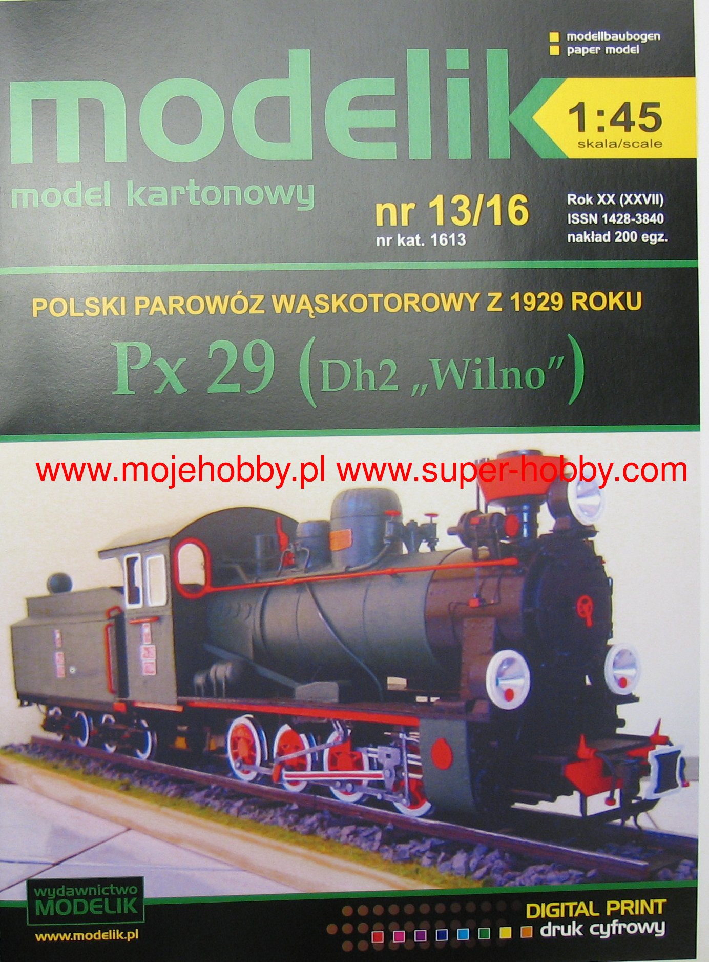 Px29 (another designation: Wp29) is a series of narrow-gauge steam locomotives (steam locomotives), which were manufactured in 1929 at the plants of Warszawska Spółka Akcyjna Budowy Parowozów (in short: WSABP). The length of the locomotive (without the tender) is 7 m and a width of 2.18 m. The service weight was 21.8 tons. The diameter of the driving wheels was 750 mm, and the axles were constructed in the D system. In total, 21 locomotives of this type were built. The Px29 steam locomotive was commissioned by the Ministry of Transport and was dedicated primarily to servicing connections in then-eastern Poland, e.g. in the Vilnius region. The first copies turned out to be successful constructions, which were characterized by simplicity of operation and maintenance and a smooth running of the train. Most of the "childhood diseases" were also quickly eliminated. A large number of Px29 locomotives were adapted to tracks with a width of 750 mm, but some were adapted to operate on tracks with a gauge of 760 mm. After World War II, PKP had 11 locomotives of this type, which were used until the end of the 1970s. After 1945, the Px48 steam locomotive was also developed on the basis of the Px29.