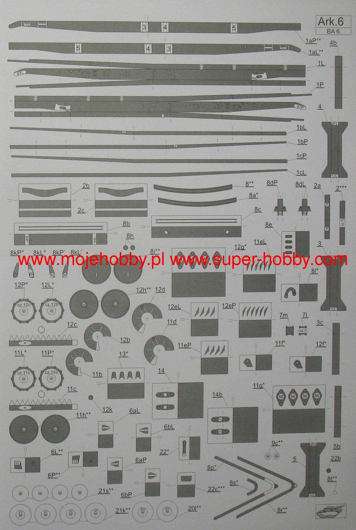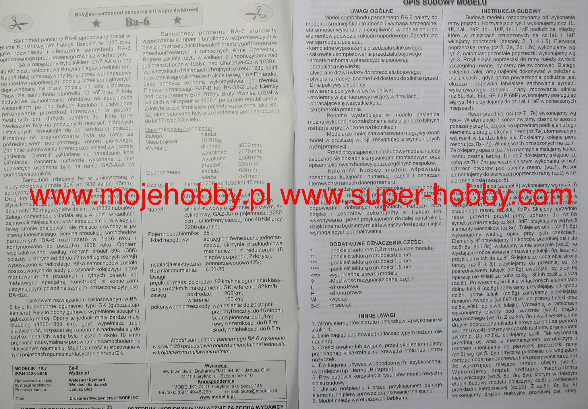 The BA-6 was a medium, six-wheeled armored car of Soviet construction. The first prototypes were built in 1935, and serial production lasted from 1935 to 1938/1939 and ended with the production of about 390 vehicles. The car was powered by a 40 HP GAZ-AA carburettor engine. The main armament was a 20K wz. 1932 caliber 45 mm, and the auxiliary armament was provided by 2 DT 7.62 mm machine guns. The BA-6 was created as a successor to the BA-3. In the new car, efforts were made to keep the advantages of its predecessor (strong main armament) in the absence of its main disadvantages (low maneuverability and high failure rate of the engine and transmission). For this purpose, the new GAZ-AAA chassis was used (a license copy of Ford's chassis), increasing the track width and reinforced structure of the gearbox. However, the vehicle's performance deteriorated. Despite this, the BA-6 was put into mass production. In its course, two main development versions were created: BA-6ŻD (adapted to driving on rails) and BA-6M (a car with a new engine, new turret and thicker armor). BA-6 cars underwent their baptism of fire in the Spanish Civil War (1936-1939). Later, they also fought against the Japanese in the Battle of Chałchyn-Goł (1939) and took part in the aggression against Poland in September 1939 and in the Winter War with Finland. A huge number of them were lost by the Red Army in the first months of the war with Germany in 1941.