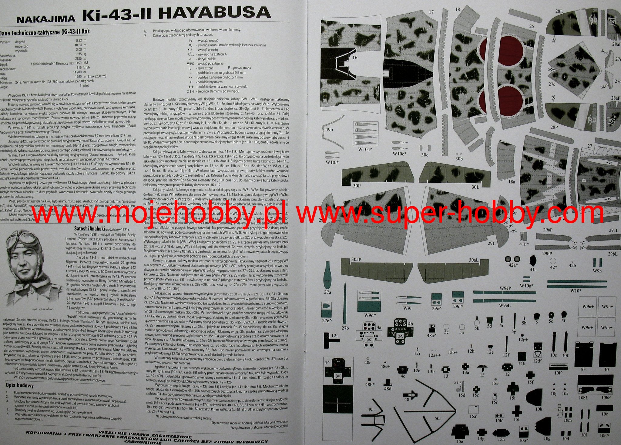 The Nakajima Ki-43 Hayabusa (Japanese peregrine falcon) is a Japanese, single-engine, metal, semi-shell fighter in a low wing design from the Second World War. The USAF nicknamed this machine Oscar. The flight of the prototype took place in January 1939, and the entry into the line units in 1941. The Ki-43 Hayabusa was the most important and most numerous fighter in the Japanese Air Force during the entire war. In the years 1939-1945, three main versions of the aircraft were created, each of which had several revisions. The first production series is the Ki-43-I powered by the 950 HP Nakajima Ha-25 engine or the Ha-25 Type 99 version with 980 HP. This Ki-43 model turned out to be in the period 1941-1942 a machine definitely superior to Allied planes, for example Brewster Buffalo or P-40. At the same time, it was commonly confused with the famous A6M Zero. The next development version is the Ki-43-II with a new, more powerful version of the Ha-25 engine, with makeshift cabin armor and self-sealing fuel tanks. The outline of the wing and engine silencers were also changed. Its production started in 1942. The latest version is the Ki-43-III, powered by a Nakajima Ha-115-II Sakae engine with a capacity of 1230KM. It entered production in December 1944 and was used to defend the Japanese islands against Allied air strikes and for suicide missions as a kamikaze plane. All versions of the Ki-43 were liked very much by pilots due to their excellent flight characteristics and, above all, excellent maneuverability. Almost every Army Air Force ace has flown the Ki-43 at some point in his career, and moreover has had aerial victories with it. One of the best Ki-43 pilots was Satoshi Anabuki, who had 39 confident victories throughout his career. Technical data (version Ki-43-II): length: 8.92 m, wingspan: 10.84 m, height: 3.27 m, maximum speed: 548 km / h, maximum range: 1760 km, maximum ceiling 11200 m, armament: fixed- 2 Type 1 machine guns, caliber 12.7 mm, underslung - 2 bombs 30 kg or 2 fuel tanks, 200 liters each.