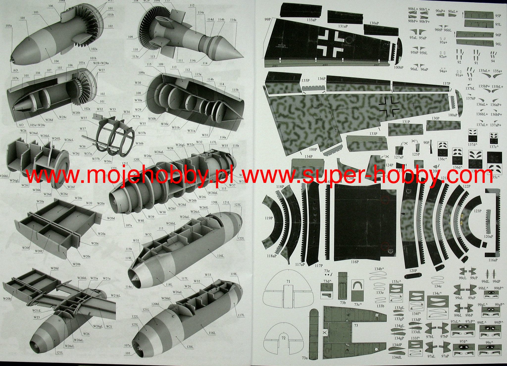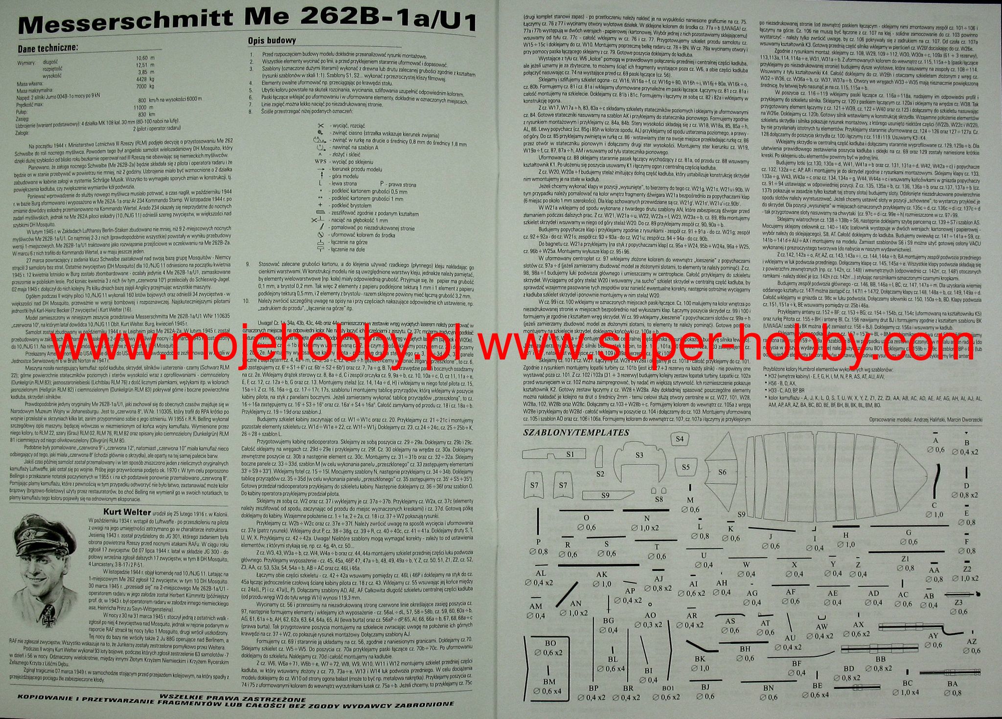 The Messerschmitt Me-262A Schwalbe (German: swallow) is a German twin-engine fighter-bomber with a metal structure in a low wing configuration. The Me-262 was the first combat jet in the history of aviation. The first flight with piston engines took place in 1941, and with turbojet engines on July 18, 1942. The first design of the airframe, designated P.1065, was presented in 1939 and, surprisingly, differed significantly from the final version. It was quickly decided to use oblique wings and test the airframe in flight with piston engines (Jumo210), which was successfully completed in 1941. As a result of problems with the target power unit (BMW003 engine), the first jet flight on the Me-262 took place with Junkers Jumo004 engines. Interestingly, the Me-262 was structurally ready for serial production at the end of 1942. However, his entry into the line was significantly delayed. Firstly, due to material deficiencies (especially tungsten and chrome deficiencies), which forced technological changes, secondly, because of the failure of the BMW003 engines, and third, because of Hitler's resistance to the Me-262 being a fast bomber, not a fighter. As a result of all factors, the plane entered the line only in 1944! Given the already overwhelming advantage of the Allies in the air, the shortage of fuel and trained crews of the Me-262 could not have had a major impact on the course of the war. Undoubtedly, it was technologically superior to enemy aircraft, and the loss ratio was 1: 9 in favor of the Me-262. A total of about 1,400 machines were built, but only about 300 entered service. Several development versions of this revolutionary aircraft were created: a bomber (A-2a), reconnaissance (A-1a / U3 and A-4a), day fighter (A-1a) and night fighter (B-1a / U1). Technical data (version Me-262A-1a): length: 10.6m, wingspan: 12.6m, height: 3.5m, maximum speed: 900km / h, speed of climb: 20m / s, maximum range: 1050km, ceiling maximum 11450m, armament: fixed - 4 30mm MK108 cannons, underslung - 24 R4M rockets, 55mm caliber, up to 1000 kg of bombs.