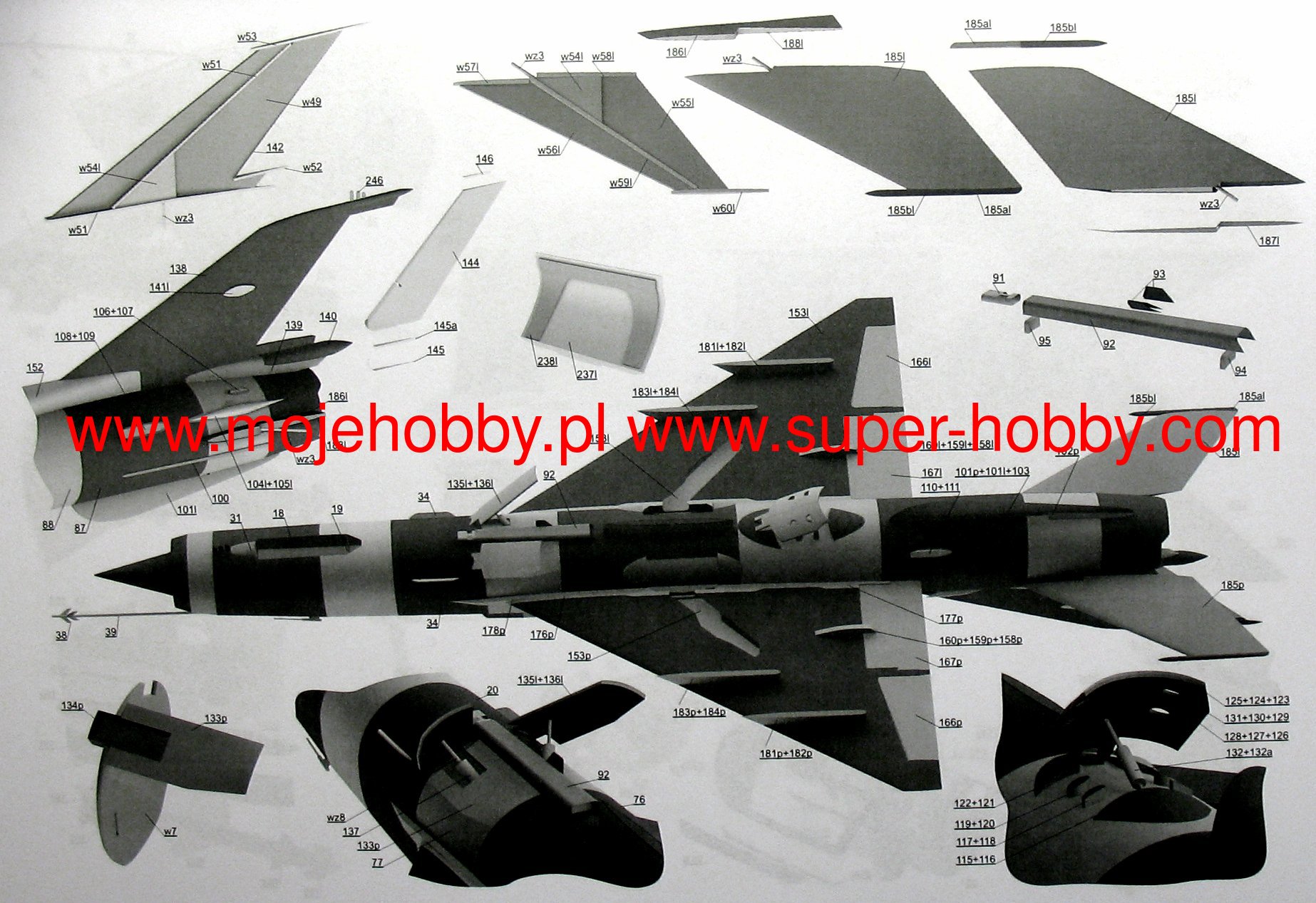 Микоян-Гуревич МИГ-21 (НАТО: Fishbed) советский лёгкий истребитель дюралюминиевой полукорпусной конструкции, в среднеплановой схеме, с треугольной лопастью с наклоном 57 градусов. Полет прототипа состоялся 16 июня 1956 года. Прототипом МИГ-21 считается прототип Е-5 с двигателем РД-11. После его полета было создано еще несколько прототипов, которые, кстати, били различные международные рекорды скорости полета. Полученный от них опыт был использован для усовершенствования Е-5, и, наконец, в 1959 году самолет был отправлен в серийное производство как МИГ-21Ф-13. В производстве находится более десятка базовых модификаций, а вместе с различными диверсиями количество типов МИГ 21 можно исчислить несколькими десятками! Важнейший из них первый серийный МиГ-21Ф. Он заменил версию МИГ-21ПФ с РЛС РП-21 и двигателем Р-11Ф2. Следующим вариантом развития является МиГ-21Р, т.е. самолет-разведчик. Также было создано несколько учебных модификаций, первая из которых МиГ-21У-400. МиГ-21 оказался очень удачной конструкцией, с отличными характеристиками, простым в пилотировании и дешевым в производстве. О качестве конструкции свидетельствует тот факт, что в 90-х годах были опытные версии этого самолета, которому было более 30 лет. Машина экспортировалась во все страны бывшего Варшавского договора и во все множество арабских и африканских стран. МиГ-21 принимал участие в большинстве вооруженных конфликтов 1960-1980 годов, в том числе во Вьетнамской войне, в Шестидневной войне (1967 г.), в ирано-иракской войне (1980-1988 гг.). Технические данные: длина: 13,46м, размах крыла: 7,15м, высота: 4,1м, максимальная скорость: 2130км/ч, скорость набора высоты: 120м/с, максимальная дальность: 1100км, максимальный потолок 19000м, вооружение: стационарное - одноместный 23-мм ГШ- 23 пушка (версия М), подвесная до 2000 кг груза.