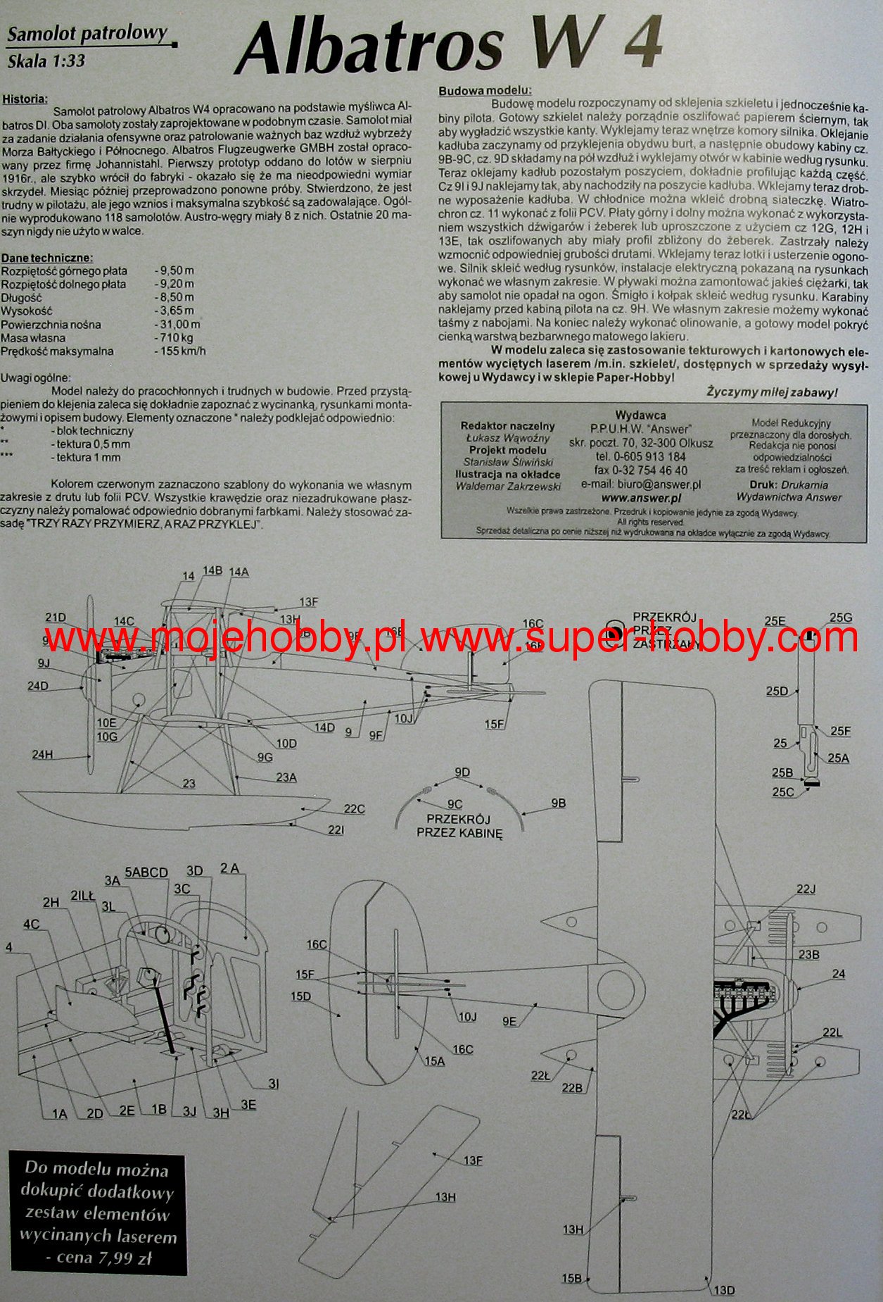 The Albatros W.4 airplane is a single-seat fighter floatplane from the First World War created for the needs of the German Navy. The first tests of the new machine began in August 1916, and the line service of the Albatros W. 4 began at the beginning of 1917. A total of 118 units were produced by December 1917. The plane was used for patrols and defense of German navy bases in the Baltic and North Sea. The plane was not used intensively by the German Navy, and from 1918 it was replaced by two-seat machines, eg Hansa-Brandenburg W.12. Technical data: Top speed: 160 km / h; climb speed 3.3 m / s, maximum ceiling 3000 m, maximum range: 450 km, armament: two 7.92 mm LMG08 machine guns.