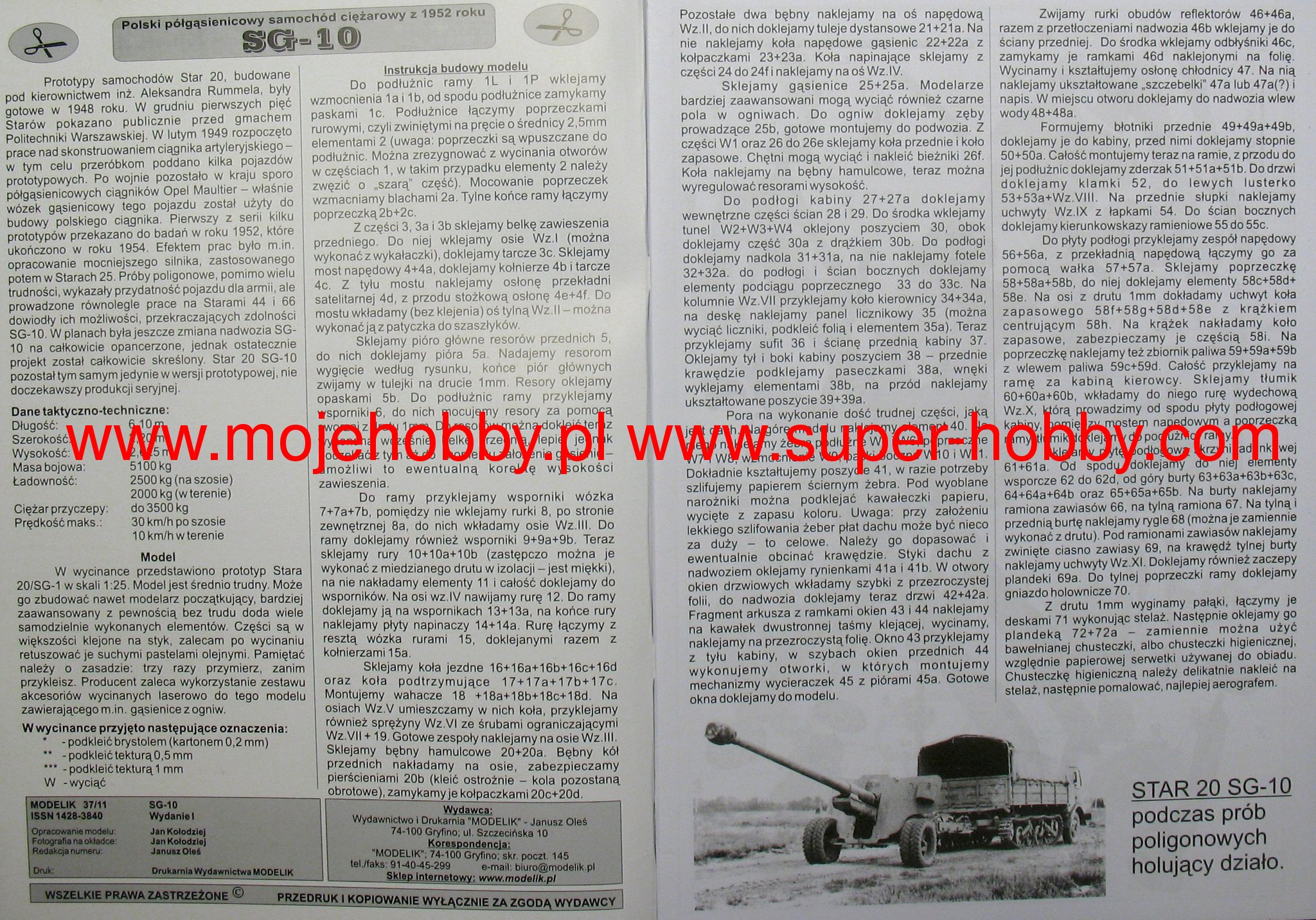 The SG-10 was a Polish prototype half-track artillery tractor from the Cold War period. Prototypes of the vehicle were built in the years 1949-1954, but the car did not enter serial production. The vehicle prototypes were powered by a single 93hp S-42 carburetor engine. The vehicle did not have any permanent weapons. The SG-10 was developed on the basis of the Star 20 truck, and its main task was to tow guns with a caliber above 100 mm. In general, the model was taken from the German carrier from World War II, Opel Maultier, and the Soviet vehicles: ZiS-42 and GAZ-60. Despite the high pace of work, the new vehicle turned out to be a fairly successful design that performed well off-road and quite decently on the road. Ultimately, however, it was not put into production, due to the appearance of the universal military truck Star 66, which had clearly better performance on the road and similar in the field. It could also act as an artillery tractor.