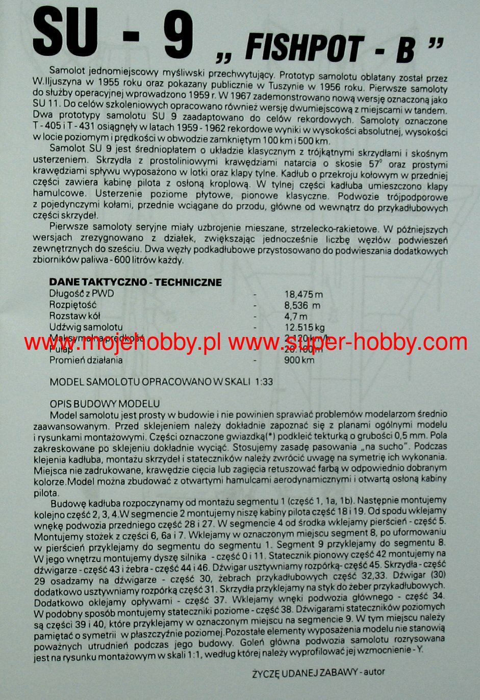 The Sukhoi Su-9 is a Soviet single-engine jet interceptor with a classic tail, metal structure and slanted wings in a medium wing configuration. The prototype flight took place in May 1956. The Su-9 was the basic Soviet interceptor of the early 1960s. It also perfectly reflected the concept of a "carrier plane", not intended for maneuvering, but for one surprise missile attack. In the second half of the 1960s, the Su-9 planes were adapted to carry the R-55 self-guiding missiles with infrared radiation, and the radar was modified for the RP-9UK variant. The Su-9 was also tested with bombs and, at the beginning of the 1970s, with the UPK-23-250 suspended container with a 23 mm cannon, the use of which, however, required the abandonment of suspended fuel tanks and was not popular. In 1960, the two-seater training and combat variant of the U-43 aircraft was developed. It had a 60 cm long fuselage to accommodate the instructor's seat behind the pilot's cabin. The prototype rebuilt from the Su-9 was flew on January 25, 1961. After state tests, the plane was adopted under the designation Su-9U and in 1961-1962 they were built at the Moscow plant of 50. This version carried two missiles and kept the radar station and others on it equipment. The Su-9 was replaced in the USSR aviation by the Su-11 and Tu-128. Technical data (Su-9 version): length: 18.06m, wingspan: 8.54m, height: 4.82m, maximum speed: 2230km / h, rate of climb: 200m / s, practical ceiling: 20,000m, maximum range: 1260 km, armament: fixed - none, outboard - from 2 to 4 AA-1 Alkali (RS-2US / K-5) or AA-3 Anab (K-55) missiles.