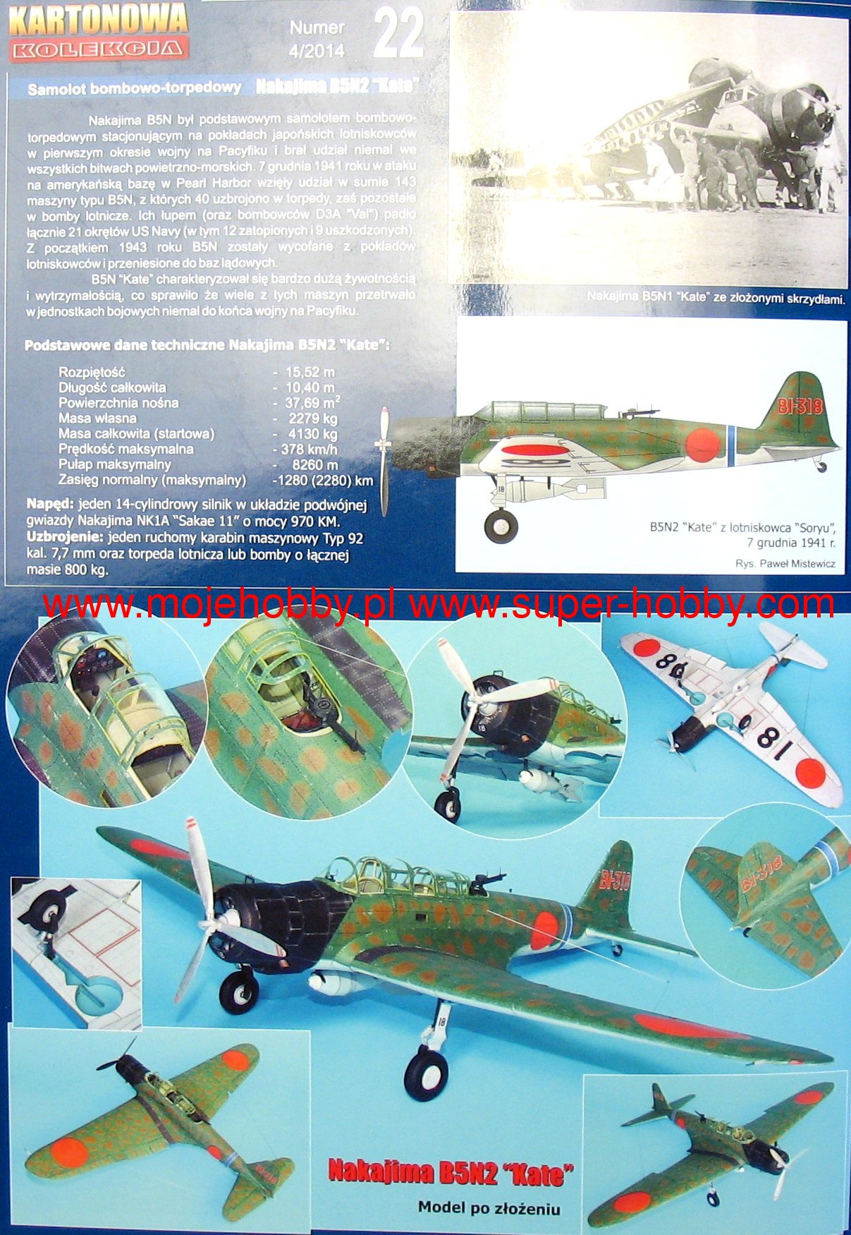 The Nakajima B5N is a Japanese three-man bomber-torpedo aircraft in the low wing configuration of the Second World War. The flight of the prototype took place in 1937, and it was put into service a year later. The B5N was a response to the requirements of the Imperial Navy for the new on-board torpedo plane. Work on the construction, led by Katsuji Nakamura, continued in the years 1935-1937. When the war in the Pacific broke out, the B5N was an aircraft better than competing Allied machines, especially the TBD Devastator. The most widely produced version of the aircraft was the B5N2 Model 12, which was created in December 1939 and which used a new engine - Nakajima NK1A Sakae 11 with a power of 970KM. B5N planes took part in many battles in the Pacific and performed very well in the attack on Pearl Harbor, the Battle of the Coral Sea and the Battle of Midway. From around 1943/1944, these aircraft were transferred to aviation schools and served as kamikaze aircraft. About 1150 copies of all versions were produced. Technical data (version B5N2): length: 10.3m, wingspan: 15.52m, height: 3.7m, maximum speed: 378km / h, rate of climb: 6.5m / s, maximum range: 1992km, maximum ceiling 8260m , armament: fixed-1 Type 92 machine gun cal.7.7mm, underslung-1 Type 91 torpedo weighing 800 kg or the same bomb load.