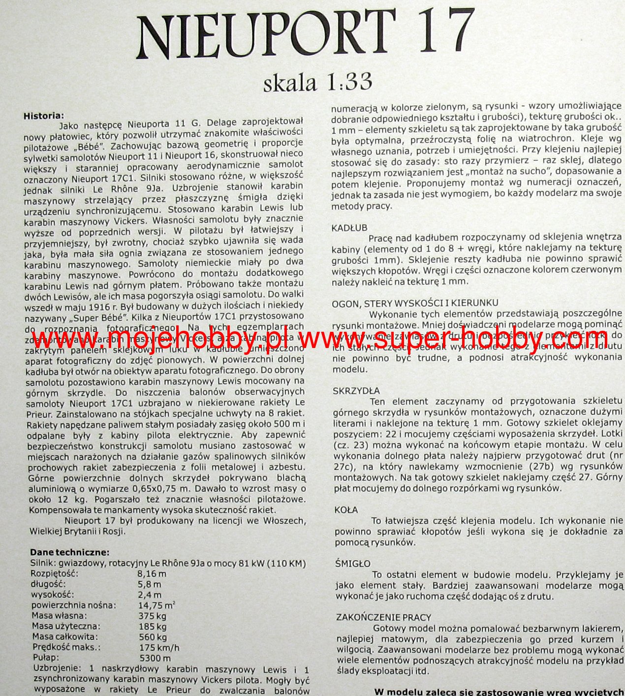 The Nieuport 17 is a French mixed-construction fighter from the First World War. The flight of the prototype took place in January 1916, and the machine entered service two months later. Le Rhone 9J engine with 110 HP was used as the drive. He was the successor of the Nieuport 11 aircraft and had great performance for its time, especially its rate of climb. At the same time, however, due to the delicacy of the structure and low overall strength of the airframe, the plane was difficult to pilot and rather "did not forgive" the pilot's mistakes. It was produced on a large scale and remained the main fighter of the French Army until the end of World War I. Many Allied fighter aces flew on it, including Billy Bishop or Albert Ball. Technical data: length: 5.8 m, wingspan: 8.16 m, height: 2.4 m, maximum speed: 177 km / h, rate of climb: 4.3 m / s, maximum ceiling 5300 m, armament: fixed - 1 Vickers machine gun or Lewis, suspended-to 8 Le Prieur missiles.