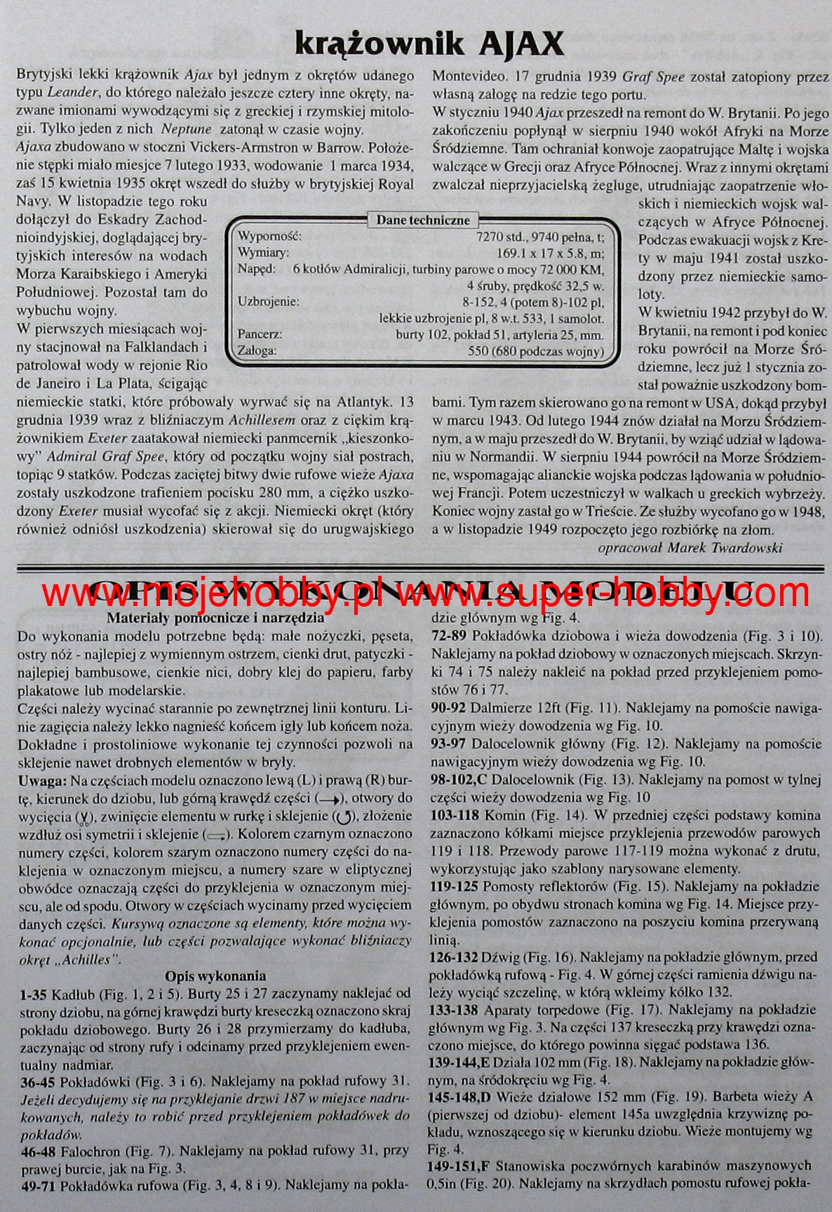 HMS Ajax (22) was a British light cruiser of the Second World War. The keel was laid in 1933, the launch took place in March 1934, and the entry into service with the Royal Navy - in 1935. The total length of the ship at the time of launching was 169 meters, total width 17 meters, and full displacement - approx. 9,750 tons. The maximum speed was around 32-33 knots. The on-board armament at the time of the launch included, among others: 8 152 mm guns, 4 102 mm guns and 8 533 mm torpedo tubes. The unit could operate a single seaplane or a Supermarine Walrus flying boat. HMS Ajax (22) was one of the British light cruisers of the Leander-class. These types of units were built on the basis of the experience gained from the operation of York-class cruisers, and their main task was to protect the convoys against attacks by enemy surface ships. One of the ships of this class, HMS Ajax, was built at the Vickers Armstrong shipyard in Barrow in-Furness, Great Britain. The cruiser took a very active part in World War II, participating in such struggles as the battle at the mouth of La Plata (1939) or near Cape Matapan (1941). The unit also participated in the withdrawal of the Allied troops from Crete in 1941 and protected convoys heading to Malta and besieged Tobruk. HMS Ajax (22) also took part in the Allied landing in Normandy in June 1944. In 1948, HMS Ajax was decommissioned and shortly afterwards sold for scrap.