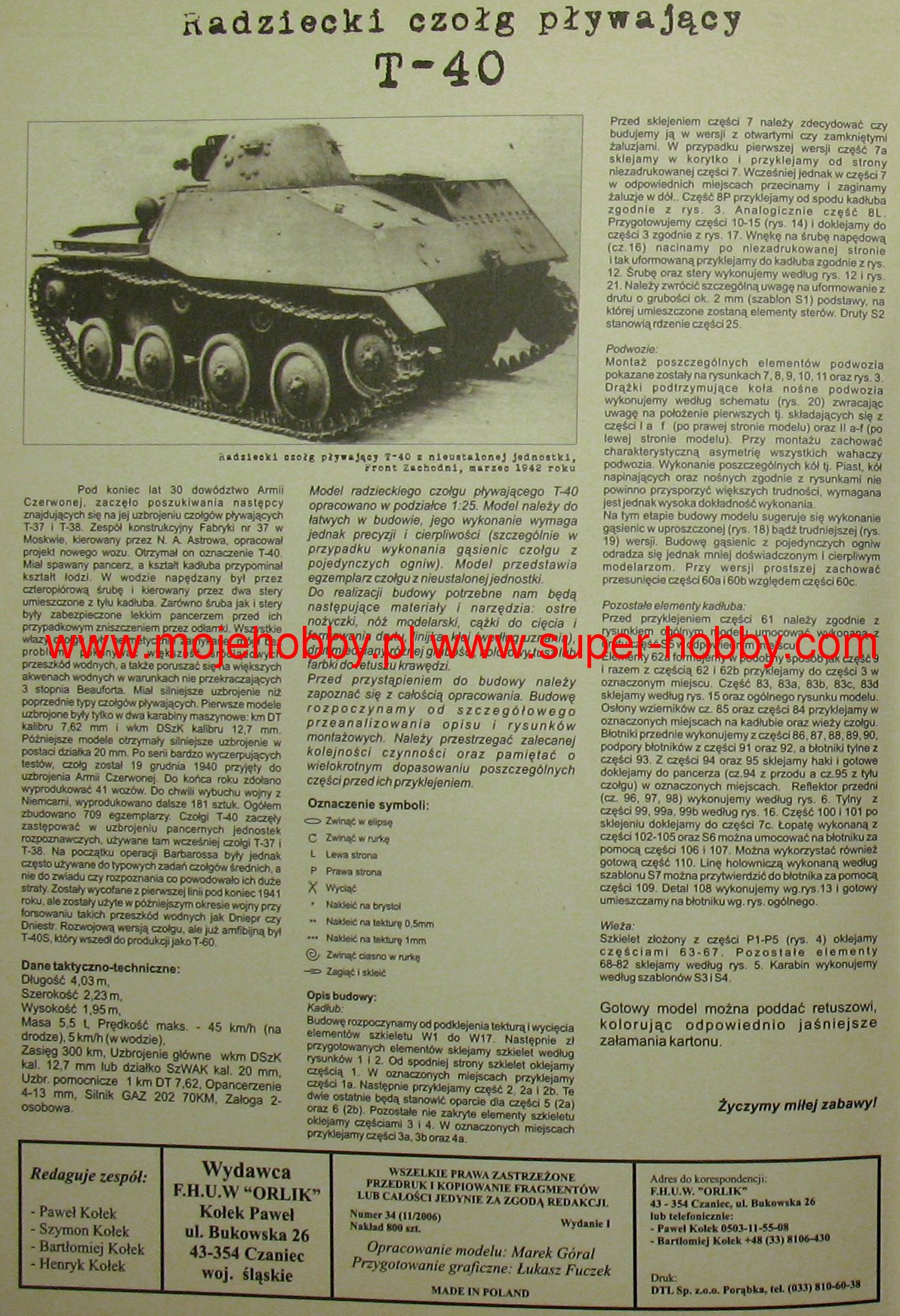The first prototypes of the T-40 light amphibious tank were created in 1939, and a year later mass production started, which ended in 1941 with the production of about 700 examples. The T-40 tank was powered by a 70hp GAZ-202 engine. Its main armament was a 20mm SzWAK cannon (placed in a rotating turret) or - in the first short production series - two 7.62mm and 12.7mm machine guns. The T-40 tank was created as a successor to another light tank of the Red Army - the T-38. During the design and serial production, many components from the T-38 were used. However, the new tank differed from its predecessor in many elements, including: much better ability to overcome water obstacles, better seafaring and, above all, a much more powerful main armament. The T-40 underwent its baptism of fire in the first months of Operation Barbarossa in 1941. However, despite its considerable maneuverability and good driving properties, it suffered high losses due to its use by Soviet armored officers not for reconnaissance and reconnaissance (for which it was designed) but to support attacks by infantry units. Although the T-40 was withdrawn from the front line at the end of 1941, it was used in 1943 and 1944 in the Dniester and Dnieper crossing operations.