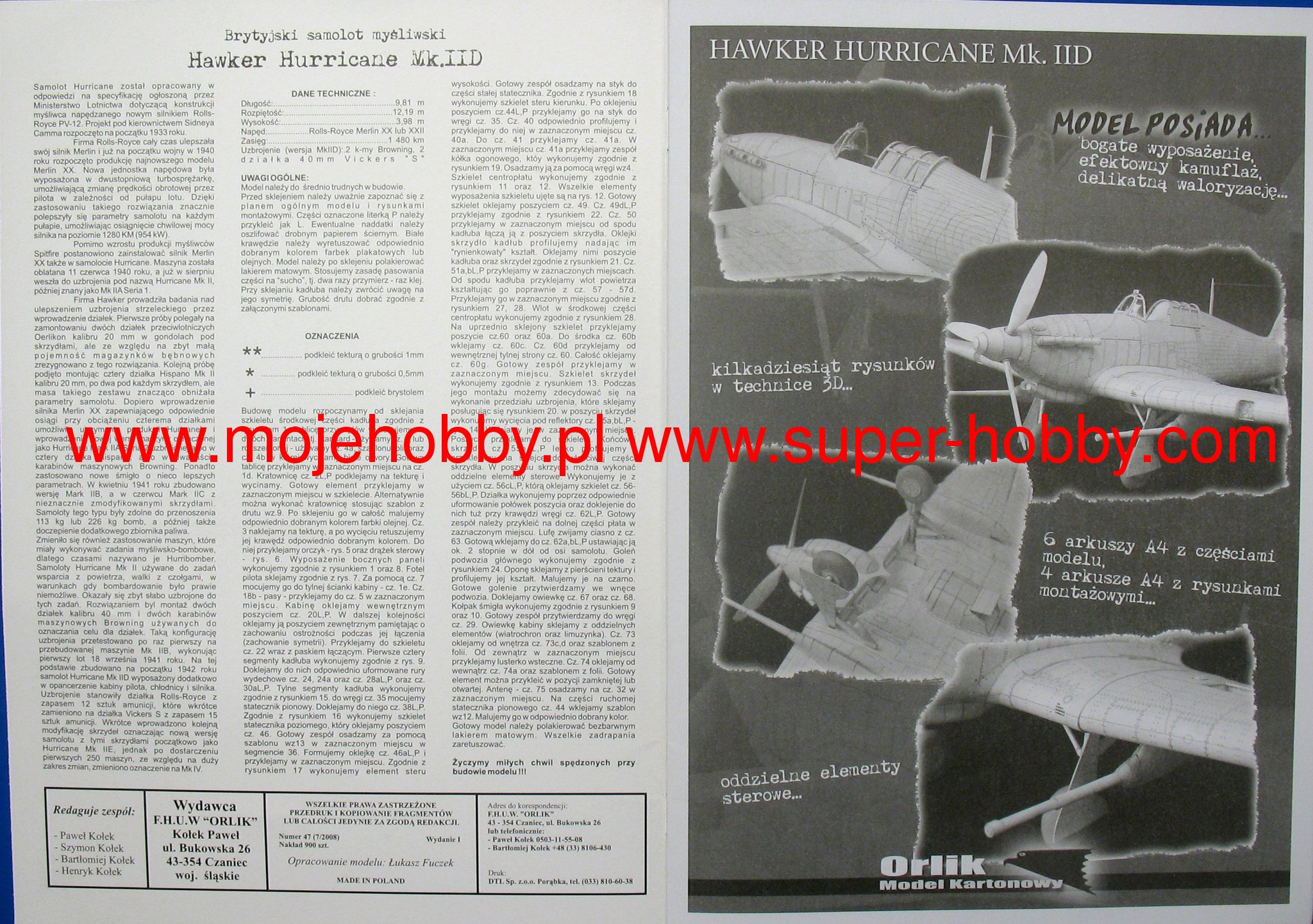 The Hawker Hurricane is a British single-engine single-engine fighter with a metal structure with canvas elements from the Second World War. Acting on all fronts during the Second World War, the Hawker Hurricane earned the name of one of the best and most ubiquitous airplanes of that time, both as a fighter and an attack plane. Undoubtedly, however, the most significant card in the history of this machine was its contribution to the victory of the British in the Battle of Britain in 1940. The plane constructed by Sydney Camm at the request of the Ministry of Defense was supposed to become the main force of the British air fleet. For the first time, a prototype of an aircraft powered by a Rolls-Royce Merlin Mk.II engine took off on November 6, 1935, piloted by Georg Bulman. The tests were excellent and it was quickly decided to order 600 machines, the first of which entered service with the 111th squadron of the RAF in December 1937. When Great Britain declared war on Nazi Germany on September 3, 1939, the RAF had 19 ready-to-fight Hurricane squadrons, which started their military career with operations in France and Norway. During the course of the war, several versions of this very successful plane were created. The first mass-produced version was the Mk.I with the Merlin III engine. From 1940, the Mk.II versions with the new Merlin XX engine with a capacity of 1280 HP began to be delivered to the units. It was this version, as the first variant of Hurricane, that performed primarily assault and battlefield support tasks. Its best variant was the Hurricane Mk.IID, used by min. in the North Africa campaign in 1942. The third version is the Hurricane Mk.IV with the new Merlin 24/27 engine, 1620HP. It served as an assault machine armed with bombs, unguided missiles and Vickers S cannons until 1944. A sea variant (Sea Hurricane) was also produced, which served on aircraft carriers and on specially adapted merchant ships (Sea Hurricane Mk.IA). Technical data (Mk.IIC version): length: 9.84m, wingspan: 12.19m, height: 4m, maximum speed: 547km / h, rate of climb: 14.1m / s, maximum range: 965km, maximum ceiling 10,970m Armament: fixed - 4 20mm Hispano Mk.II cannons, sling - up to 460 kg of bombs.