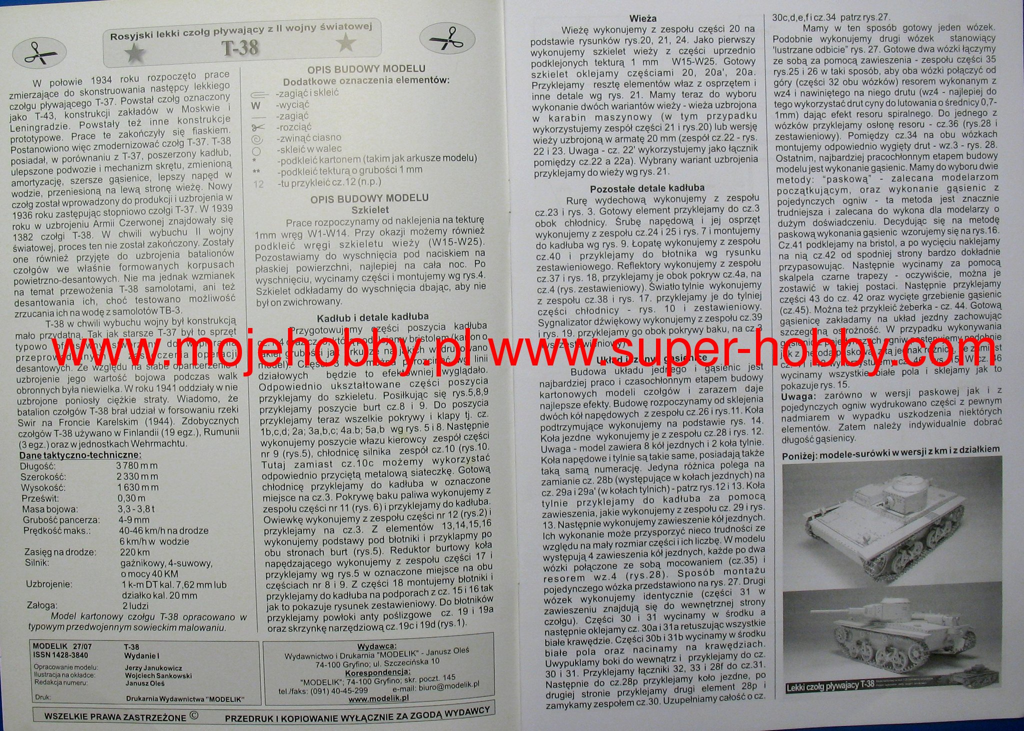 The T-38 is a Soviet tankette (light tank) from the interwar period and World War II. The drive was provided by a single GAZ-AA or GAZ-M1 carburetor engine with a capacity of 40 or 50 HP, respectively. The first prototypes of the vehicle were built in 1935, and serial production was carried out in 1936-1939. About 1,380 vehicles of this type were built in its course. The armament consisted of a single 7.62 mm DT machinegun mounted in a rotating turret. The T-38 was developed as a far-reaching development of the T-37 floating tank. Compared to the original, the vehicle had an enlarged hull, significantly improved undercarriage, wider tracks and better water propulsion. Several development versions were created in the course of serial production, for example: the T-38M (a prototype vehicle with a different steering mechanism), the T-38M2 (a tank with a GAZ-M1 engine) or the SU-45 (a prototype of a self-propelled gun). The T-20 Komsomolets artillery tractor was also developed on the T-38 chassis. The T-38 vehicles replaced the T-37 vehicles in the reconnaissance units of the Soviet armored and motorized divisions. Tanks of this type took an active part in the first period of the war with Germany in 1941-1942, suffering considerable losses. A certain number of them were taken over by German, Romanian and Finnish troops.