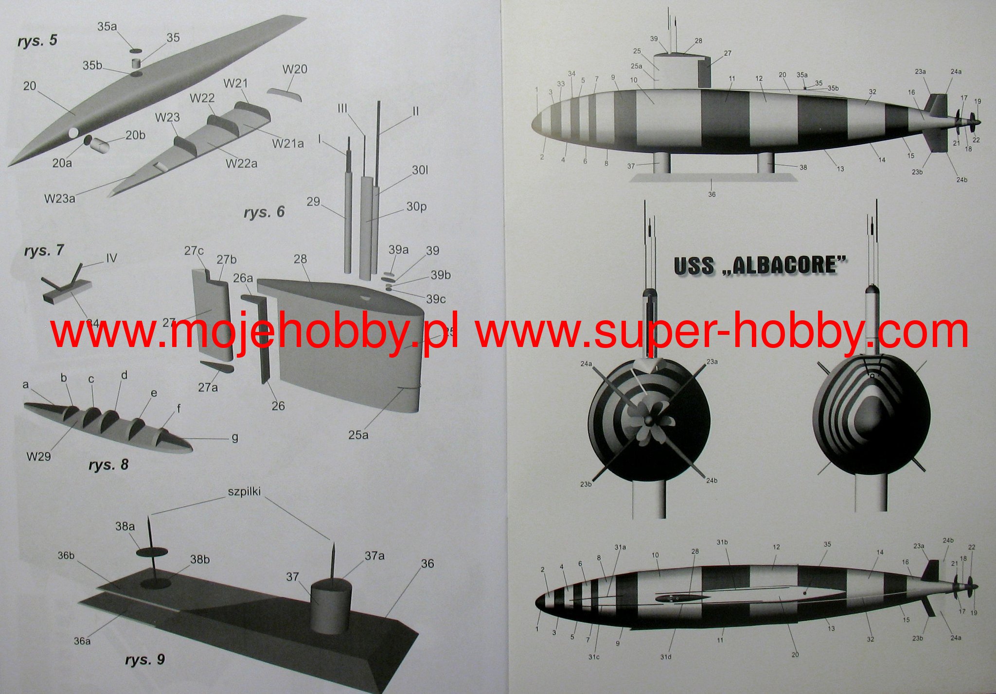 USS Albacore (AGSS-569) is an American experimental diesel-electric submarine from the Cold War period. The keel for this unit was laid in 1952, the launch took place in August 1953, and commissioning took place in December of the same year. The length of the ship was 62.14 m, width 8.31 m, and the underwater displacement - approx. 1,800 tons. The maximum underwater speed was over 30 knots. The ship did not have any on-board weapons. The USS Albacore was built as a kind of submarine laboratory of the US Navy, on which various hydrodynamic properties of the submarine were tested. The shape of the hull of this unit turned out to be the most revolutionary, known as the drop hull or the Albacore hull. It differed radically from the shape of the hulls used during World War II, and at the same time it turned out to be very advantageous in terms of hydrodynamics and allowed for the development of previously unattainable underwater speeds of 30 knots and more! It turned out to be a direct inspiration for Skipjack-class units and clearly influenced many later American fighter submarines. Various stern and bow rudder systems as well as various swim control systems were also tested on the USS Albacore. This revolutionary ship has been serving as a museum since 1984.