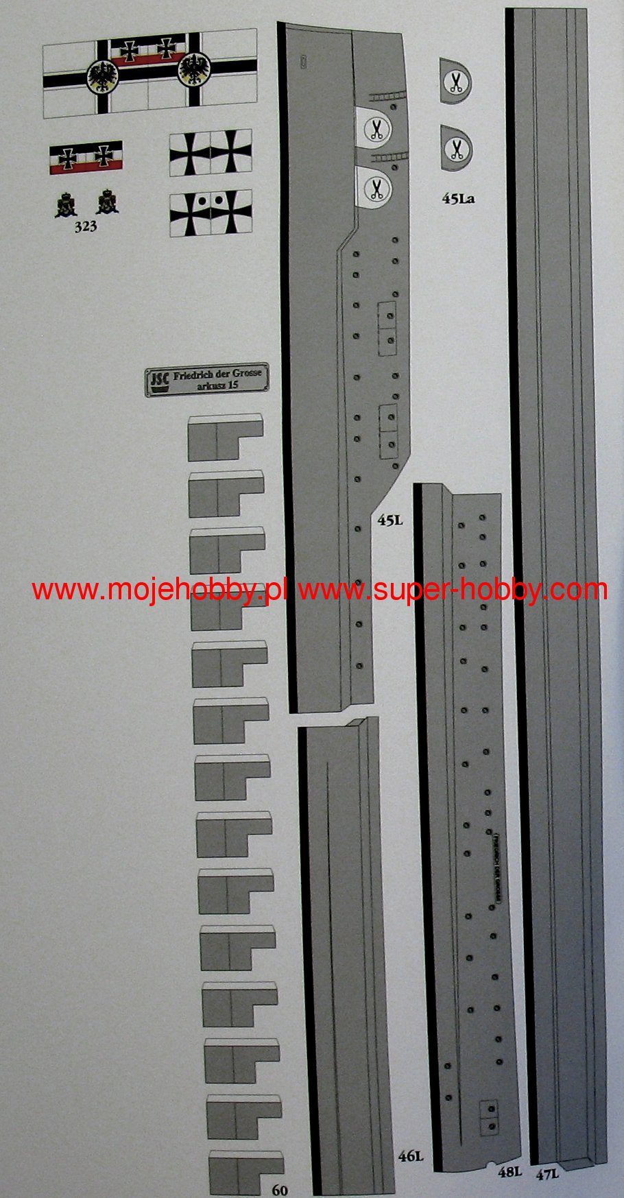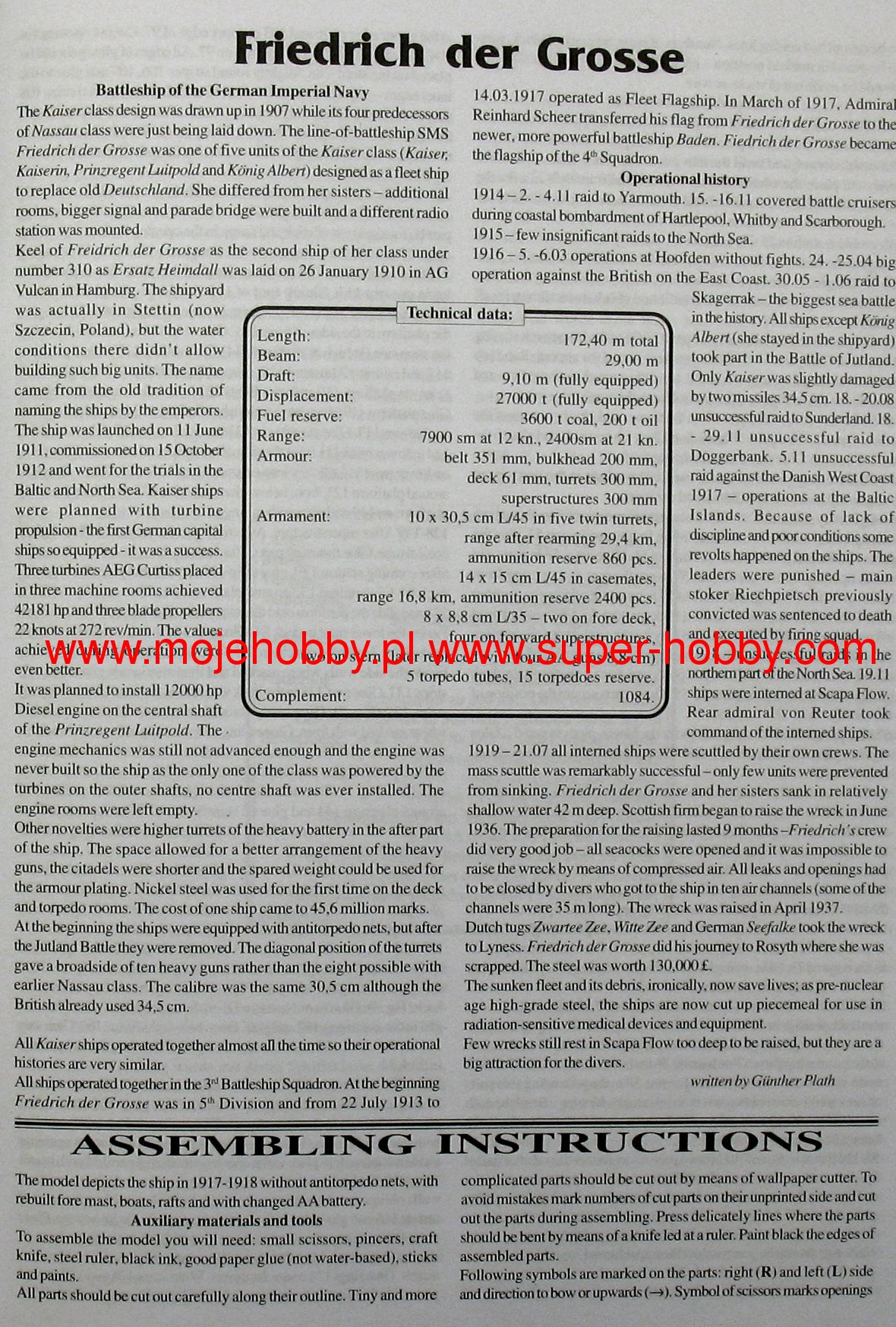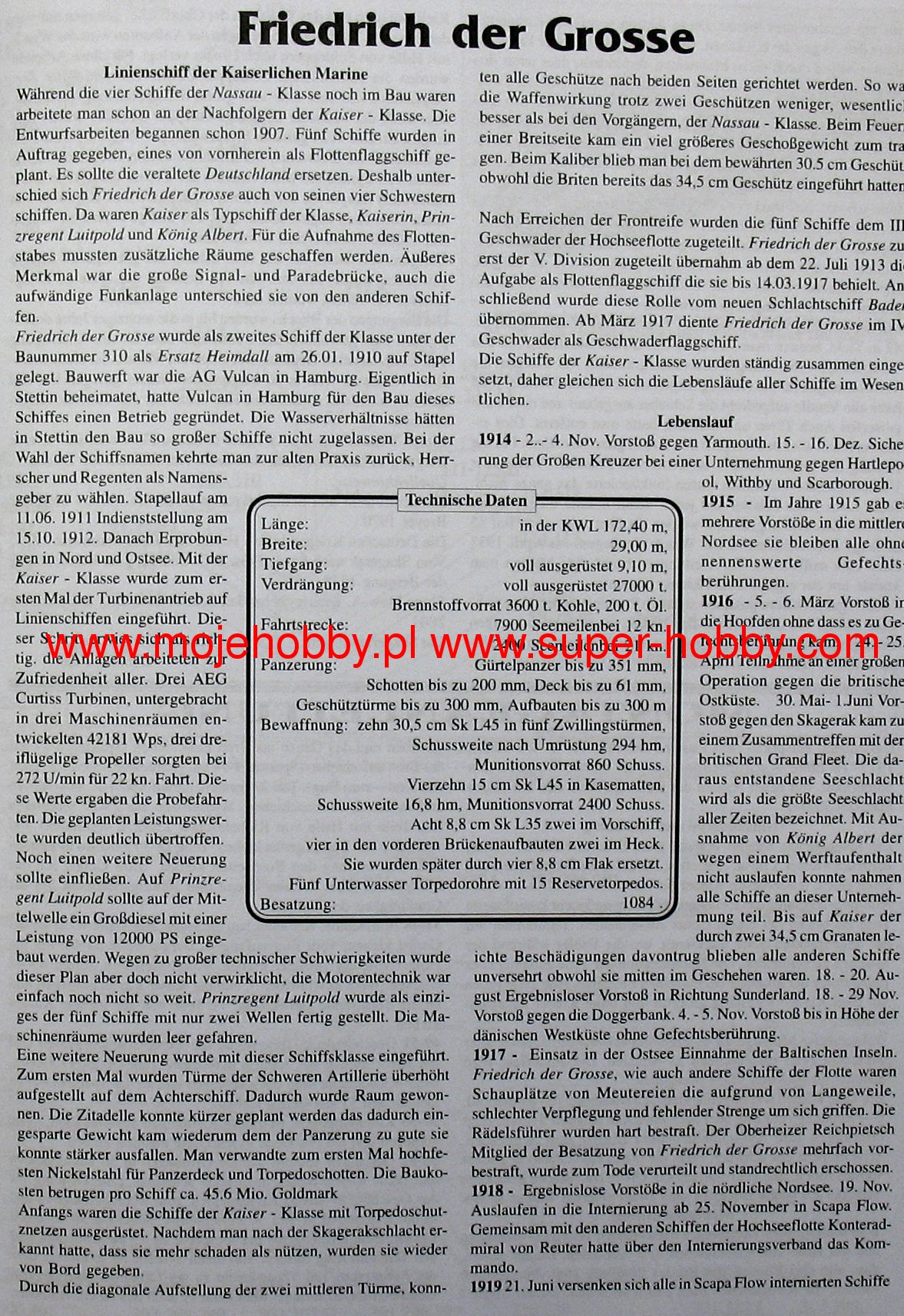 SMS Friedrich der Grosse was a German battleship (so-called dreadnought) from the First World War. The keel for this unit was laid in 1910, the launch took place in June 1911, and entry into service in Kaiserliche Marine - in 1912. The length of the ship was 172.4 meters and a width of 29 meters. Full displacement reached about 27,000 tons, and maximum speed - to about 22-23 knots. The deck armament, at the time of launch, consisted of 10 305 mm guns placed in five turrets of two guns, 14 150 mm guns, 12 88 mm guns, and 5 torpedo tubes. SMS Friedrich der Grosse was one of five Kaiser-class battleships. They were the first German dreadnoughts powered by steam turbines. Compared to the predecessors of the types of German battleships (Helgoland and Nassau), they received a new layout of the main artillery, which allowed for a broadside salvo from all guns. SMS Friedrich der Grosse was built at the AG Vulcan shipyard in Hamburg. The ship took part in many activities of the German fleet in the North Sea during the First World War. First of all, he participated in the Battle of Jutland (1916), during which he did not suffer any serious damage. After the end of the war, SMS Friedrich der Grosse was interned at the British base at Scapa Flow, where he was sunk by his own crew on June 21, 1919. A few years later, it was excavated by the British and scrapped in 1936-1937.