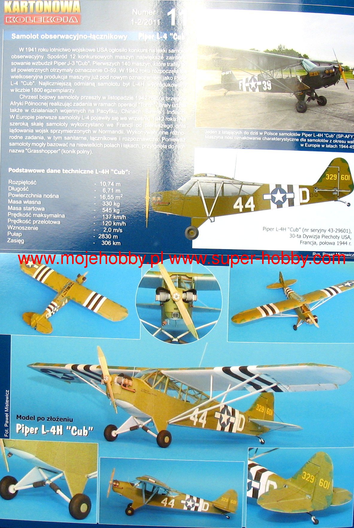 The Piper L4 (Piper Cub) is an American light transport and observation aircraft in the high wing configuration, with a mixed structure with a fixed landing gear and classic tail from the Second World War. The roots of the L4 go back to the civilian prototype called E-2, which first took to the air in September 1930, and which was mass-produced in the 1930s and received numerous development versions (including J-2, J-3 or J-5). In 1941, the J-3 version was adapted to the USAF's needs and designated the O-59, and eventually the L4. Several development versions were created, the first of which is the L4A, better adapted to the observation of the battlefield by increasing the cabin glazing. A lot of engines were used as the drive, including Continental A-65-8. The machine was widely used by the US Army in Europe as the basic liaison and battlefield observation aircraft. It was used both in North Africa and later in Italy and Normandy. The machine was nicknamed Grasshopper. About 20,000 were made of all versions of this plane! Specifications: length: 6.83m, wingspan: 10.74m, height: 2.03m, maximum speed: 140km / h, climb speed: 2.3m / s, practical ceiling: 3500m, maximum range: 354km.