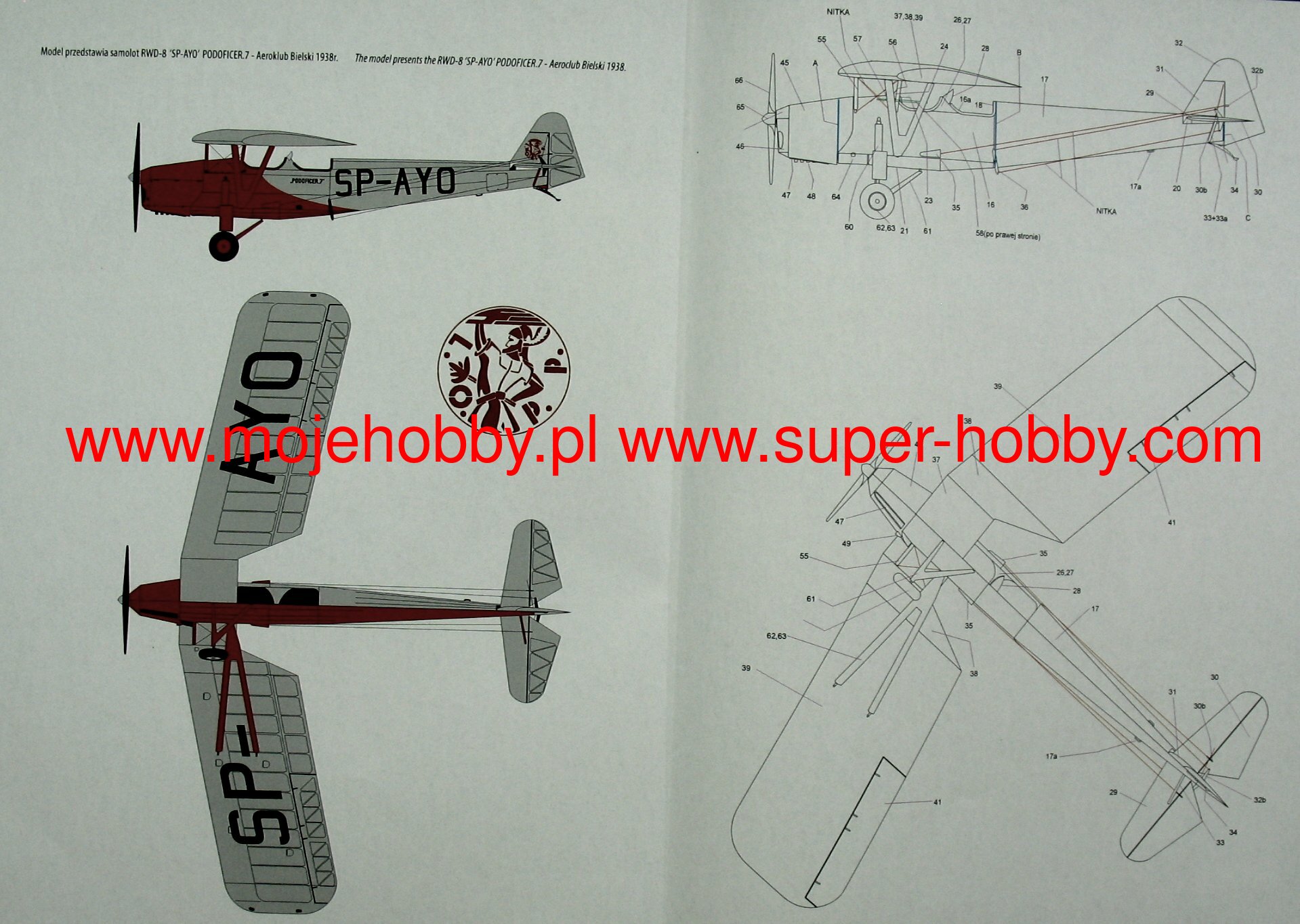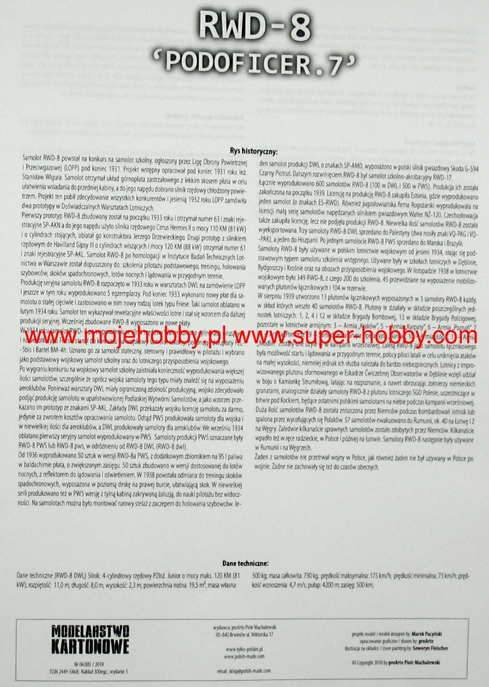 The RWD-8 was a Polish training plane with a mixed structure, in the high wing (so-called umbrella) system, with a classic, fixed undercarriage. The drive in the basic version was provided by a single engine PZInż Junior with a power of 120 HP. The prototype flight took place in 1933. Serial production continued in the years 1934-1939, ending with the production of about 550 aircraft of this type. The machine had no fixed armament. Originally, the RWD-8 was developed for a competition announced by the Air and Gas Defense League for a new initial training aircraft. Initial work on the RWD-8 at the Experimental Aviation Workshop in Warsaw was carried out by engineer Stanisław Wigura, and the first prototype was ready in 1933. He definitely won the competition, proving to be a very easy-to-pilot machine, ensuring a lot of flight safety, good working comfort for the student and instructor, as well as being relatively cheap. The Polish army very quickly became interested in the project, which in 1934 placed an order for these planes, which - in the version for the army - were produced at the PWS plant in Biała Podlaska. RWD-8 aircraft in the civilian version served in numerous flying clubs throughout the country. However, in the military version, they were intended for the initial training of pilots. They were used by aviation schools in Dęblin, Bydgoszcz and Krosno. During the September campaign, the RWD-8 also served as liaison machines. After September 1939, the RWD-8 planes were delivered to Romania, Finland and Hungary.