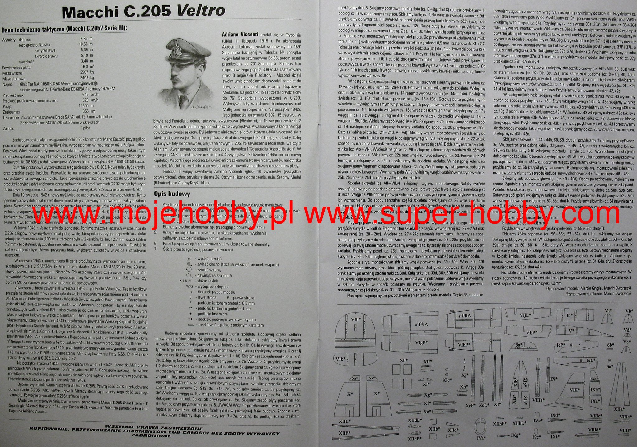 The Macchi MC 205 Veltro (Italian greyhound) is an Italian, single-engine, metal low-wing fighter from the Second World War. The flight of the prototype took place in April 1942. Mass production started in the same year and continued until 1944, ending with the production of 262 copies. The MC205 is a modification of the MC202 aircraft, consisting mainly in the replacement of the power unit with the Daimler-Benz DB.605 engine with a capacity of 1475KM and a significant reinforcement of the armament. The MC205 turned out to be a very successful aircraft, comparable to the Me-109G or Spitfire Mk.IX. Unfortunately, the problems of Italian industry in the declining phase of the war prevented larger mass production. Technical data: length: 8.85m, wingspan: 10.58m, height: 3.05m, maximum speed: 640km / h, maximum range: 950km, maximum ceiling 11500m, armament: fixed - 2 Breda-SAFAT machine guns cal. 12.7mm and two 20mm MG151 cannons, suspended - up to 320 kg of bombs.