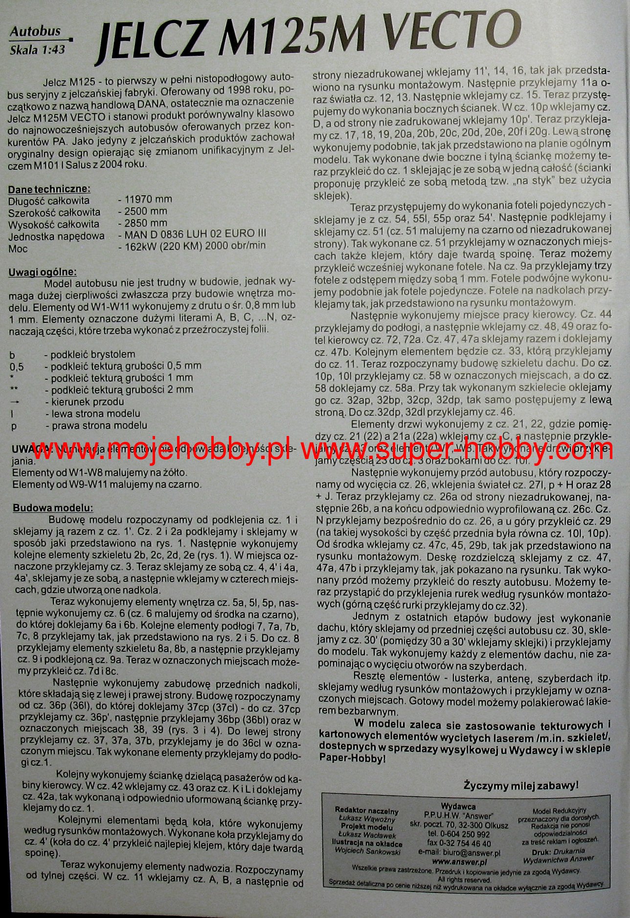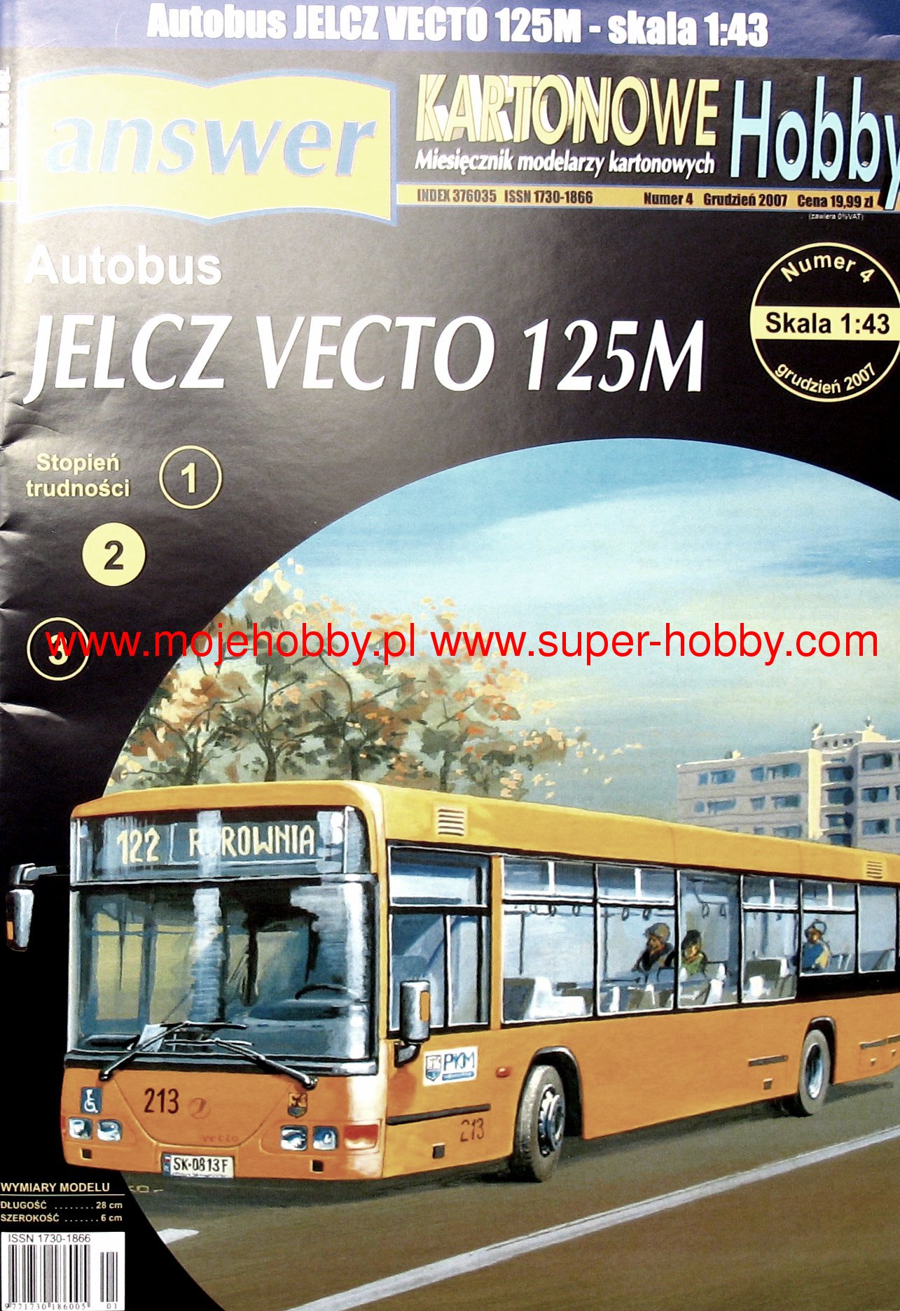 Jelcz M125M Vecto is a Polish, low-floor city bus, which was presented for the first time in 1998. Its serial production was carried out in the years 1998-2006 and took place in Zakłady Samochodowe Jelcz. In total, 71 copies of this bus were created in its course. The M125M Vecto model was created from scratch and was not directly structurally based on the previous vehicles from Jelcz. Compared to buses previously produced by Zakłady Samochodowe, Jelcz differed primarily in the drive unit, which was the MAN D0826 engine with 220 HP. The walls were also completely new: the front and rear walls were made of plastics with large glazing. The comfort of the driver's work and passengers' travel has also been significantly improved. In 2001, the model with the MAN D0836 engine emits less exhaust gas and with slight changes in the design. Two years later, a model powered by a CNG engine appeared. M125M Vecto buses went to the public transport fleet in cities such as Inowrocław, Katowice and Poznań.