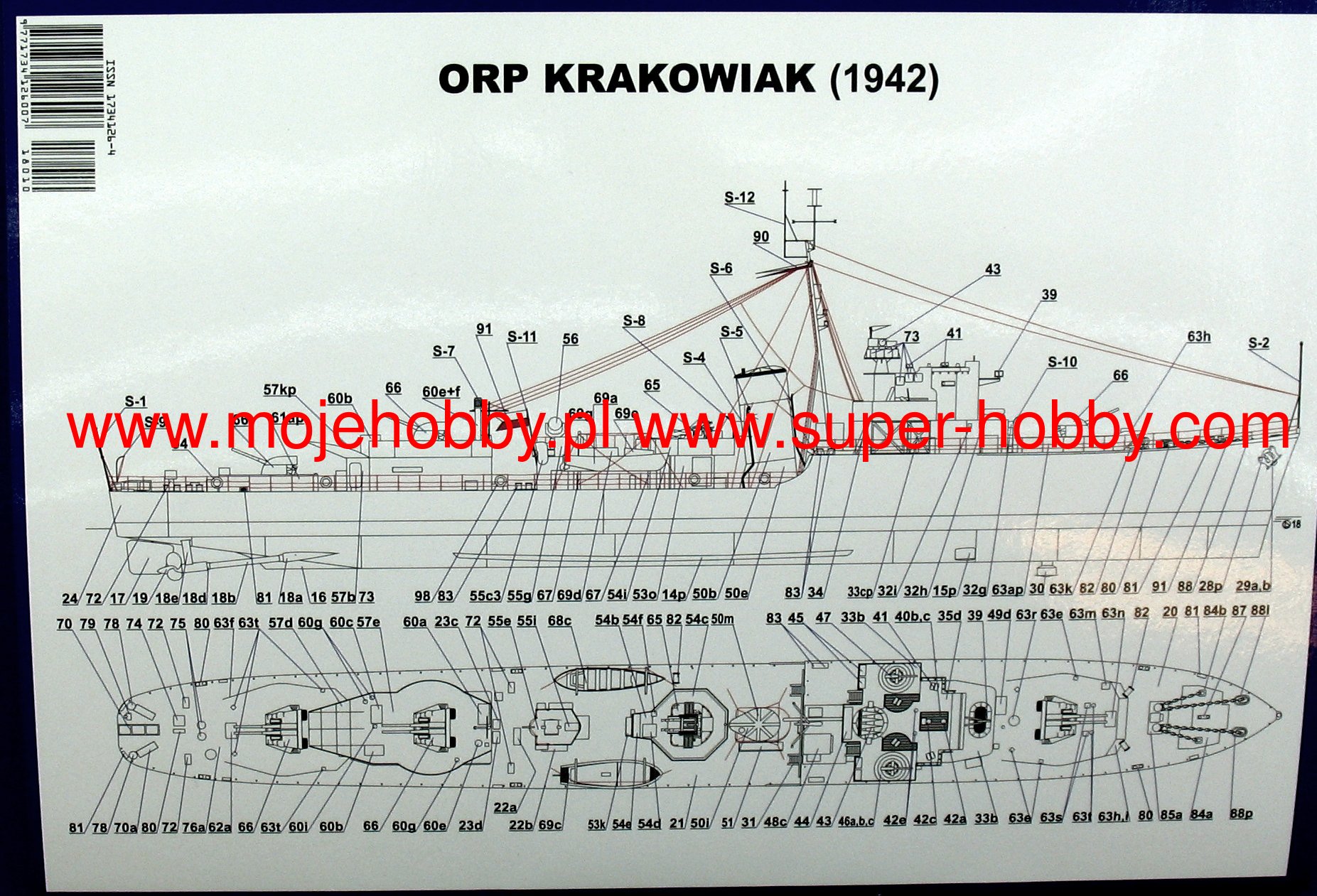ORP Krakowiak (original name: HMS Silverton) was a British and later Polish destroyer from the Second World War. The keel for this unit was laid in 1939, and the launch took place in December 1940. The total length of the ship at the time of launching was 85.3 meters and a width of 9.6 meters. Full displacement reached approx. 1,490 tons, and the maximum speed was approx. 27 knots. The armament included 6 102 mm guns in three twin turrets, 4 20 mm Oerlikon cannons and 2 Thornycroft depth bomb throwers. ORP Krakowiak was one of 36 Hunt II-class destroyers. This type of units was built in connection with the Royal Navy's desire to acquire two basic types of destroyers in the late 1930s: the first type was to be a typical destroyer with strong weapons, adapted to work with other, larger ships, and the second type - the Hunt - it was to be smaller and dedicated to escort tasks and ZOP activities (fighting submarines). The Hunt II type was a development of the Hunt I type. Compared to its predecessor, it was primarily characterized by stronger anti-submarine weapons and an increased width. HMS Silverton, after it entered service in the Royal Navy, was handed over to the Polish Navy in the first half of 1941. Under the Polish flag, it participated primarily in the protection of Atlantic convoys, but at the end of December 1941 took part in Operation Anklet. In 1943 ORP Krakowiak operated in the Mediterranean, supporting, inter alia, the Allied landing in Sicily (Operation Husky). He also supported Royal Navy units in November 1943 during their battles for the Dodecanese. In June 1944, he participated in the Normandy landings. In 1946, ORP Krakowiak was returned to the Royal Navy and was renamed HMS Silverton. He was decommissioned in 1959.