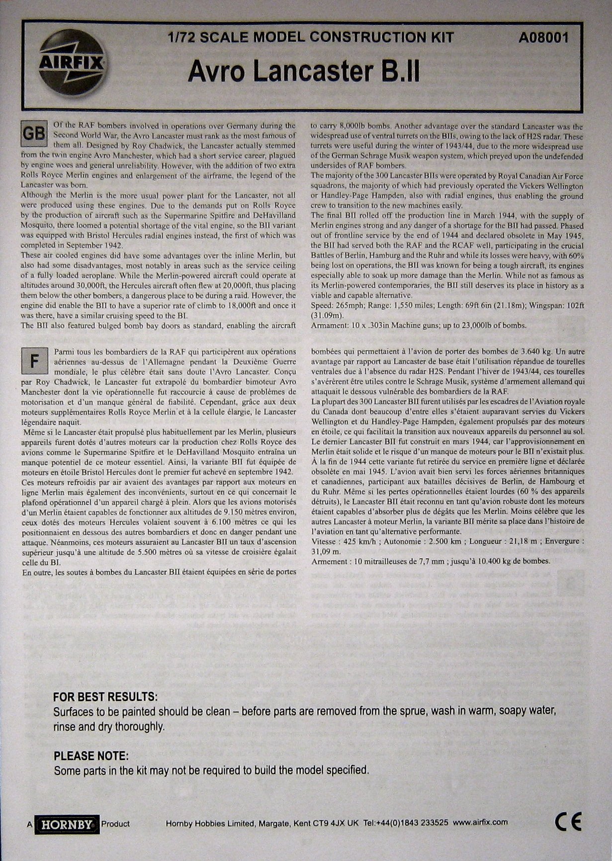 The Avro Lancaster is a British, four-engine, medium-wing metal structure strategic bomber from the Second World War. The prototype flight took place in January 1941 and mass production started in the same year. The basis for the creation of the Lancaster was the Avro Manchester plane. As a drive served min. four Rolls-Royce Merlin XX V-engines with a power of 1280 HP each (Mk.I) or Bristol Hercules VI engines with a power of 1737 HP each, although other engines were also used. Serial production took place at the Avro, Metropolitan-Vickers, Armstrong Whitworth, Vickers Armstrong and Victoria Aircraft plants and by the beginning of 1946, 7377 aircraft were produced. There were four main versions of the Avro Lancaster (Mk.I, Mk.II, Mk.III and Mk.X) that were externally similar to each other. The Avro Lancaster was the RAF's primary strategic bomber, and at the same time earned a reputation for being the best. It was easy to pilot, had high lifting capacity and was characterized by a long durability of the structure. It happened that the bomber was able to complete the mission and return to base, even despite the failure of one engine. The planes entered service in December 1941 and served at the end of the war, primarily performing strategic bombing tasks. It was the Lancasters of the RAF 617 Bomber Squadron that were used in May 1943 to damage the Ruhr water dams. Technical data (Mk.I version): length: 21.11m, wingspan: 31.09m, height: 6.25m, maximum speed: 456km / h, maximum range: 4073km, maximum ceiling 6500m, armament: fixed - 8 rifles 7.7mm Browning machine guns, mounted - up to 6300 kg of bombs or one Grand Slam bomb (10000 kg) after modifying the bomb chamber.