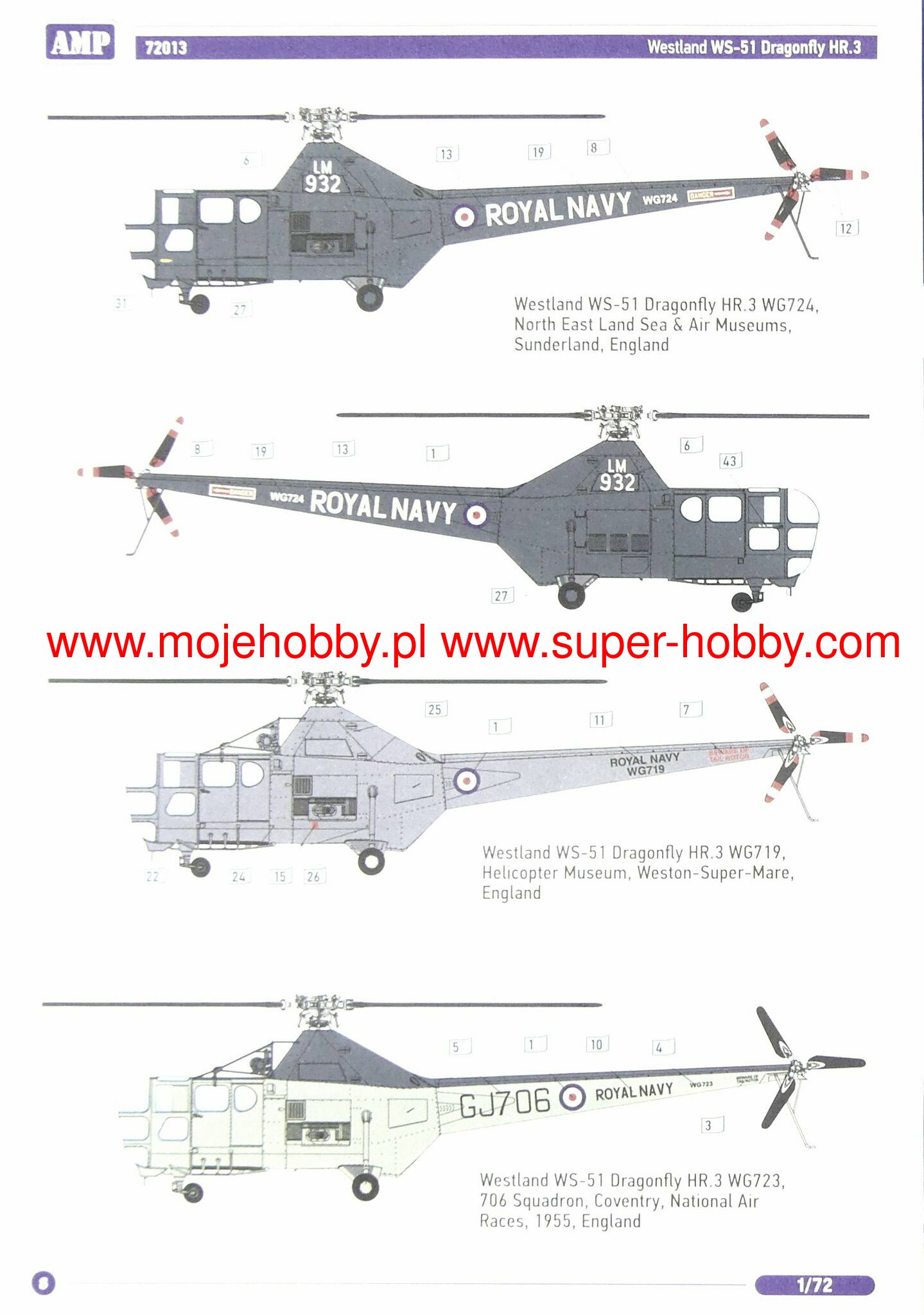 Westland WS-51 Dragonfly was a multipurpose metal helicopter of British production with a fixed, three-support landing gear in a classic arrangement with a main rotor and a tail rotor on the beam. The flight of the first prototype took place in 1948, and serial production continued in 1949-1953. A total of about 135 copies of this helicopter were created. The machine, in the Mk. IA, was 17.54 meters long, and the main rotor diameter was approx. 15 meters. The drive was provided by a single Alvis Leonidas 521/1 engine with 520 HP. The decision to manufacture Dragonfly machines was made at Westland Aircraft shortly after the end of World War II and was to introduce the plant to the emerging helicopter market. However, in order to minimize the time spent on research and development and to minimize the risk of failure, Westland Aircraft purchased a license from Sikorsky for the Sikorsky H-5 machine. And it was this helicopter, after many modifications, was called Westland WS-51 Dragonfly in Great Britain. The two helicopters mentioned differed primarily in the power unit used, but also in many mechanical elements. The Westland WS-51 Dragonfly helicopter was operated by the Royal Navy as a rescue machine (e.g. HR1. And HR.3 versions) and by the RAF in the same role (HC.2 and HC.4 versions). The machine also hit the civilian market under the designation Westland-Sikorsky WS-51 Dragonfly Mk.IA and B. Units on the civilian market differed from each other in the power unit used.