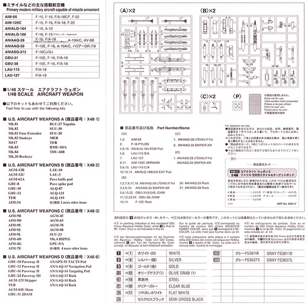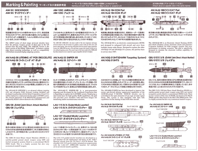 Описание Набор Hasegawa Aircraft Weapons: E (No. 36117) в масштабе 1:48 предназначен для детализации сборных моделей американских самолетов. Включает высокодетализированные пластиковые компоненты для воссоздания американских ракет "воздух-воздух" и целеуказательных контейнеров (Target Pods), используемых ВВС и ВМС США. Состав набора: - Ракеты "воздух-воздух" (например, AIM-9 Sidewinder, AIM-7 Sparrow, AIM-120 AMRAAM). - Целеуказательные и навигационные контейнеры (например, AN/AAQ-14 LANTIRN, AN/AAQ-28 LITENING, AN/ASQ-228 ATFLIR). - Пилоны и крепления для установки на модели. - Подходит для самолетов, таких как F-14 Tomcat, F-15 Eagle, F-16 Falcon, F/A-18 Hornet. Особенности: - Точный масштаб 1:48, совместим с большинством моделей американских самолетов этого масштаба. - Высокая детализация с чёткой проработкой ракет и контейнеров. - Простая сборка, подходит для моделистов всех уровней подготовки. - В комплекте инструкция с рекомендациями по сборке и покраске. Рекомендации: - Для сборки необходимы клей и краски (приобретаются отдельно). - Совместим с моделями Hasegawa, Tamiya, Revell и другими брендами в масштабе 1:48. - Рекомендуемый возраст: 14+.