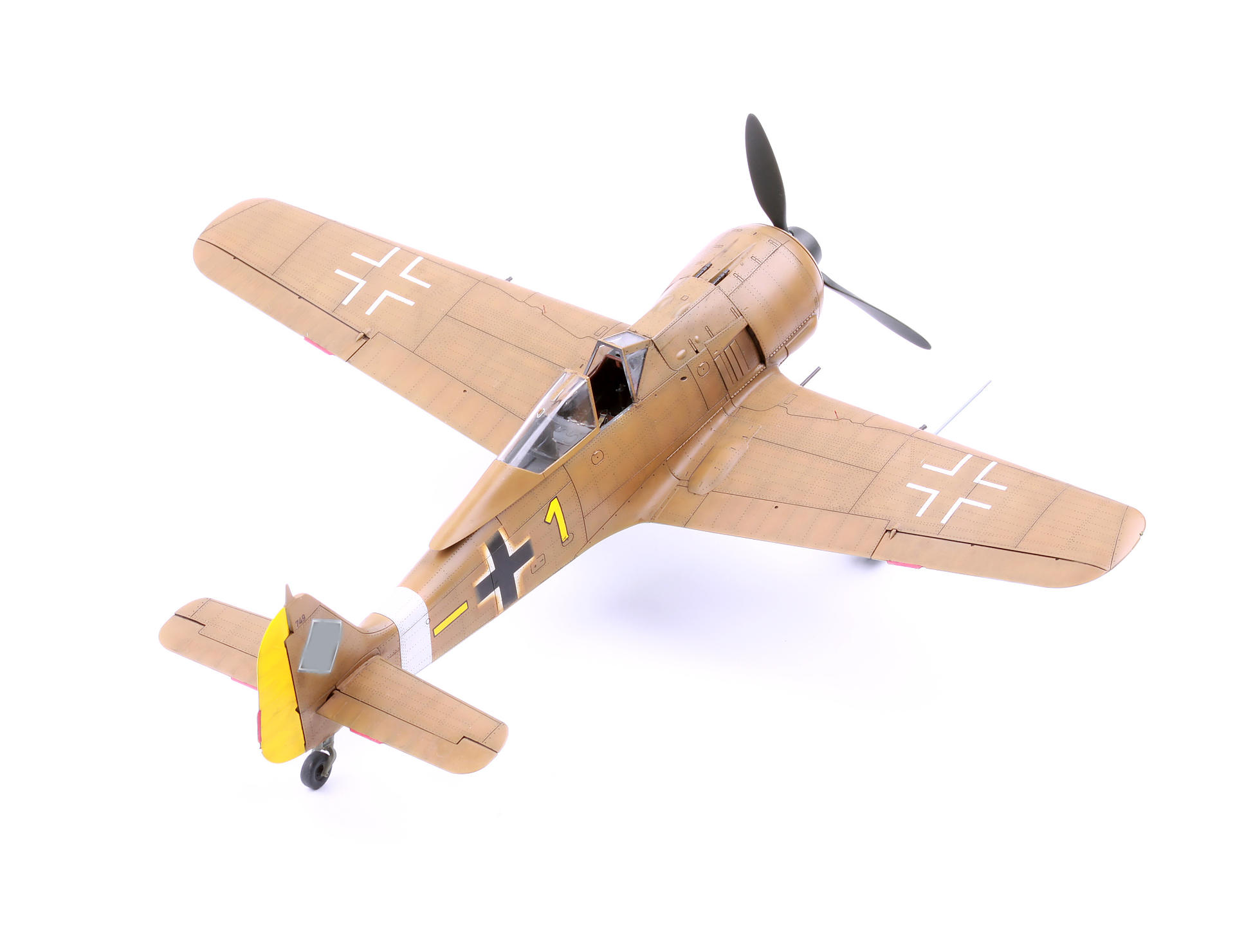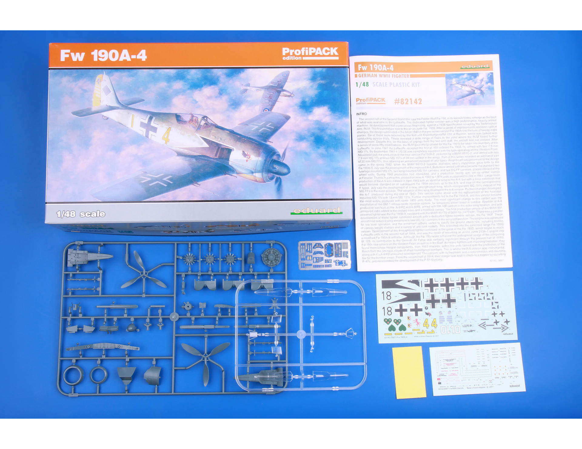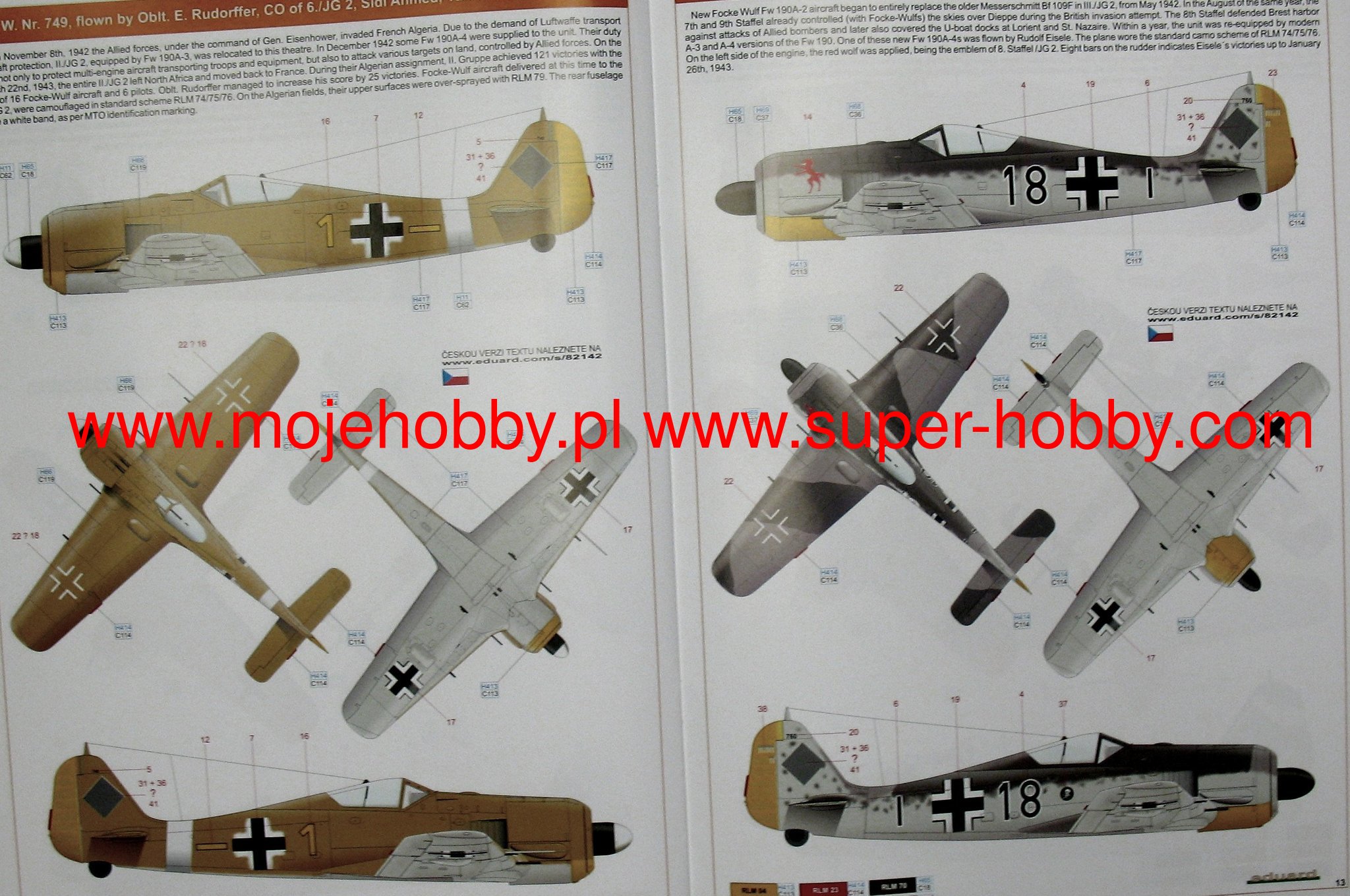 The Focke-Wulf Fw-190 is a German, single-engine, full-metal fighter aircraft with a covered cabin in the low wing design of the Second World War. The pilots considered the Fw-190 to be a better aircraft than the Messerschmitt Bf-109. A self-supporting low wing with a working Fw-190 coating was commissioned by the Luftfahrtministerium, assembled in the fall of 1937. Kurt Tank submitted two propulsion proposals - the first with a liquid-cooled Daimler-Benz DB 601 engine, and the second with the new BMW 139 radial engine. The latter was chosen, and the work started in the spring of 1938 was headed by Obering R. Blaser. The first prototype of the Fw-190V1 was ready in May 1939, and it was flown in Bremen on June 1, 1939 by Captain Hans Sander. The second prototype, the FW-190V2, armed with two MG131 and two MG17 machine guns - all 7.92 mm caliber, was flew in October 1939. To reduce aerodynamic drag, both were equipped with a tunnel air inlet in the propeller cap, but problems with overheating of the engine resulted in a return to the proven NACA shield design. Before the tests of these prototypes began for good, the decision was already made to replace the BMW 139 engine with a stronger, but longer and heavier BMW 801. It required many changes, strengthening the structure and moving the cabin back, which later became a source of problems with the center of gravity. The advantage was the removal of problems with exhaust gas permeation and overheating of the cabin interior due to its direct vicinity to the BMW 139 engine. The third and fourth prototypes were abandoned, and the Fw-190V5 with the new engine was completed at the beginning of 1940. Later, it received wings with a wingspan enlarged by one meter (from the original 9.5 m), which made it 10 km / h slower, but it increased the rate of climb and improved maneuverability. It was marked Fw-190V5g, and the variant with the shorter wing was Fw-190V5k. The first seven machines of the Fw-190A-0 information series had a short wing, the rest - a longer one. The first operational unit equipped with the Fw-190 - 6./JG 26 stationed at Le Bourget, declared its operational readiness in August 1941 and from the first meeting of the new fighter with the British Supermarine Spitfire, its advantage over them became apparent. During the war, a dozen or so versions of this great plane were created. The machines of the "A" version, along with a dozen or so modernizations, served as fighter planes. The versions marked "B" and "C" were only prototypes of high-altitude fighters intended for fighting strategic bombers, but they did not enter into serial production. The "D" variant, as the only one of the Fw-190s, was powered by the new 1750HP Jumo 213A engine and was the German response to the P-51 Mustang. The new engine extended the fuselage by several dozen centimeters. This variant also performed mainly hunting and high-altitude fighter tasks. Numerous variants of the "F" version were used as fighter-bombers as direct support of the battlefield. The "G" version played the same role as the "F" version, but had a greater range. During the entire war, over 20,000 copies of this one of the best fighters of World War II were produced. Technical data (version Fw-190A-8): length: 9m, wingspan: 10.51m, height: 3.95m, maximum speed: 656km / h, rate of climb: 15m / s, maximum range: 800km, maximum ceiling 11410m , armament: fixed-2 MG131 13mm machine guns and 4 MG151 20mm cannons (2 MG 151 / 20E cannons for the D-9 version). 3_edu82142_instruction_sheet.pdf
