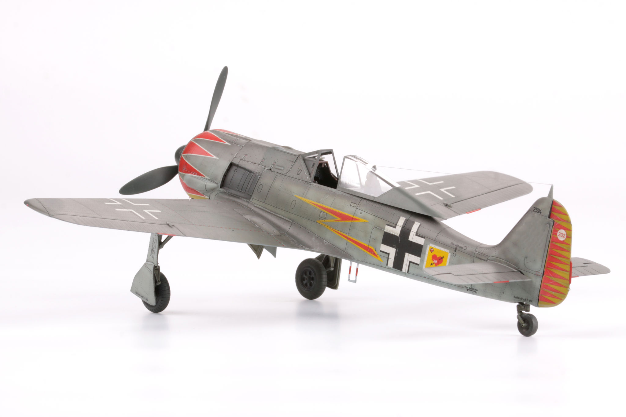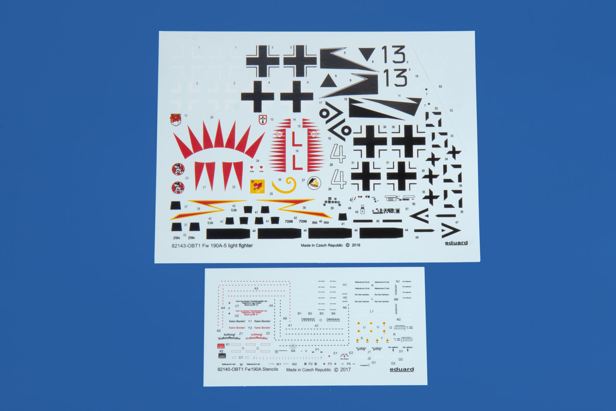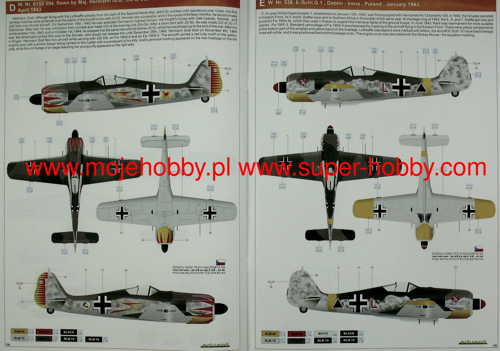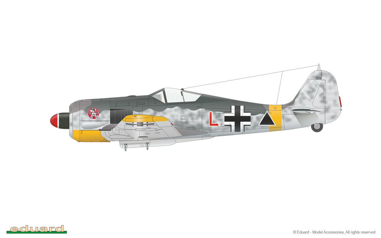 The Focke-Wulf Fw-190 is a German, single-engine, full-metal fighter aircraft with a covered cabin in the low wing design of the Second World War. The pilots considered the Fw-190 to be a better aircraft than the Messerschmitt Bf-109. A self-supporting low wing with a working Fw-190 coating was commissioned by the Luftfahrtministerium, assembled in the fall of 1937. Kurt Tank submitted two propulsion proposals - the first with a liquid-cooled Daimler-Benz DB 601 engine, and the second with the new BMW 139 radial engine. The latter was chosen, and the work started in the spring of 1938 was headed by Obering R. Blaser. The first prototype of the Fw-190V1 was ready in May 1939, and it was flown in Bremen on June 1, 1939 by Captain Hans Sander. The second prototype, the FW-190V2, armed with two MG131 and two MG17 machine guns - all 7.92 mm caliber, was flew in October 1939. To reduce aerodynamic drag, both were equipped with a tunnel air inlet in the propeller cap, but problems with overheating of the engine resulted in a return to the proven NACA shield design. Before the tests of these prototypes began for good, the decision was already made to replace the BMW 139 engine with a stronger, but longer and heavier BMW 801. It required many changes, strengthening the structure and moving the cabin back, which later became a source of problems with the center of gravity. The advantage was the removal of problems with exhaust gas permeation and overheating of the cabin interior due to its direct vicinity to the BMW 139 engine. The third and fourth prototypes were abandoned, and the Fw-190V5 with the new engine was completed at the beginning of 1940. Later, it received wings with a wingspan enlarged by one meter (from the original 9.5 m), which made it 10 km / h slower, but it increased the rate of climb and improved maneuverability. It was marked Fw-190V5g, and the variant with the shorter wing was Fw-190V5k. The first seven machines of the Fw-190A-0 information series had a short wing, the rest - a longer one. The first operational unit equipped with the Fw-190 - 6./JG 26 stationed at Le Bourget, declared its operational readiness in August 1941 and from the first meeting of the new fighter with the British Supermarine Spitfire, its advantage over them became apparent. During the war, a dozen or so versions of this great plane were created. The machines of the "A" version, along with a dozen or so modernizations, served as fighter planes. The versions marked "B" and "C" were only prototypes of high-altitude fighters intended for fighting strategic bombers, but they did not enter into serial production. The "D" variant, as the only one of the Fw-190s, was powered by the new 1750HP Jumo 213A engine and was the German response to the P-51 Mustang. The new engine extended the fuselage by several dozen centimeters. This variant also performed mainly hunting and high-altitude fighter tasks. Numerous variants of the "F" version were used as fighter-bombers as direct support of the battlefield. The "G" version played the same role as the "F" version, but had a greater range. During the entire war, over 20,000 copies of this one of the best fighters of World War II were produced. Technical data (version Fw-190A-8): length: 9m, wingspan: 10.51m, height: 3.95m, maximum speed: 656km / h, rate of climb: 15m / s, maximum range: 800km, maximum ceiling 11410m , armament: fixed-2 MG131 13mm machine guns and 4 MG151 20mm cannons (2 MG 151 / 20E cannons for the D-9 version). 3_edu82143_instruction_sheet.pdf