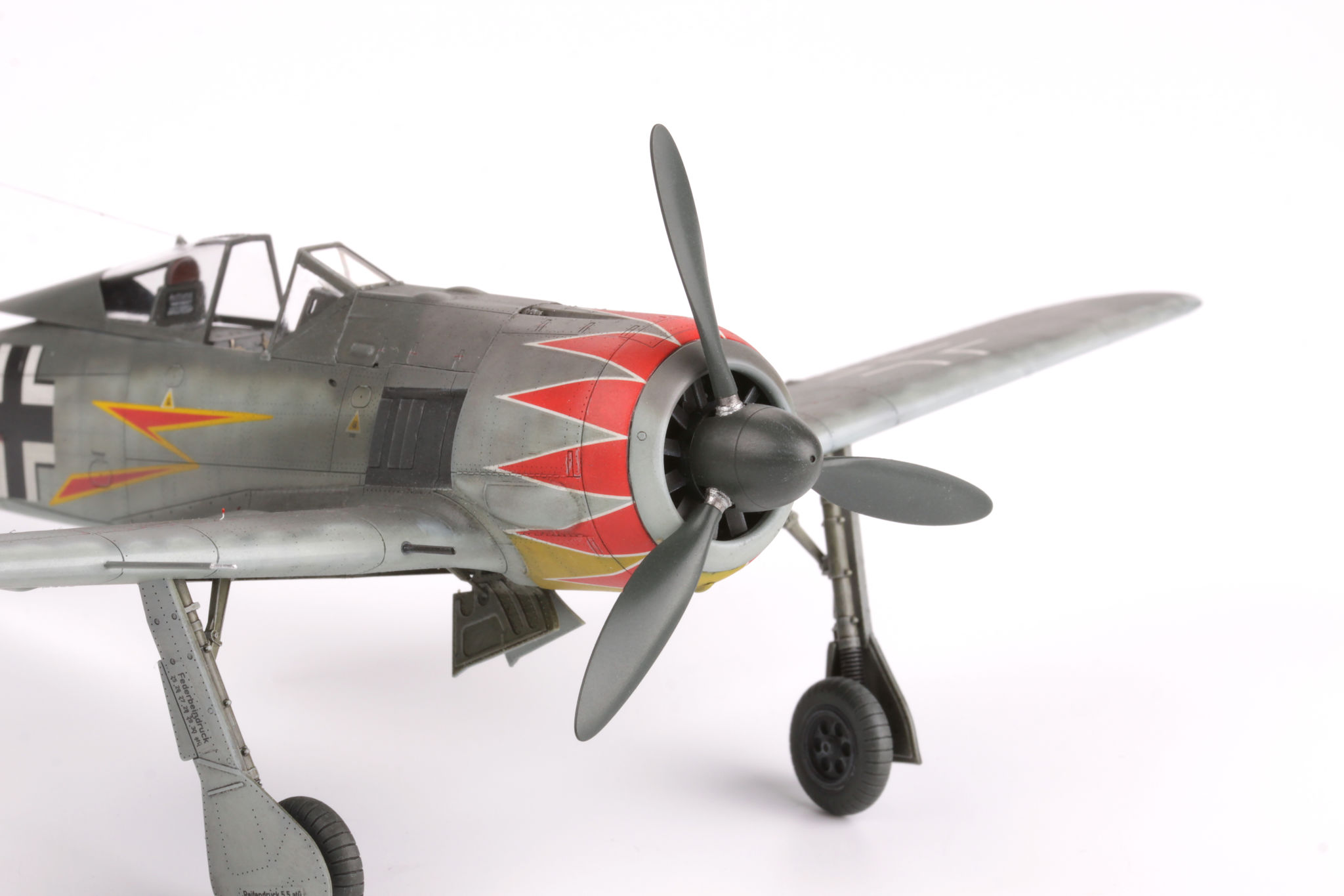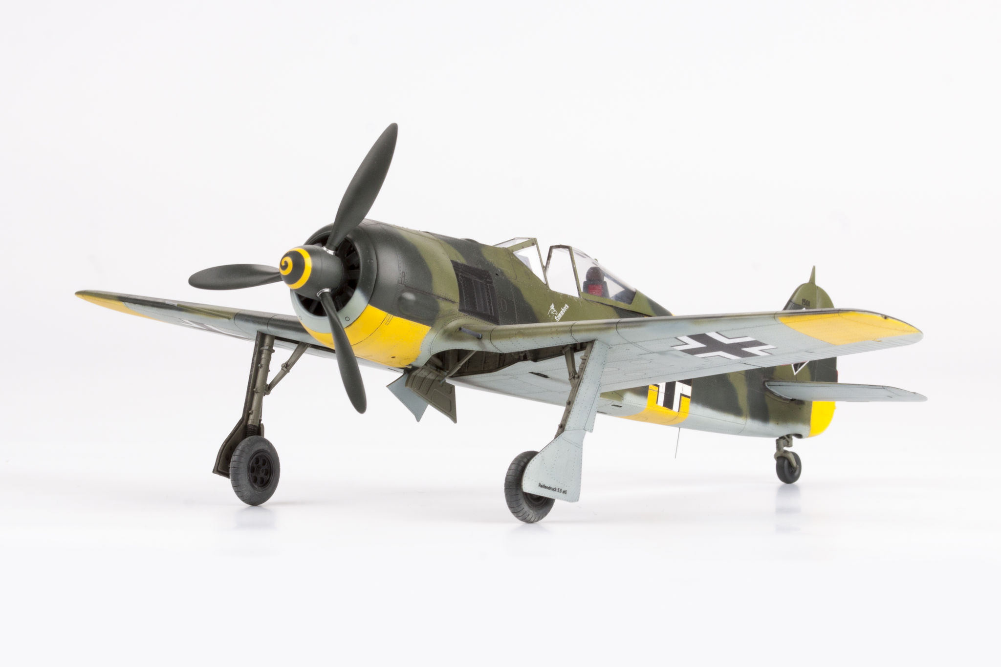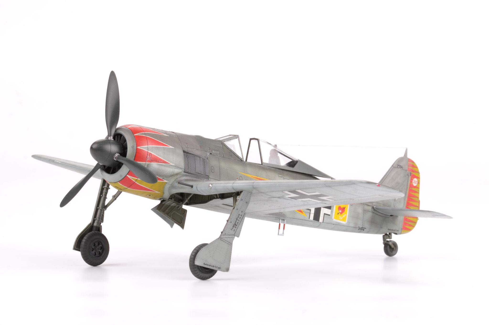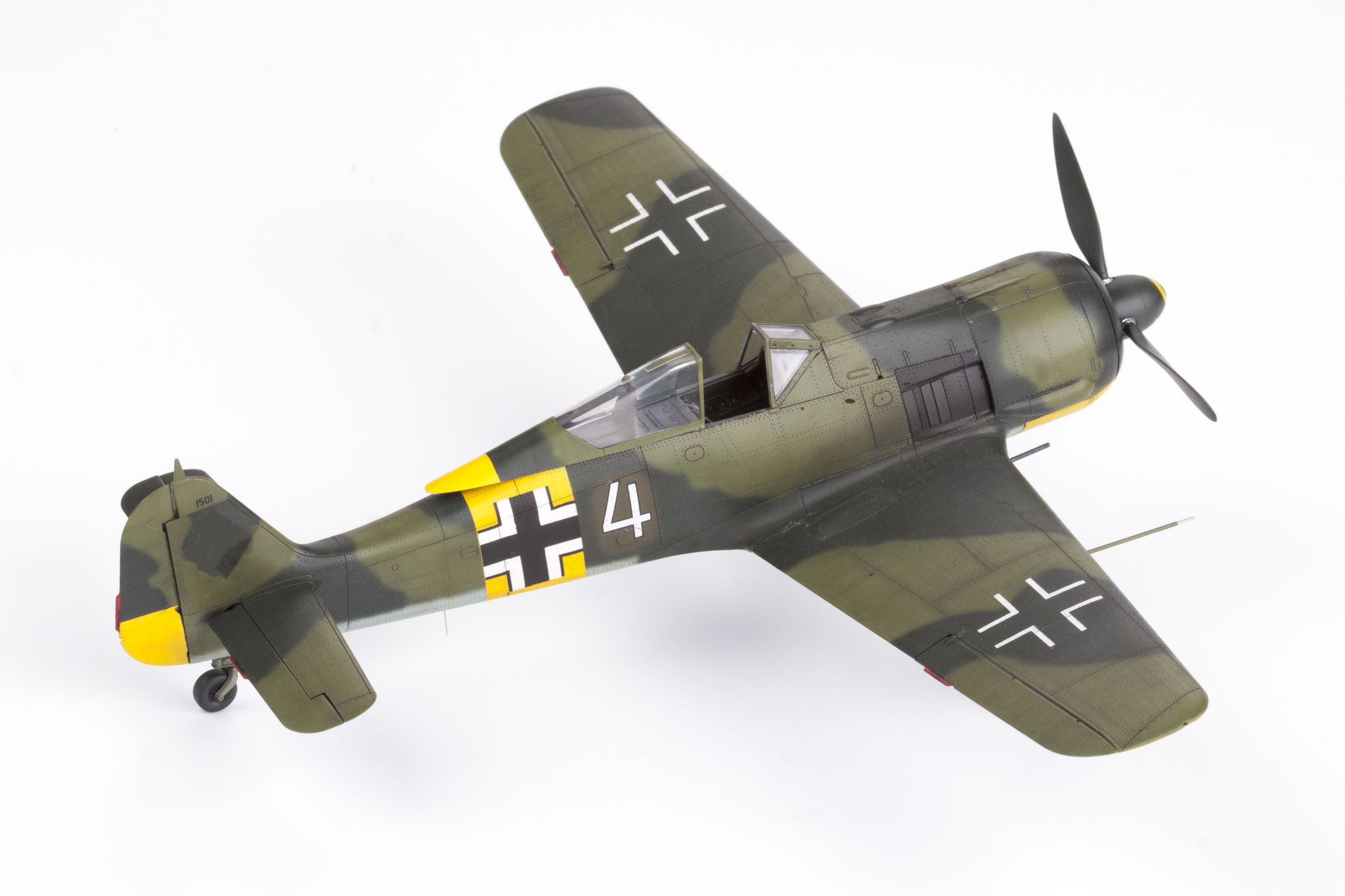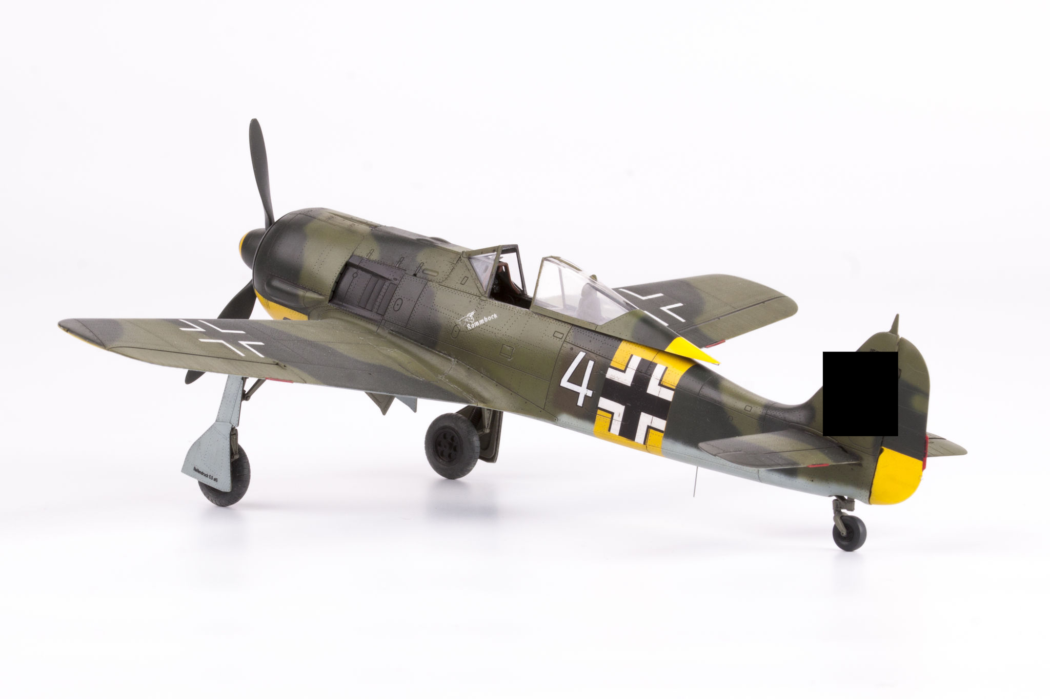 The Focke-Wulf Fw-190 is a German, single-engine, full-metal fighter aircraft with a covered cabin in the low wing design of the Second World War. The pilots considered the Fw-190 to be a better aircraft than the Messerschmitt Bf-109. A self-supporting low wing with a working Fw-190 coating was commissioned by the Luftfahrtministerium, assembled in the fall of 1937. Kurt Tank submitted two propulsion proposals - the first with a liquid-cooled Daimler-Benz DB 601 engine, and the second with the new BMW 139 radial engine. The latter was chosen, and the work started in the spring of 1938 was headed by Obering R. Blaser. The first prototype of the Fw-190V1 was ready in May 1939, and it was flown in Bremen on June 1, 1939 by Captain Hans Sander. The second prototype, the FW-190V2, armed with two MG131 and two MG17 machine guns - all 7.92 mm caliber, was flew in October 1939. To reduce aerodynamic drag, both were equipped with a tunnel air inlet in the propeller cap, but problems with overheating of the engine resulted in a return to the proven NACA shield design. Before the tests of these prototypes began for good, the decision was already made to replace the BMW 139 engine with a stronger, but longer and heavier BMW 801. It required many changes, strengthening the structure and moving the cabin back, which later became a source of problems with the center of gravity. The advantage was the removal of problems with exhaust gas permeation and overheating of the cabin interior due to its direct vicinity to the BMW 139 engine. The third and fourth prototypes were abandoned, and the Fw-190V5 with the new engine was completed at the beginning of 1940. Later, it received wings with a wingspan enlarged by one meter (from the original 9.5 m), which made it 10 km / h slower, but it increased the rate of climb and improved maneuverability. It was marked Fw-190V5g, and the variant with the shorter wing was Fw-190V5k. The first seven machines of the Fw-190A-0 information series had a short wing, the rest - a longer one. The first operational unit equipped with the Fw-190 - 6./JG 26 stationed at Le Bourget, declared its operational readiness in August 1941 and from the first meeting of the new fighter with the British Supermarine Spitfire, its advantage over them became apparent. During the war, a dozen or so versions of this great plane were created. The machines of the "A" version, along with a dozen or so modernizations, served as fighter planes. The versions marked "B" and "C" were only prototypes of high-altitude fighters intended for fighting strategic bombers, but they did not enter into serial production. The "D" variant, as the only one of the Fw-190s, was powered by the new 1750HP Jumo 213A engine and was the German response to the P-51 Mustang. The new engine extended the fuselage by several dozen centimeters. This variant also performed mainly hunting and high-altitude fighter tasks. Numerous variants of the "F" version were used as fighter-bombers as direct support of the battlefield. The "G" version played the same role as the "F" version, but had a greater range. During the entire war, over 20,000 copies of this one of the best fighters of World War II were produced. Technical data (version Fw-190A-8): length: 9m, wingspan: 10.51m, height: 3.95m, maximum speed: 656km / h, rate of climb: 15m / s, maximum range: 800km, maximum ceiling 11410m , armament: fixed-2 MG131 13mm machine guns and 4 MG151 20mm cannons (2 MG 151 / 20E cannons for the D-9 version). 3_edu82143_instruction_sheet.pdf