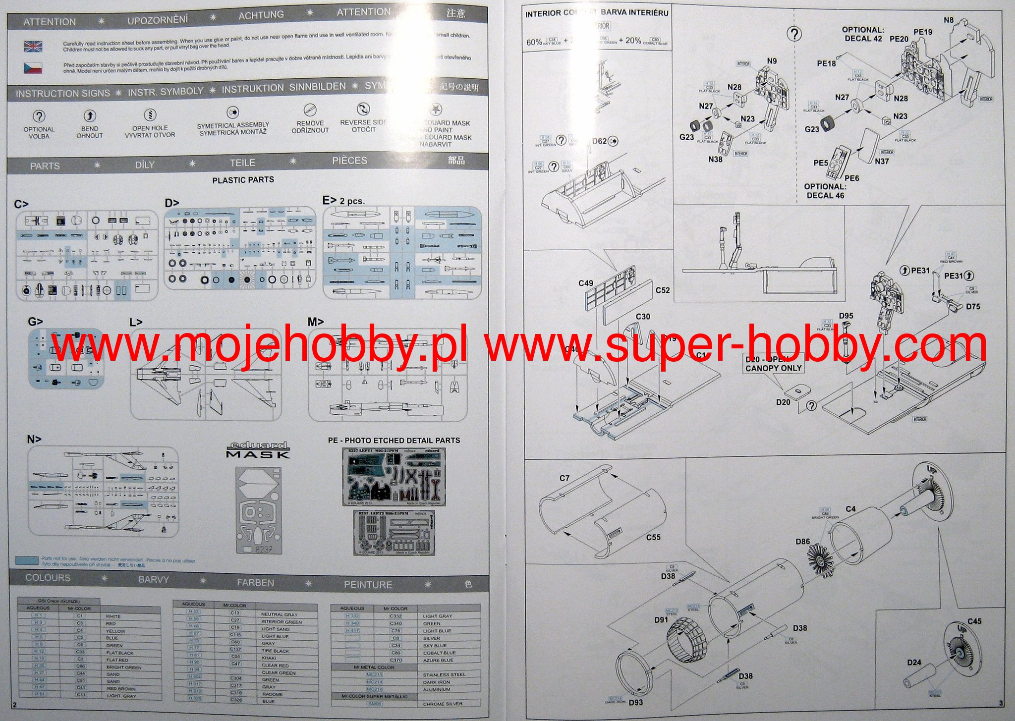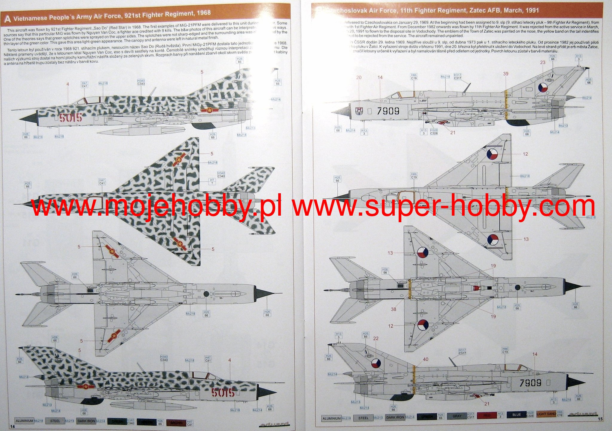 The Mikojan-Guriewicz MIG-21 (NATO: Fishbed) is a Soviet light fighter with a duralumin, half-shell structure, in a mid-wing design, with a delta blade with a 57-degree slope. The prototype flight took place on June 16, 1956. The prototype of the MIG 21 is considered to be the E-5 prototype powered by the RD-11 engine. After its flight, several other prototypes were created, which, incidentally, were breaking various international airspeed records. The experience gained from them was used to improve the E-5, and finally the aircraft was sent to mass production as the MIG-21F-13 in 1959. There are over a dozen basic versions in production, and along with various subversions, the number of MIG 21 types can be estimated at several dozen! The most important of them is the first mass-produced MIG-21F. It replaced the MIG-21PF version with the RP-21 radar and the R-11F2 engine. The next development version is the MiG-21R, i.e. a reconnaissance aircraft. Several training versions were also created, the first of which is the MiG-21U-400. The MIG-21 turned out to be a very successful design, with great performance, easy to pilot and cheap to produce. The quality of the construction is evidenced by the fact that in the 90s there were development versions of this aircraft, which was more than 30 years old. The machine was exported to all countries of the former Warsaw Pact and the entire multitude of Arab and African countries. The MIG-21 took part in most of the armed conflicts of the 1960-1980 period, including in the Vietnam War, in the Six Day War (1967), in the Iran-Iraq War (1980-1988). Technical data: length: 13.46m, wingspan: 7.15m, height: 4.1m, maximum speed: 2130km / h, climb speed: 120m / s, maximum range: 1100km, maximum ceiling 19000m, armament: fixed - single 23 mm GSz-23 cannon (M version), suspended - up to 2000 kg of cargo. 3_edu8237_instruction_sheet.pdf