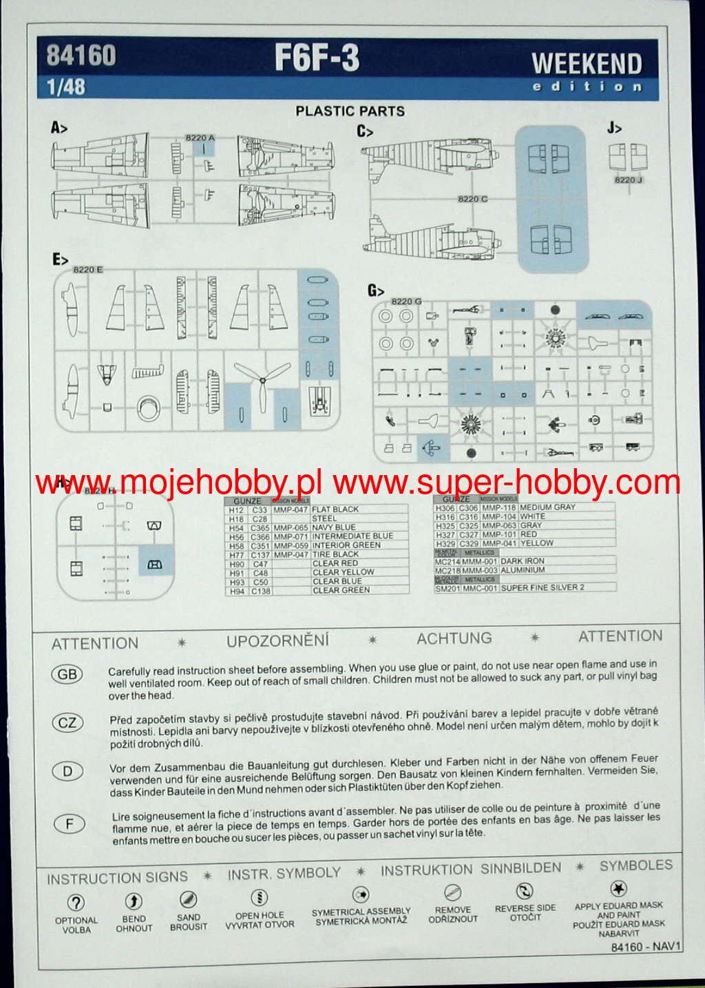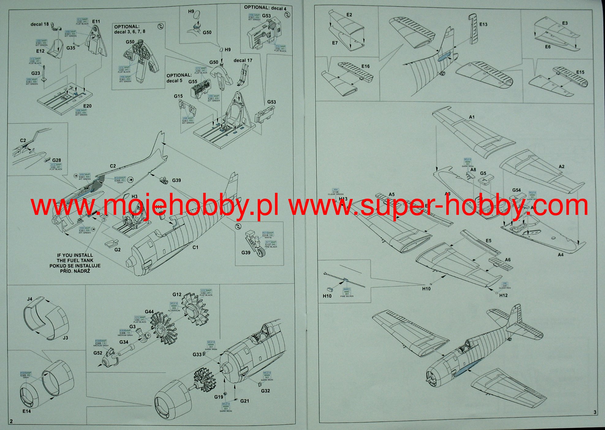 The Grumman F6 Hellcat is an American, single-engine, WWII, semi-shell fighter in a low wing design. The F6 Hellcat was developed as a development of the successful F4F design. When designing it, 18-month-long experience with the operation of F4F in the Pacific and numerous comments of pilots fighting on Wildcat airplanes was used. Structurally, the F6 Hellcat resembled its predecessor with one major change. A low wing system was used, which allowed the landing gear to be retracted into the lower center wing instead of into the fuselage. This increased the track width and the stability in motion on the ground. Additionally, the cockpit armor was used and the ammunition was increased. The U.S. Navy's evaluation of the Grumman proposal resulted in an order in June 1941 for four prototypes - from the XF6F-1 to the XF6F-4 - each with a different powertrain. The XF6F-1 flight took place a year after signing the contract, but due to the urgent need to strengthen the Wildcats (F4F), the same airframe was equipped with the most powerful of the available Pratt-Whitney R-2800-10 engines, thanks to which the plane made its next first flight, this time as the XF6F-3. Even before this second flight took place, Grumman was commissioned to implement the F6F-3 into production as the Hellcat. At this stage, the similarity of the F4F and F6F resulted in a reduction in the time needed to implement the machine into series production. The flight of the first such machine took place at the end of 1942, and shipments to the USS Essex began in January 1943. In August of the same year, the VF-5 squadron from the USS Yorktown was the first to use its Hellcats against the Japanese. The structure of the plane was entirely made of metal, connected with flush rivets, and the wings were folded with tips to facilitate hangar on the deck of aircraft carriers. Standard armament consisted of six 12.7 mm machine guns mounted in the nose of the wing. The hull and tail were of a classic design, differing from the F4F only in dimensions. The three-support undercarriage was fully retractable by means of a hydraulic system, as was the hook for shortening the landing run. The spacious pilot's cabin was raised high above the plane of the wings. The production of all versions of the F6 exceeded 12,200 copies, and its intensity was so high that it was possible to replace the F4F used so far with them very quickly. Technical data (for the F6F-5 version): Top speed: 620 km / h, climb speed: 14 m / s, practical ceiling 11,400 m, maximum range: 1,755 km, armament: fixed - six 12.7mm Browning machine guns Suspended - up to 1800 kg of bombs or an additional fuel tank. 3_edu84160_instruction_sheet.pdf