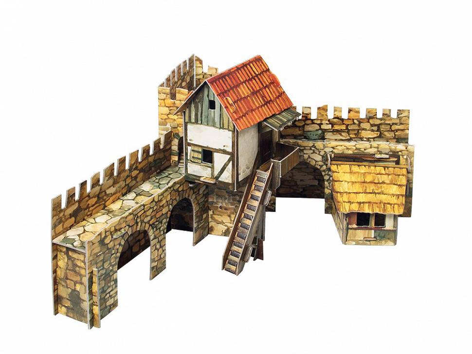 На краю площади неподалеку от городской стены бродячие актеры возвели деревянный помост для выступлений. Все уже почти готово, осталось лишь настроить музыкальные инструменты. Зрители обступили помост и терпеливо ждут начала представления. Для рассматривания комнат у пристроенных к стене домиков поднимаются крыши, а угловая четырехугольная башня раскрывается пополам. В наборе 17 фигурок, среди которых музыканты, жонглеры, силачи, зрители и прохожие и другие обитатели средневекового города. Кроме этого в комплекте помост для выступлений, крытая повозка и клетка с медведем. Для сборки модели не понадобятся режущие инструменты или клей. Детали уже вырезаны и нужно просто вынуть их из листа картона и соединить между собой. Количество деталей - 27+17 Сложность сборки - 2 Размер - 34х19х16 см