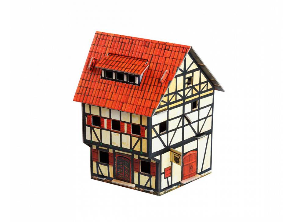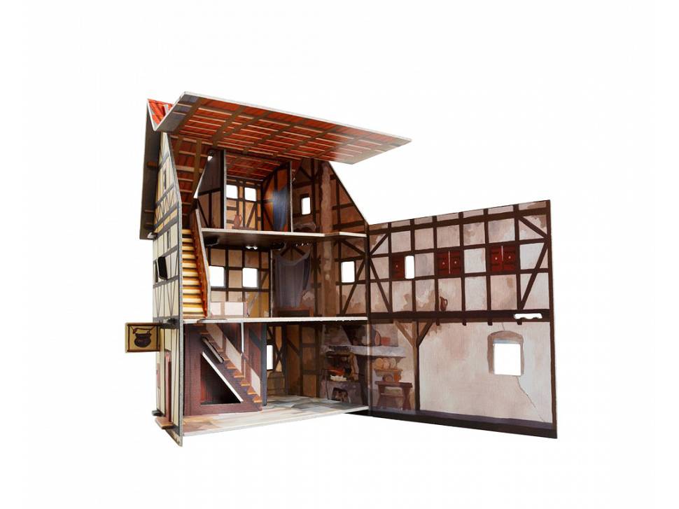 Таверна сборная игрушка из серии Средневековый город. Каждый набор из этой серии является самодостаточным игровым объектом, но в тоже время их можно объединять в один большой город. Интересно собирать, интересно играть. Фигурки средневековых жителей есть в каждом наборе серии "Средневековый город". Они отлично подходят именно для этого набора, а также подходят к другим наборам этой серии. Большое здание придорожной таверны готово дать пищу и приют любому путнику. В нижней части дома можно выпить молока и лимонада, или съесть что-нибудь, приготовленное тут же на большом очаге, а для желающих переночевать есть отдельный вход. В верхних этажах можно отлично выспаться, зарывшись в свежее сено, кучами лежащее прямо на полу. В наборе 12 фигурок, среди которых путник и его вьючный осел, посетители таверны, повар, торговка, едоки и другие обитатели средневекового города. Для сборки модели не понадобятся режущие инструменты или клей. Детали уже вырезаны и нужно просто вынуть их из листа картона и соединить между собой. Количество деталей - 13 Сложность сборки - 1 Размер - 14х19х12 см