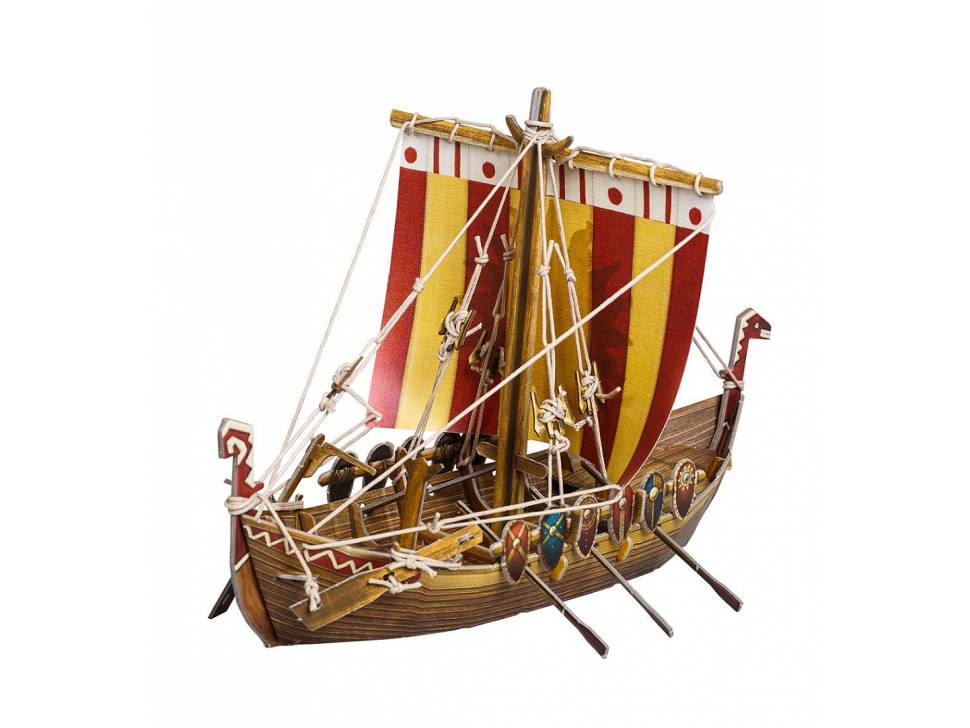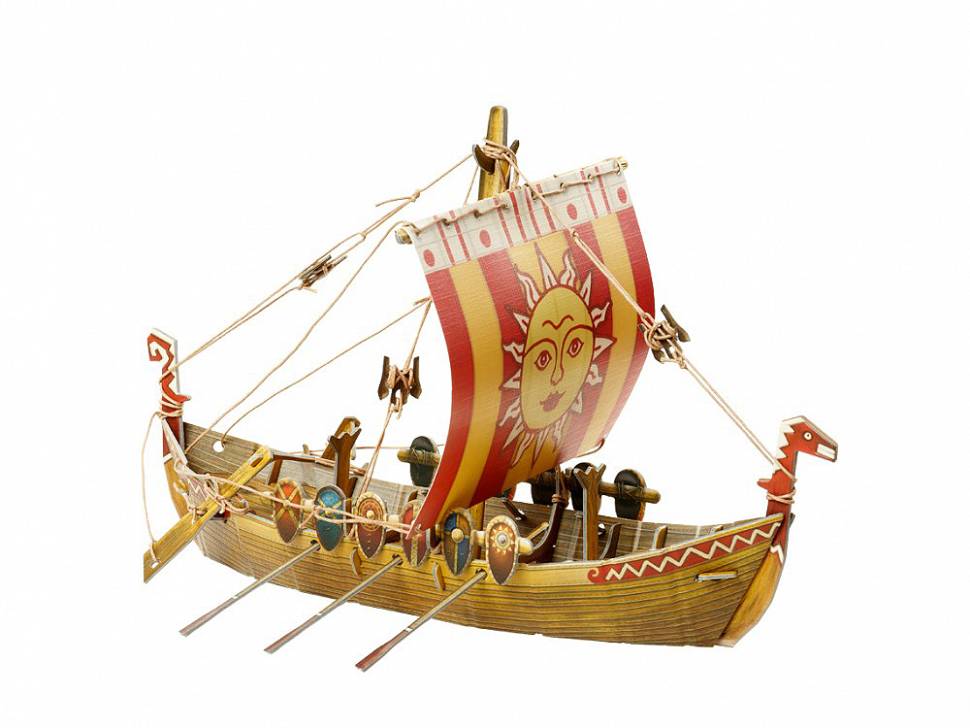 Ладья большое одномачтовое судно с прямоугольным парусом, пригодное для длительных переходов. Использовалась для рыбного промысла и торговых перевозок, а также и для военных действий на морях, озерах и реках. Двигалась под парусом и на веслах. Остроконечное в носовой и кормовой части судно, без палубного настила, было типичным для многих народов средневековой Европы. Подобное судно с небольшими отличиями в пропорциях и размерах можно было встретить на реках и в прибрежных водах всех стран, выходящих к берегам Балтийского и северных морей. Мачта позволяла при попутном ветре поднимать один четырехугольный парус, а в остальное время двигаться на веслах. На корме располагалось рулевое весло. Гребцы заслонялись от неприятельских стрел собственными боевыми щитами, поставленными вдоль бортов, а в случае непогоды или от жаркого солнца над их головами устраивался полотняный навес. Все перевозимые грузы, военная добыча, запасы пищи, питьевой воды и прочее складывалось под открытым небом, прямо на дне ладьи. Фигурки мореходов включены в набор. Сочетание в модели корабля материалов разного характера не только обогащает впечатление от модели, но и делает сборку более сложной. При переходе на новый материал нужно приспосабливаться к его свойствам, менять приемы работы. Это разнообразие делает сборку еще интересней. Для сборки модели не понадобятся режущие инструменты или клей. Детали уже вырезаны и нужно просто вынуть их из листа картона и соединить между собой Количество деталей - 31 Сложность сборки - 3 Размер - 29х18х15 см