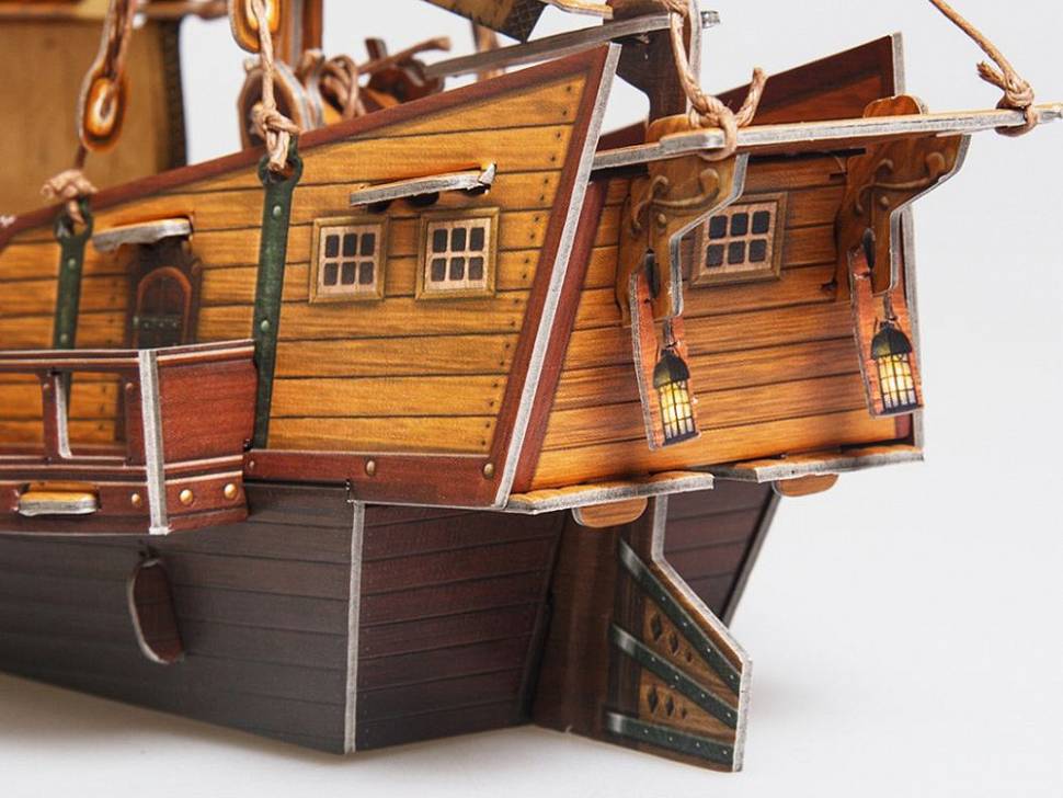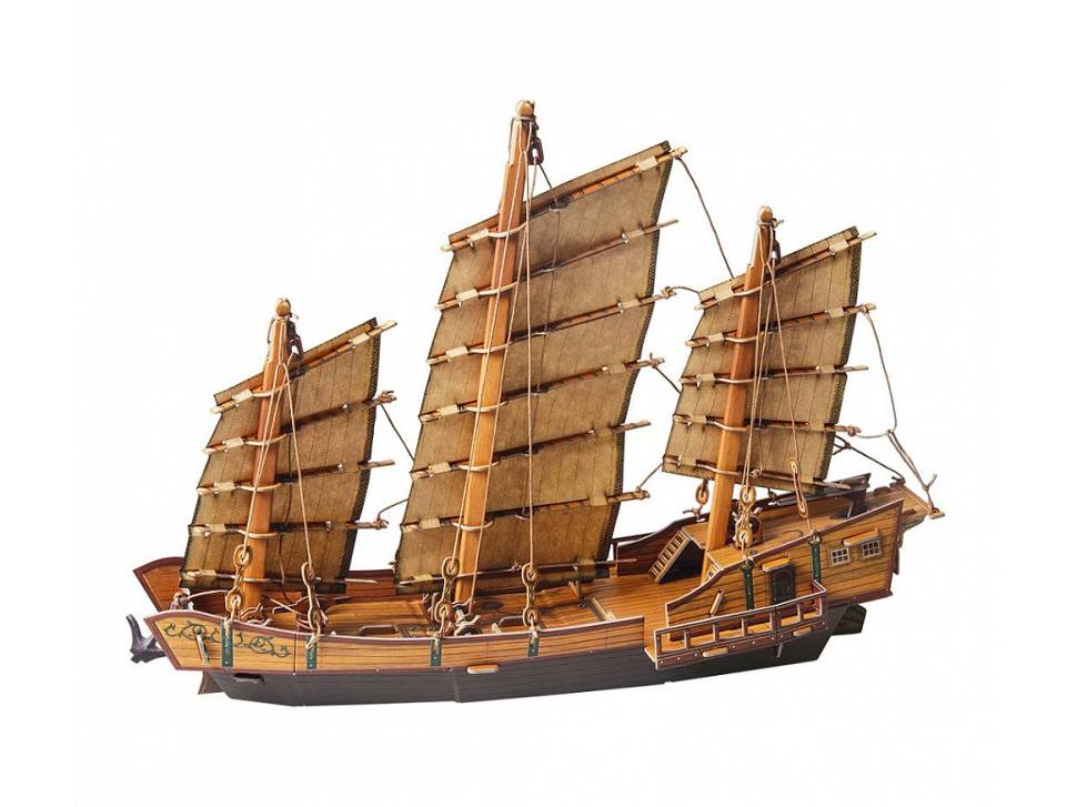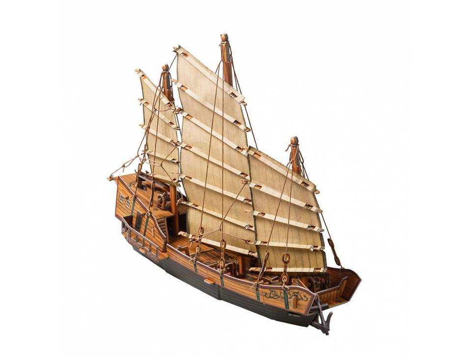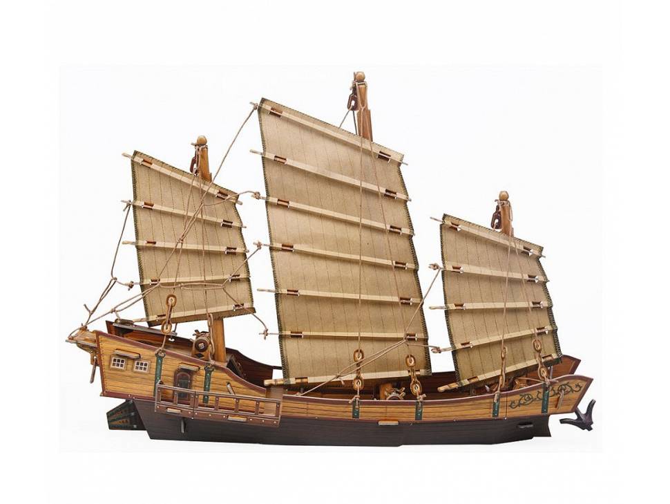 Джонка традиционное китайское парусное судно, известное уже более двух тысячелетий. Джонки применялись не только как промысловое или транспортное судно, но и в военных целях. Вследствие использования джонок для дальних морских переходов, они вошли в употребление по всей Юго-Восточной Азии. Джонки разнообразны по размерам и количеству мачт. Для корпуса джонки характерны приподнятые нос и корма. Паруса из циновок усилены несколькими бамбуковыми рейками. При необходимости размер паруса уменьшают, подтягивая нижние рейки к верхним. Сочетание в модели корабля материалов разного характера не только обогащает впечатление от модели, но и делает сборку более сложной. При переходе на новый материал нужно приспосабливаться к его свойствам, менять приемы работы. Это разнообразие делает сборку еще интересней. Для сборки модели не понадобятся режущие инструменты или клей. Детали уже вырезаны и нужно просто вынуть их из листа картона и соединить между собой. Количество деталей - 47 Сложность сборки - 4 Размер - 34.5х24х10.5 см