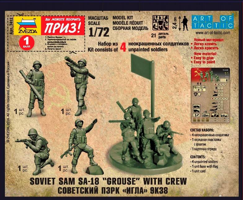 Историческая справка: Советский, а сегодня российский Переносной Зенитно-Ракетный Комплекс (ПЗРК) Игла, предназначен для поражения низколетящих воздушных целей в условиях воздействия ложных тепловых помех. Был принят на вооружение ВДВ в 1983 году. Использование набора в HotWar: ПЗРК Игла в игре является средством эффективной борьбы с вражеской авиацией. Низкая стоимость и большое количество кубиков сводит на нет все минусы отряда. А минусов у него много: уязвимость перед всеми видами войск, слабая атака по пехотным отрядам, небольшое количество боеприпасов. Состав набора: 4 неокрашенных солдатика отрядная подставка с флагом игровая карточка отряда инструкция по сборке Комиссионный товар