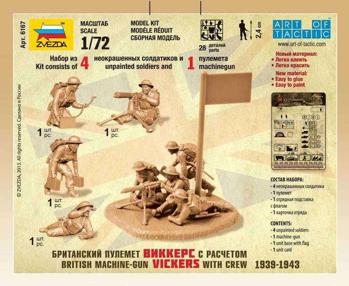 Пулемет "Виккерс" с расчетом. Готовая композиция смотрится великолепно!Находка для любителей диорам и коллекционеров! Игроки же по достоинству оценят отличную огневую мощь пулемета. Качество отливок и детализация фигур как всегда на высоте. Историческая справка: Англия была первой страной, оценивший по достоинству автоматическое оружие. Они первыми приняли на вооружение пулемёт. Англичане быстро поняли, что самое главное в оружие это универсальность, поэтому выбирали образцы оружия одной системы под один патрон. Их выбором стал пулемёт фирмы Виккерс, принятый на вооружение в 1912 году. Виккерс, как и Максим в советской армии, служил верой и правдой, и был снят с вооружения далеко после войны. Пулемёт был не прихотлив, удобен и прост в производстве. С вооружения Виккерс был снят только в 1960 году. Использование пулемета в Art of Tactic: В игре пулемёт является мощным противопехотным средством. Отлично справляется с любыми пехотными отрядами противника. Бесценен в обороне. Минусами являются пехотные данные отряда против бронетехники он не пригоден. Комиссионный товар