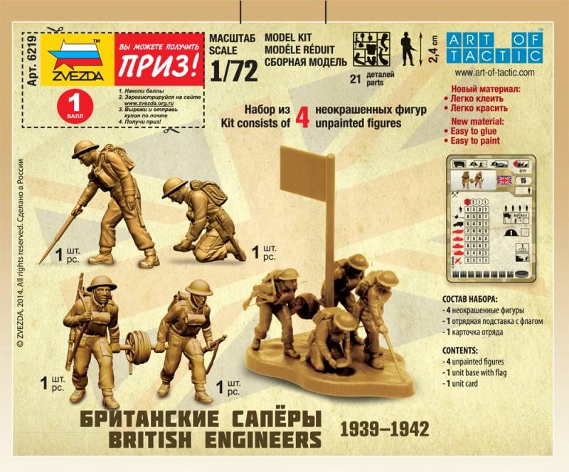 Историческая справка: Сапёры британской армии ведут свою родословную из окопов Первой Мировой Войны. Позиции на всех фронтах были изрыты траншеями, заставлены колючей проволокой и противотанковыми ежами. Вторую Мировую Войну британские сапёрные части встретили готовыми и боеспособными, однако, из-за просчётов командования, вместо позиционной войны, разразился блицкриг немецкой армии. Не смотря на большие потери в начале войны во Франции, британские сапёры действовали очень эффективно и не раз отмечались наградами и похвалой высшего командования. Использование мини-набора в Art of Tactic: В игре сапёрные роты выполняют много полезной работы: наводят мосты, вырубают просеки, подрывают доты и многое другое. Сапёрная рота жизненно необходима при наличии хорошо укреплённой линии противника. Минусами отряда являются пехотные слабости танкобоязнь и уязвимость в чистом поле. В остальном это отличный отряд на поле сражения. Комиссионный товар