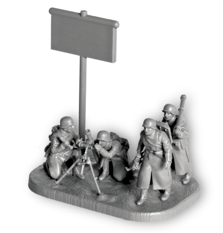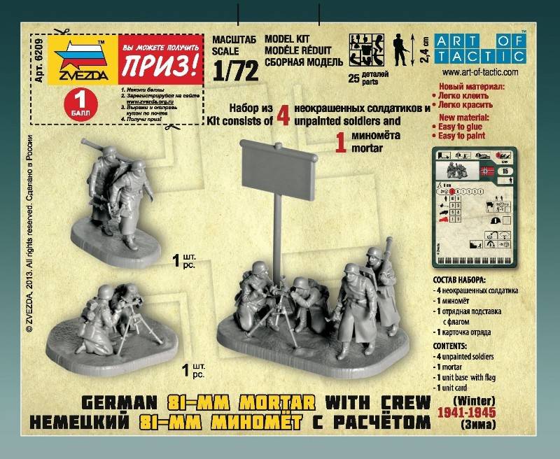 Немецкий 81-мм миномет в годы второй мировой войны зарекомендовал себя как надежное оружие поддержки пехоты. Модель интегрируется в игровую систему Art of Tactic. Характеристики набора моделируют реальные возможности отряда на поле боя. Высокая детализация, соблюдение масштаба, точность, простая сборка без использования клея все это мини-наборы Art of Tactic и немецкий 81-мм миномет в частности. Историческая справка: Немецкая артиллерия во время первой зимы на восточном фронте пострадала больше всех. Снаряды остались где-то далеко, белой краски было мало, а самое главное русская авиация захватила господство в воздухе. Из-за снежных заносов, стало невозможно маневрировать артиллерийскими частями, но зато плотность орудий на участке прорыва сильно возросла. Не смотря на всё вышеперечисленное, немецкая артиллерия не потеряла свою боеспособность и являлась грозной силой на поле боя. Использование миномета в Art of Tactic: В игре минометные расчеты смогут поддержать огнем отряды как в обороне, так и в наступлении. Главной особенностью минометных расчетов в игре является то, что они могут вести стрельбу по противнику с закрытых позиций, оставаясь незамеченными. Комиссионный товар