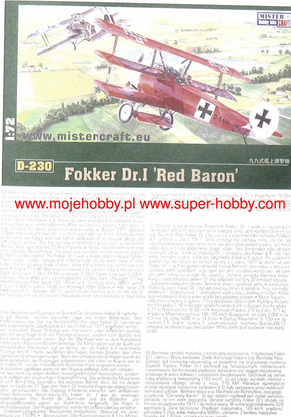 Note: Comany Mistercraft frequently changes, without any notice, the decals that come with the model, so they may differ from the photos and descriptions on our website. If you need a specific version, please let us know about that by entering the appropriate notice in the comments field when placing the order. German Fokker Dr. I triple-lobe fighter plane from the First World War. The work of Anthony Fokker and Reinhold Plat. The plane was a German response to the appearance of the British Sopwith Triplane fighter. The Fokker Dr.I was characterized by fantastic maneuverability, a very high rate of climb, and achieved a decisive advantage in wheel combat with biplane planes. However, it had a low top speed (165 km / h), which was partly also due to the use of a weak 110 HP engine. The first pre-production vehicles (marked with the symbol V.5) were tested by eminent German pilots: Werner Voss and Manfred von Richthofen, nicknamed the "Red Baron". It was the latter who made this model of aircraft famous, winning many victories on it. Serial Fokker Dr. I planes served at the front from October 1917. until the end of the war. A total of 320 units were produced. Technical data: Top speed: 165 km / h; climb speed 5.7 m / s, maximum ceiling 6095 m, armament: two 7.92 mm Spandau machine guns, firing through a propeller.